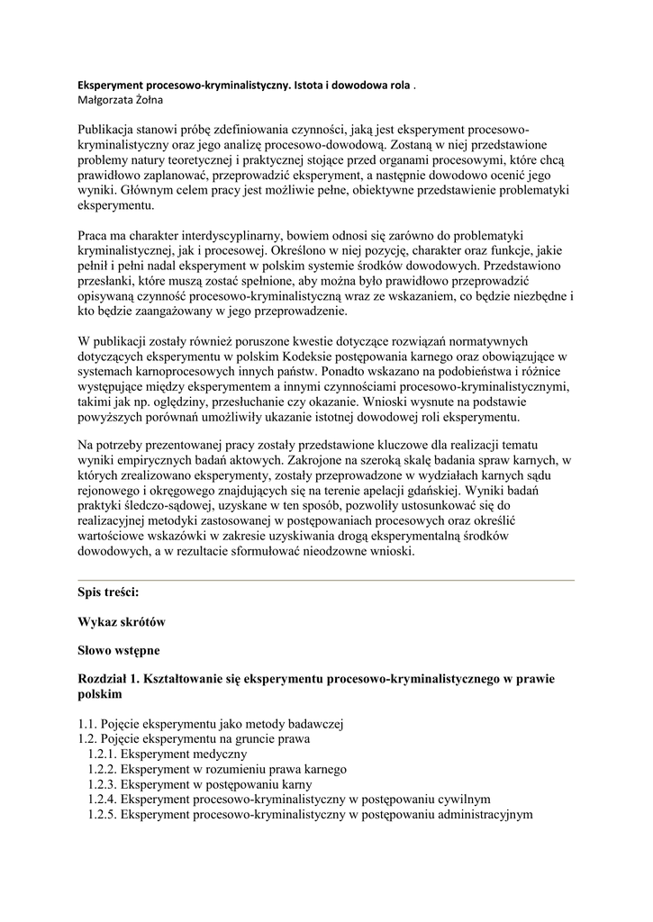 Eksperyment procesowo-kryminalistyczny. Istota i dowodowa rola . Małgorzata Żołna Publikacja stanowi próbę zdefiniowania czynności, jaką jest eksperyment procesowokryminalistyczny oraz jego analizę procesowo-dowodową. Zostaną w niej przedstawione problemy natury teoretycznej i praktycznej stojące przed organami procesowymi, które chcą prawidłowo zaplanować, przeprowadzić eksperyment, a następnie dowodowo ocenić jego wyniki. Głównym celem pracy jest możliwie pełne, obiektywne przedstawienie problematyki eksperymentu. Praca ma charakter interdyscyplinarny, bowiem odnosi się zarówno do problematyki kryminalistycznej, jak i procesowej. Określono w niej pozycję, charakter oraz funkcje, jakie pełnił i pełni nadal eksperyment w polskim systemie środków dowodowych. Przedstawiono przesłanki, które muszą zostać spełnione, aby można było prawidłowo przeprowadzić opisywaną czynność procesowo-kryminalistyczną wraz ze wskazaniem, co będzie niezbędne i kto będzie zaangażowany w jego przeprowadzenie. W publikacji zostały również poruszone kwestie dotyczące rozwiązań normatywnych dotyczących eksperymentu w polskim Kodeksie postępowania karnego oraz obowiązujące w systemach karnoprocesowych innych państw. Ponadto wskazano na podobieństwa i różnice występujące między eksperymentem a innymi czynnościami procesowo-kryminalistycznymi, takimi jak np. oględziny, przesłuchanie czy okazanie. Wnioski wysnute na podstawie powyższych porównań umożliwiły ukazanie istotnej dowodowej roli eksperymentu. Na potrzeby prezentowanej pracy zostały przedstawione kluczowe dla realizacji tematu wyniki empirycznych badań aktowych. Zakrojone na szeroką skalę badania spraw karnych, w których zrealizowano eksperymenty, zostały przeprowadzone w wydziałach karnych sądu rejonowego i okręgowego znajdujących się na terenie apelacji gdańskiej. Wyniki badań praktyki śledczo-sądowej, uzyskane w ten sposób, pozwoliły ustosunkować się do realizacyjnej metodyki zastosowanej w postępowaniach procesowych oraz określić wartościowe wskazówki w zakresie uzyskiwania drogą eksperymentalną środków dowodowych, a w rezultacie sformułować nieodzowne wnioski. Spis treści: Wykaz skrótów Słowo wstępne Rozdział 1. Kształtowanie się eksperymentu procesowo-kryminalistycznego w prawie polskim 1.1. Pojęcie eksperymentu jako metody badawczej 1.2. Pojęcie eksperymentu na gruncie prawa 1.2.1. Eksperyment medyczny 1.2.2. Eksperyment w rozumieniu prawa karnego 1.2.3. Eksperyment w postępowaniu karny 1.2.4. Eksperyment procesowo-kryminalistyczny w postępowaniu cywilnym 1.2.5. Eksperyment procesowo-kryminalistyczny w postępowaniu administracyjnym 1.2.6. Eksperyment procesowo-kryminalistyczny w postępowaniu w sprawach o wykroczenia i w postępowaniu karnoskarbowym 1.2.7. Eksperyment procesowo-kryminalistyczny w postępowaniu w sprawach nieletnich 1.3. Rys historyczny regulacji eksperymentu procesowo-kryminalistycznego w prawie polskim Rozdział 2. Przygotowanie i realizacja eksperymentu procesowo-kryminalistycznego 2.1. Przesłanki eksperymentu procesowo-kryminalistycznego 2.2. Przygotowanie eksperymentu 2.2.1. Określenie celu i rodzaju eksperymentu 2.2.2. Wyznaczenie czasu i miejsca przeprowadzenia eksperymentu 2.2.3. Osoby biorące udział w eksperymencie procesowo-kryminalistycznym 2.2.4. Przygotowanie przedmiotów oraz środków technicznych niezbędnych przy przeprowadzeniu eksperymentu 2.2.5. Opracowanie planu czynności 2.3. Realizacja eksperymentu Rozdział 3. Dokumentacja eksperymentu procesowo-kryminalistycznego 3.1. Protokół eksperymentu 3.2. Dokumentacja graficzna 3.3. Fotografia 3.4. Zapis obrazu i dźwięku Rozdział 4. Eksperyment procesowo-kryminalistyczny w ustawodawstwach karnoprocesowych wybranych krajów europejskich 4.1. Uwagi ogólne 4.2. Anglia 4.3. Niemcy 4.4. Czechy 4.5. Rosja 4.6. Włochy Rozdział 5. Eksperyment na tle niektórych innych czynności procesowokryminalistycznych 5.1. Uwagi ogólne 5.2. Eksperyment procesowo-kryminalistyczny a wizja lokalna 5.3. Eksperyment procesowo-kryminalistyczny a oględziny 5.4. Eksperyment procesowo-kryminalistyczny a przesłuchanie 5.5. Eksperyment procesowo-kryminalistyczny a okazanie 5.6. Eksperyment procesowo-kryminalistyczny a ekspertyza 5.7. Wartość dowodowa wyników eksperymentu 5.8. Wpływ wyników eksperymentu na tok postępowania dowodowego Rozdział 6. Eksperyment procesowo-kryminalistyczny w świetle badań własnych 6.1. Cel, zakres i przedmiot badań aktowych 6.2. Zastosowanie eksperymentu w postępowaniu przygotowawczym 6.3. Zastosowanie eksperymentu w postępowaniu jurysdykcyjnym 6.4. Wyniki badań aktowych Zakończenie Orzecznictwo Sądu Najwyższego, Naczelnego Sądu Administracyjnego oraz sądów apelacyjnych Wykaz aktów prawnych Wykaz stron internetowych Wykaz badanych spraw karnych Wykaz tabel, wykresów i rycin Aneks 1. Protokoły eksperymentu procesowo-kryminalistycznego 2. Protokół wizji lokalnej 3. Szkice sytuacyjne 4. Fotografie Bibliografia