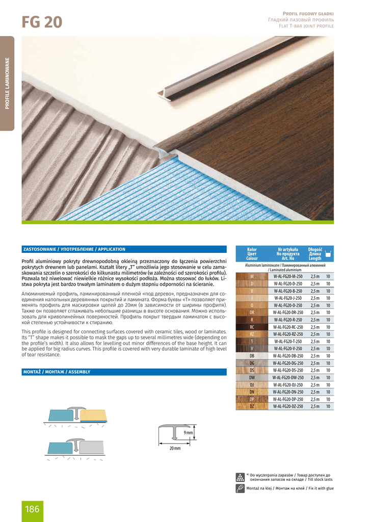 Profil fugowy gładki Гладкий пазовый профиль Flat T-bar joint profile PROFILE LAMINOWANE FG 20 ZASTOSOWANIE / УПОТРЕБЛЕНИЕ / APPLICATION Profil aluminiowy pokryty drewnopodobną okleiną przeznaczony do łączenia powierzchni pokrytych drewnem lub panelami. Kształt litery „T” umożliwia jego stosowanie w celu zamaskowania szczelin o szerokości do kilkunastu milimetrów (w zależności od szerokości profilu). Pozwala też niwelować niewielkie różnice wysokości podłoża. Można stosować do łuków. Listwa pokryta jest bardzo trwałym laminatem o dużym stopniu odporności na ścieranie. Алюминиемый профиль, ламинированный пленкой «под дерево», предназначен для соединения напольных деревянных покрытий и ламината. Форма буквы «Т» позволяет применять профиль для маскировки щелей до 20мм (в зависимости от ширины профиля). Также он позволяет сглаживать небольшие разницы в высоте основания. Можно использовать для криволинейных поверхностей. Профиль покрыт твердым ламинатом с высокой степенью устойчивости к стиранию. This profile is designed for connecting surfaces covered with ceramic tiles, wood or laminates. Its “T” shape makes it possible to mask the gaps up to several millimetres wide (depending on the profile’s width). It also allows for levelling out minor differences of the base height. It can be applied for big radius curves. This profile is covered with very durable laminate of high level of tear resistance. MONTAŻ / МОНТАЖ / ASSEMBLY Kolor Цвет Colour Nr artykułu No продукта Art. No Długość Длина Length ,Aluminium laminowane / Ламинированный алюминий / Laminated aluminium M D B J O DR R RC RZ T V DB DG DS DW DJ DN DP DZ W-AL-FG20-M-250 W-AL-FG20-D-250 W-AL-FG20-B-250 W-AL-FG20-J-250 W-AL-FG20-O-250 W-AL-FG20-DR-250 W-AL-FG20-R-250 W-AL-FG20-RC-250 W-AL-FG20-RZ-250 W-AL-FG20-T-250 W-AL-FG20-V-250 W-AL-FG20-DB-250 W-AL-FG20-DG-250 W-AL-FG20-DS-250 W-AL-FG20-DW-250 W-AL-FG20-DJ-250 W-AL-FG20-DN-250 W-AL-FG20-DP-250 W-AL-FG20-DZ-250 2,5 m 2,5 m 2,5 m 2,5 m 2,5 m 2,5 m 2,5 m 2,5 m 2,5 m 2,5 m 2,5 m 2,5 m 2,5 m 2,5 m 2,5 m 2,5 m 2,5 m 2,5 m 2,5 m 10 10 10 10 10 10 10 10 10 10 10 10 10 10 10 10 10 10 10 9 mm 20 mm *)Do wyczerpania zapasów / Товар доступен до окончания запасов на складе / Till stock lasts Montaż na klej / Монтаж на клей / Fix it with glue 186