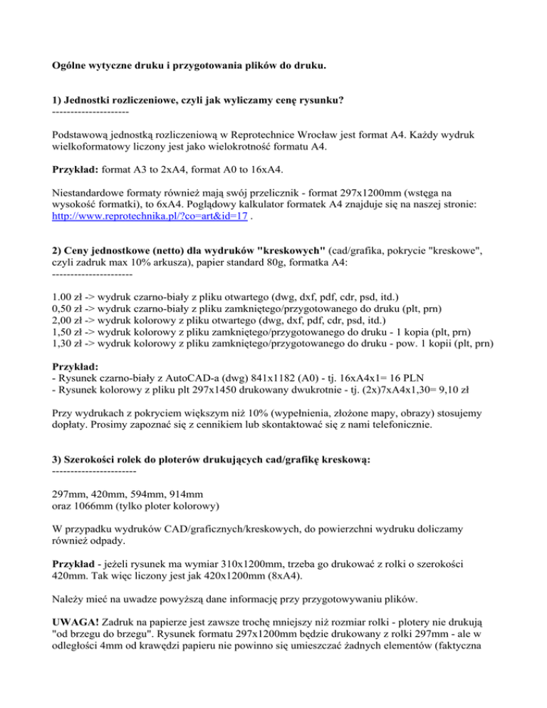 Ogólne wytyczne druku i przygotowania plików do druku. 1) Jednostki rozliczeniowe, czyli jak wyliczamy cenę rysunku? --------------------Podstawową jednostką rozliczeniową w Reprotechnice Wrocław jest format A4. Każdy wydruk wielkoformatowy liczony jest jako wielokrotność formatu A4. Przykład: format A3 to 2xA4, format A0 to 16xA4. Niestandardowe formaty również mają swój przelicznik - format 297x1200mm (wstęga na wysokość formatki), to 6xA4. Poglądowy kalkulator formatek A4 znajduje się na naszej stronie: http://www.reprotechnika.pl/?co=art&id=17 . 2) Ceny jednostkowe (netto) dla wydruków "kreskowych" (cad/grafika, pokrycie "kreskowe", czyli zadruk max 10% arkusza), papier standard 80g, formatka A4: ---------------------1.00 zł -> wydruk czarno-biały z pliku otwartego (dwg, dxf, pdf, cdr, psd, itd.) 0,50 zł -> wydruk czarno-biały z pliku zamkniętego/przygotowanego do druku (plt, prn) 2,00 zł -> wydruk kolorowy z pliku otwartego (dwg, dxf, pdf, cdr, psd, itd.) 1,50 zł -> wydruk kolorowy z pliku zamkniętego/przygotowanego do druku - 1 kopia (plt, prn) 1,30 zł -> wydruk kolorowy z pliku zamkniętego/przygotowanego do druku - pow. 1 kopii (plt, prn) Przykład: - Rysunek czarno-biały z AutoCAD-a (dwg) 841x1182 (A0) - tj. 16xA4x1= 16 PLN - Rysunek kolorowy z pliku plt 297x1450 drukowany dwukrotnie - tj. (2x)7xA4x1,30= 9,10 zł Przy wydrukach z pokryciem większym niż 10% (wypełnienia, złożone mapy, obrazy) stosujemy dopłaty. Prosimy zapoznać się z cennikiem lub skontaktować się z nami telefonicznie. 3) Szerokości rolek do ploterów drukujących cad/grafikę kreskową: ----------------------297mm, 420mm, 594mm, 914mm oraz 1066mm (tylko ploter kolorowy) W przypadku wydruków CAD/graficznych/kreskowych, do powierzchni wydruku doliczamy również odpady. Przykład - jeżeli rysunek ma wymiar 310x1200mm, trzeba go drukować z rolki o szerokości 420mm. Tak więc liczony jest jak 420x1200mm (8xA4). Należy mieć na uwadze powyższą dane informację przy przygotowywaniu plików. UWAGA! Zadruk na papierze jest zawsze trochę mniejszy niż rozmiar rolki - plotery nie drukują "od brzegu do brzegu". Rysunek formatu 297x1200mm będzie drukowany z rolki 297mm - ale w odległości 4mm od krawędzi papieru nie powinno się umieszczać żadnych elementów (faktyczna szer. zadruku jest w tym przypadku ok. 289mm). Takie same marginesy występują na każdej z rolek. Polecamy przygotowywać więc rysunki z podwójną ramką, zewnętrzną np. na rozmiar rolki (np. 297mm) i wewnętrzną, mniejszą o kilka milimetrów. Ta zewnętrzna jest niedrukowalna i wyznacza jedynie linie cięcia. 4) Wydruki fotograficzne: -----------------------Rozmiary (szerokości) rolek papieru do wydruków fotograficznych: 609mm, 914mm, 1066mm Przy wydrukach fotograficznych kolorowych/w szarościach na ploterach fotograficznych najlepiej przygotowywać plik w formacie tiff (bez warstw, bez kompresji) lub jpg (najwyższa jakość) w przestrzeni kolorów rgb (aczkolwiek jeżeli plik był przygotowywanywany w cmyk-u, proszę tak zostawić – my go dostosujemy). Parametry rozdzielczości powinny być zachowane w granicach 250-400dpi w rzeczywistym drukowanym formacie (np. tiff, 100x70cm, 300dpi). Jest to gwarancja najwyższej jakości. Oczywiście nie ma najmniejszego sensu podbijać "słabych" obrazów do powyższych wartości DPI, ponieważ nie polepszy to w żaden sposób drukowanego pliku (tylko niepotrzebnie zwiększy rozmiar). Papiery fotograficzne, na których najczęściej drukujemy to matowy (170g), satin (190g), gloss (190g). Wycena druków fotograficznych odbywa się trochę inaczej niż w przypadku druków cad - prosimy zapoznać się z cennikiem lub skontaktować się z nami telefonicznie. Nie wszystkie papiery fotograficzne występują w podanych wyżej szerokościach. Proszę pytać o dostępność. 5) Ceny jednostkowe (netto) dla wydruków "foto" (obrazy, zdjęcia, plakaty, bannery, wydruki specjalne), pokrycie 70-100% formatka a4: mat, 170g -> 5,25PLN satin, 190g -> 6,40PLN gloss, 190g -> 6,40PLN canvas -> 12,00PLN Przykład: - Zdjęcie/plakat kolorowy, format 100x70cm, papier satin 190g -> tj. 12xA4x6,40 = 76,80 zł - Zdjęcie na materiale canvas (płótno malarskie), format 100x140cm -> tj. 24xA4x12 = 288 zł www.reprotechnika.pl