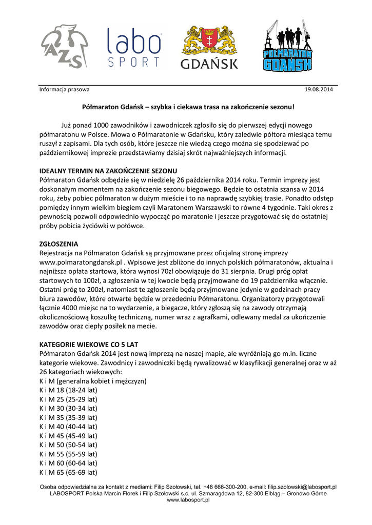 Informacja prasowa 19.08.2014 Półmaraton Gdańsk – szybka i ciekawa trasa na zakończenie sezonu! Już ponad 1000 zawodników i zawodniczek zgłosiło się do pierwszej edycji nowego półmaratonu w Polsce. Mowa o Półmaratonie w Gdańsku, który zaledwie półtora miesiąca temu ruszył z zapisami. Dla tych osób, które jeszcze nie wiedzą czego można się spodziewać po październikowej imprezie przedstawiamy dzisiaj skrót najważniejszych informacji. IDEALNY TERMIN NA ZAKOŃCZENIE SEZONU Półmaraton Gdańsk odbędzie się w niedzielę 26 października 2014 roku. Termin imprezy jest doskonałym momentem na zakończenie sezonu biegowego. Będzie to ostatnia szansa w 2014 roku, żeby pobiec półmaraton w dużym mieście i to na naprawdę szybkiej trasie. Ponadto odstęp pomiędzy innym wielkim biegiem czyli Maratonem Warszawski to równe 4 tygodnie. Taki okres z pewnością pozwoli odpowiednio wypocząć po maratonie i jeszcze przygotować się do ostatniej próby pobicia życiówki w połówce. ZGŁOSZENIA Rejestracja na Półmaraton Gdańsk są przyjmowane przez oficjalną stronę imprezy www.polmaratongdansk.pl . Wpisowe jest zbliżone do innych polskich półmaratonów, aktualna i najniższa opłata startowa, która wynosi 70zł obowiązuje do 31 sierpnia. Drugi próg opłat startowych to 100zł, a zgłoszenia w tej kwocie będą przyjmowane do 19 października włącznie. Ostatni próg to 200zł, natomiast te zgłoszenie będą przyjmowane jedynie w godzinach pracy biura zawodów, które otwarte będzie w przededniu Półmaratonu. Organizatorzy przygotowali łącznie 4000 miejsc na to wydarzenie, a biegacze, który zgłoszą się na zawody otrzymają okolicznościową koszulkę techniczną, numer wraz z agrafkami, odlewany medal za ukończenie zawodów oraz ciepły posiłek na mecie. KATEGORIE WIEKOWE CO 5 LAT Półmaraton Gdańsk 2014 jest nową imprezą na naszej mapie, ale wyróżniają go m.in. liczne kategorie wiekowe. Zawodnicy i zawodniczki będą rywalizować w klasyfikacji generalnej oraz w aż 26 kategoriach wiekowych: K i M (generalna kobiet i mężczyzn) K i M 18 (18-24 lat) K i M 25 (25-29 lat) K i M 30 (30-34 lat) K i M 35 (35-39 lat) K i M 40 (40-44 lat) K i M 45 (45-49 lat) K i M 50 (50-54 lat) K i M 55 (55-59 lat) K i M 60 (60-64 lat) K i M 65 (65-69 lat) Osoba odpowiedzialna za kontakt z mediami: Filip Szołowski, tel. +48 666-300-200, e-mail: [email protected] LABOSPORT Polska Marcin Florek i Filip Szołowski s.c. ul. Szmaragdowa 12, 82-300 Elbląg – Gronowo Górne www.labosport.pl K i M 70 (70-74 lat) K i M 75 (75-79 lat) K i M 80 (80 lat i więcej) SZYBKA I ATRAKCYJNA TRASA Trasa Półmaratonu Gdańsk 2014 widzie głównymi arteriami miasta. Niemal cała trasa będzie płaska, a zarazem szybka i widowiskowa dla biegaczy jak i dla kibiców. Zawodnicy będą mieli do pokonania m.in. al. Grunwaldzką, al. Niepodległości, przebiegną w okolicy Parku Regana oraz tuż przy samej Stoczni, a start i meta zostanie zlokalizowana w okolicy Amber Expo i PGE Arena. Na trasie zlokalizowane będą 4 punkty odświeżania rozstawione co 5km, na których wolontariusze będą rozdawać izotoniki firmy Enervit oraz wodę. Ostatni, piąty punkt odświeżania będzie czekał na uczestników tuż za metą. Tam także będzie można zjeść ciepły posiłek po zawodach. Organizatorzy zapraszają nie tylko na nową stronę www.polmaratongdansk.pl , ale także na fanpage imprezy dostępny pod adresem www.facebook.com/polmaratongdansk . Półmaraton Gdańsk to nowa impreza biegowa w Trójmieście, która odbędzie się 26 października 2014 roku. Start i meta zawodów zlokalizowana zostanie w okolicy Amber Expo oraz PGE Arena, a zawodnicy będą mieli do pokonania atestowaną trasę o długości 21,0975 km. Organizatorem półmaratonu jest AZS Centralny Ośrodek Sportu Akademickiego w Gdańsku, Labosport Polska i Miasto Gdańsk. Osoba odpowiedzialna za kontakt z mediami: Filip Szołowski, tel. +48 666-300-200, e-mail: [email protected] LABOSPORT Polska Marcin Florek i Filip Szołowski s.c. ul. Szmaragdowa 12, 82-300 Elbląg – Gronowo Górne www.labosport.pl