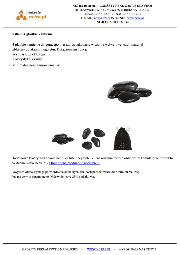 NETRA Reklama - GADŻETY REKLAMOWE DLA FIRM ul. Turystyczna 192, 43-384 Jaworze k/ BIELSKA - BIAŁEJ tel./fax: 033 / 812-56-17 fax: 033 / 810-49-33 E-MAIL: [email protected] INTERNET: www.netra.pl INFOLINIA: 801 022 192 7382m 4 gładkie kamienie 4 gładkie kamienie do gorącego masażu, zapakowane w czarne welwetowe, czyli materiał zbliżony do aksamitnego etui. Dołączona instrukcja. Wymiary: 12x17x4cm Kolorystyka: czarny Minimalna ilość zamówienia: szt. Dodatkowe koszty wykonania nadruku lub innej techniki znakowania można obliczyć w kalkulatorze produktu na stronie www.netra.pl - Oblicz cenę produktu z nadrukiem Powyższa oferta wymaga potwierdzenia aktualnych cen, dostępności towaru oraz terminu realizacji. Podane ceny są cenami netto. Należy doliczyć 23% podatku vat. GADŻETY REKLAMOWE Z NADRUKIEM - WWW.NETRA.PL - WYRÓŻNIAJĄ NAS CENY !