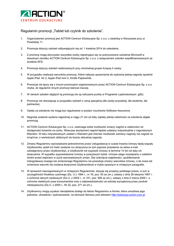 Regulamin promocji „Tablet lub czytnik do szkolenia”. 1. Organizatorem promocji jest ACTION Centrum Edukacyjne Sp. z o.o. z siedzibą w Warszawie przy ul. Poselskiej 11. 2. Promocja dotyczy szkoleń odbywających się od 1 kwietnia 2014 do odwołania. 3. Z promocji mogą skorzystać wszystkie osoby rejestrujące się na autoryzowane szkolenia Microsoft w dowolnym ośrodku ACTION Centrum Edukacyjne Sp. z o.o. z wyłączeniem szkoleń współfinansowanych ze środków EFS. 4. Promocja dotyczy szkoleń realizowanych przy minimalnej grupie liczącej 4 osoby. 5. W przypadku realizacji warunków promocji, Klient nabywa uprawnienia do wybrania jednej nagrody spośród: Apple iPad Air 2, Apple iPad mini 4, Kindle Paperwhite. 6. Promocja nie łączy się z innymi promocjami organizowanymi przez ACTION Centrum Edukacyjne Sp. z o.o. chyba, że regulamin innych promocji stanowi inaczej. 7. W ramach szkoleń objętych tą promocją nie są naliczane punkty w Programie Lojalnościowym .gif(t). 8. Promocja nie obowiązuje w przypadku szkoleń z ceną specjalną (dla osoby prywatnej, dla studenta, dla partnerów). 9. Opłaty za szkolenie nie mogą być regulowane w postaci voucherów Software Assurance. 10. Nagroda zostanie wydana najpóźniej w ciągu 21 dni od daty zapłaty pełnej należności za szkolenia objęte promocją. 11. ACTION Centrum Edukacyjne Sp. z o.o. zastrzega sobie możliwość zmiany nagród w zależności od dostępności towarów na rynku. Wówczas asortyment nagród będzie ustalany indywidualnie z nagrodzonym Klientem. W toku indywidualnych ustaleń z Klientem jest również możliwość zamiany nagrody lub nagród na inną/inne, o wartościach zbliżonych do kosztu aktualnej nagrody. 12. Zmiany Regulaminu wprowadzane jednostronnie przez Usługodawcę w czasie trwania Umowy będą wiązały Użytkownika, jeżeli ich treść zostanie mu doręczona (w tym poprzez przesłanie na adres e-mail udostępniony przez Użytkownika), a Użytkownik nie wypowie Umowy w terminie 14 dni od daty ich doręczenia. W wypadku wypowiedzenia Umowy w powyższym trybie, Umowa ulega rozwiązaniu z ostatnim dniem przed wejściem w życie wprowadzanych zmian. Dla uniknięcia wątpliwości, opublikowanie Usługodawcę nowego lub zmienionego Regulaminu nie powoduje zmiany warunków Umowy, o ile nowe lub zmienione warunki nie zostaną doręczone Użytkownikowi w trybie opisanym w niniejszym paragrafie. 13. W sprawach nieuregulowanych w niniejszym Regulaminie, stosuje się przepisy polskiego prawa, w tym w szczególności Kodeksu cywilnego (Dz. U z 1964 r., nr 16, poz. 93 ze zm.), ustawy z dnia 29 sierpnia 1997 r. o ochronie danych osobowych (Dz.U. z 2002 r., nr 101, poz. 926 ze zm.), ustawy z dnia 2 marca 2000 r. o ochronie niektórych praw konsumentów oraz o odpowiedzialności za szkodę wyrządzoną przez produkt niebezpieczny (Dz.U. z 2000 r., Nr 22, poz. 271 ze zm.). 14. Użytkownicy mogą uzyskać nieodpłatnie dostęp do tekstu Regulaminu w formie, która umożliwia jego pobranie, utrwalenie i wydrukowanie, na stronach Serwisu pod adresem http://edukacja.action.com.pl.