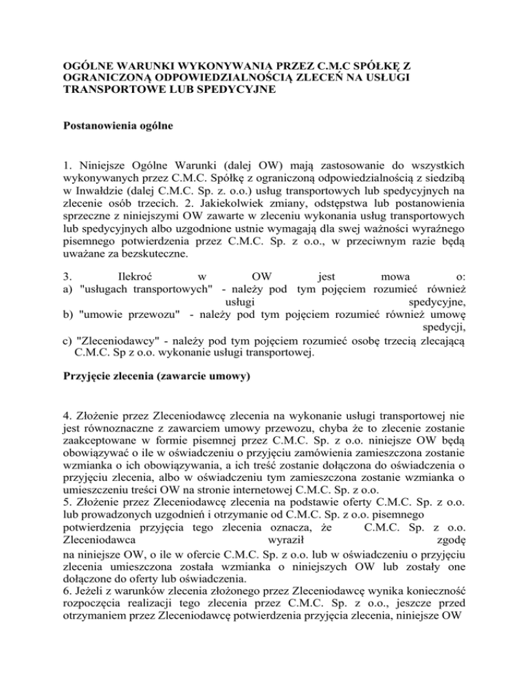 OGÓLNE WARUNKI WYKONYWANIA PRZEZ C.M.C SPÓŁKĘ Z OGRANICZONĄ ODPOWIEDZIALNOŚCIĄ ZLECEŃ NA USŁUGI TRANSPORTOWE LUB SPEDYCYJNE Postanowienia ogólne 1. Niniejsze Ogólne Warunki (dalej OW) mają zastosowanie do wszystkich wykonywanych przez C.M.C. Spółkę z ograniczoną odpowiedzialnością z siedzibą w Inwałdzie (dalej C.M.C. Sp. z. o.o.) usług transportowych lub spedycyjnych na zlecenie osób trzecich. 2. Jakiekolwiek zmiany, odstępstwa lub postanowienia sprzeczne z niniejszymi OW zawarte w zleceniu wykonania usług transportowych lub spedycyjnych albo uzgodnione ustnie wymagają dla swej ważności wyraźnego pisemnego potwierdzenia przez C.M.C. Sp. z o.o., w przeciwnym razie będą uważane za bezskuteczne. 3. Ilekroć w OW jest mowa o: a) "usługach transportowych" - należy pod tym pojęciem rozumieć również usługi spedycyjne, b) "umowie przewozu" - należy pod tym pojęciem rozumieć również umowę spedycji, c) "Zleceniodawcy" - należy pod tym pojęciem rozumieć osobę trzecią zlecającą C.M.C. Sp z o.o. wykonanie usługi transportowej. Przyjęcie zlecenia (zawarcie umowy) 4. Złożenie przez Zleceniodawcę zlecenia na wykonanie usługi transportowej nie jest równoznaczne z zawarciem umowy przewozu, chyba że to zlecenie zostanie zaakceptowane w formie pisemnej przez C.M.C. Sp. z o.o. niniejsze OW będą obowiązywać o ile w oświadczeniu o przyjęciu zamówienia zamieszczona zostanie wzmianka o ich obowiązywania, a ich treść zostanie dołączona do oświadczenia o przyjęciu zlecenia, albo w oświadczeniu tym zamieszczona zostanie wzmianka o umieszczeniu treści OW na stronie internetowej C.M.C. Sp. z o.o. 5. Złożenie przez Zleceniodawcę zlecenia na podstawie oferty C.M.C. Sp. z o.o. lub prowadzonych uzgodnień i otrzymanie od C.M.C. Sp. z o.o. pisemnego potwierdzenia przyjęcia tego zlecenia oznacza, że C.M.C. Sp. z o.o. Zleceniodawca wyraził zgodę na niniejsze OW, o ile w ofercie C.M.C. Sp. z o.o. lub w oświadczeniu o przyjęciu zlecenia umieszczona została wzmianka o niniejszych OW lub zostały one dołączone do oferty lub oświadczenia. 6. Jeżeli z warunków zlecenia złożonego przez Zleceniodawcę wynika konieczność rozpoczęcia realizacji tego zlecenia przez C.M.C. Sp. z o.o., jeszcze przed otrzymaniem przez Zleceniodawcę potwierdzenia przyjęcia zlecenia, niniejsze OW uważa się za zaakceptowane przez Zleceniodawcę z chwilą rozpoczęcia realizacji zamówienia przez C.M.C. Sp. z o.o., pod warunkiem, że Zleceniodawca w swym zleceniu zamieścił odpowiednie oświadczenie o akceptacji niniejszych OW. 7. Zleceniodawca może składać zlecenia faksem lub elektronicznie (e-mail). 8. C.M.C. Sp. z o.o. potwierdza przyjęcie zlecenia faksem lub elektronicznie (email) w ciągu 1 godziny od otrzymania zlecenia. Brak potwierdzenia w tym terminie uważa się za odmowę przyjęcia zlecenia. 9. Zmiany lub uzupełnienia zlecenia wymagają dla swej ważności wyraźnego pisemnego potwierdzenia przez C.M.C. Sp. z o.o. ustne uzgodnienia są nieważne. 10. Językiem obowiązującym dla zlecenia i przyjęcia zlecenia jest język polski i język angielski. Ceny 11. Ceny podane przez C.M.C. Sp. z o.o. w potwierdzeniu przyjęcia zlecenia obowiązują tylko dla danego zlecenia. Ceny nie zawierają podatku VAT, który zostanie naliczony wg obowiązujących przepisów. Do wyceny wartości frachtu stosuje się średni kurs NBP z dnia poprzedzającego dzień załadunku. Warunki płatności 12. Zleceniodawca jest zobowiązany do zapłaty ceny za wykonane usługi transportowe w wysokości i w terminie określonym w potwierdzeniu przyjęcia zlecenia, chyba że strony na piśmie uzgodnią inne warunki. Jeśli na zleceniu transportowym nie określono terminu płatności wynosi on 60 dni od daty otrzymania faktury. 13. Za datę zapłaty uważa się datę uznania rachunku bankowego C.M.C. Sp. z o.o. Obrót paletami EURO EPAL certyfikowanymi. 14. Na żądanie Zleceniodawcy zawarte w zleceniu Zleceniobiorca odbierając towar może wydać nadawcy odpowiednią ilość europalet, natomiast Zleceniodawca jest zobowiązany zwrócić Zleceniobiorcy tą samą ilość europalet. 15. Jeżeli nadawca towaru bez zastrzeżeń na CMR lub innym dowodzie przyjęcia przyjmie palety od Zleceniobiorcy uważa się, że palety te spełniały wszystkie normy obowiązujące dla palet certyfikowanych EPAL EURO. 16. Odbierając towar od nadawcy Zleceniobiorca nie ma obowiązku sprawdzenia, czy palety, na których wydano mu towar spełniają normy określone dla europalet. 17. Zleceniodawca jest zwolniony z obowiązku zwrotu europalet, jeżeli w miejscu rozładunku towaru Zleceniobiorca otrzyma europalety od odbiorcy towaru. Jeśli Zleceniobiorca otrzyma od odbiorcy towaru zwrot tylko części europalet, w pozostałym zakresie obowiązek zwrotu nadal obciąża Zleceniodawcę. 18. Zleceniodawca zobowiązany jest do zwrotu europalet w terminie 7 dni od daty otrzymania faksem lub elektronicznie (e-mail) wezwania do zwrotu. Zwrot następuje w naturze i na koszt Zleceniodawcy. Zwracane palety muszą spełniać wszystkie normy obowiązujące dla certyfikowanych palet EURO EPAL. 19. Jeżeli Zleceniodawca nie zwróci europalet w terminie określonym w pkt 18, Zleceniobiorca obciąża Zleceniodawcę kosztem nowych certyfikowanych palet EURO EPAL, wg cen obowiązujących na rynku polskim. Zapłata winna nastąpić w Terminie 7 dni. 20. Zleceniobiorca nie przyjmuje europalet od odbiorcy towaru jeśli nie wydał własnych europalet nadawcy towaru. Prawo właściwe i zapis na sąd 21. Umowa przewozu, umowa spedycji podlega prawu polskiemu. 22. Wszelkie spory wynikające z umowy będą rozpatrywane przez polskie sądy powszechne właściwe ze względu na siedzibę C.M.C. Sp. z o.o.