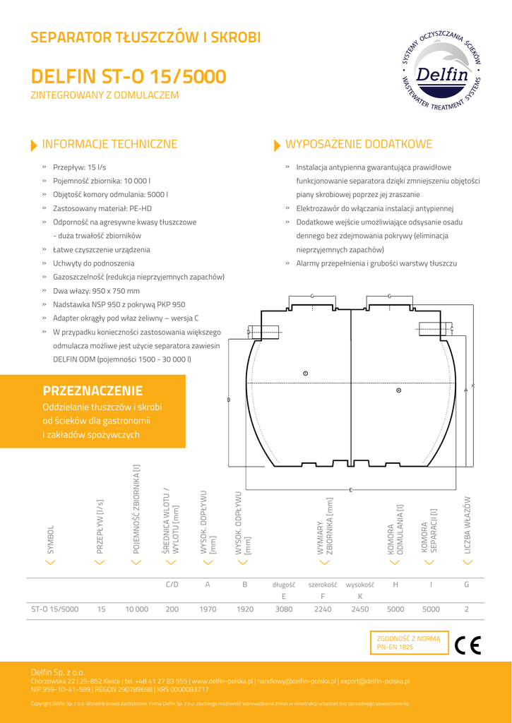 SEPARATOR TŁUSZCZÓW I SKROBI DELFIN ST-O 15/5000 ZINTEGROWANY Z ODMULACZEM INFORMACJE TECHNICZNE WYPOSAŻENIE DODATKOWE » Przepływ: 15 l/s » Instalacja antypienna gwarantująca prawidłowe » Pojemność zbiornika: 10 000 l funkcjonowanie separatora dzięki zmniejszeniu objętości » Objętość komory odmulania: 5000 l piany skrobiowej poprzez jej zraszanie » Zastosowany materiał: PE-HD » Elektrozawór do włączania instalacji antypiennej » Odporność na agresywne kwasy tłuszczowe » Dodatkowe wejście umożliwiające odsysanie osadu - duża trwałość zbiorników dennego bez zdejmowania pokrywy (eliminacja » Łatwe czyszczenie urządzenia nieprzyjemnych zapachów) » Uchwyty do podnoszenia » Alarmy przepełnienia i grubości warstwy tłuszczu » Gazoszczelność (redukcja nieprzyjemnych zapachów) » Dwa włazy: 950 x 750 mm » Nadstawka NSP 950 z pokrywą PKP 950 » Adapter okrągły pod właz żeliwny – wersja C » W przypadku konieczności zastosowania większego odmulacza możliwe jest użycie separatora zawiesin DELFIN ODM (pojemności 1500 - 30 000 l) PRZEZNACZENIE ST-O 15/5000 15 10 000 200 1970 B 1920 długość szerokość wysokość E F K 3080 2240 2450 Liczba włazów Komora separacji [l] Komora odmulania [l] A Wymiary zbiornika [mm] Wysok. dopływu [mm] C/D Wysok. odpływu [mm] Średnica wlotu / wylotu [mm] Pojemność zbiornika [l] Przepływ [l/s] Symbol Oddzielanie tłuszczów i skrobi od ścieków dla gastronomii i zakładów spożywczych H I G 5000 5000 2 Zgodność z normą PN-EN 1825 Delfin Sp. z o.o. Chorzowska 22 | 25-852 Kielce | tel. +48 41 27 83 555 | www.delfin-polska.pl | [email protected] | [email protected] NIP 959-10-41-589 | REGON 290789698 | KRS 0000083717 Copyright Delfin Sp. z o.o. Wszelkie prawa zastrzeżone. Firma Delfin Sp. z o.o. zastrzega możliwość wprowadzenia zmian w konstrukcji urządzeń bez uprzedniego powiadomienia.