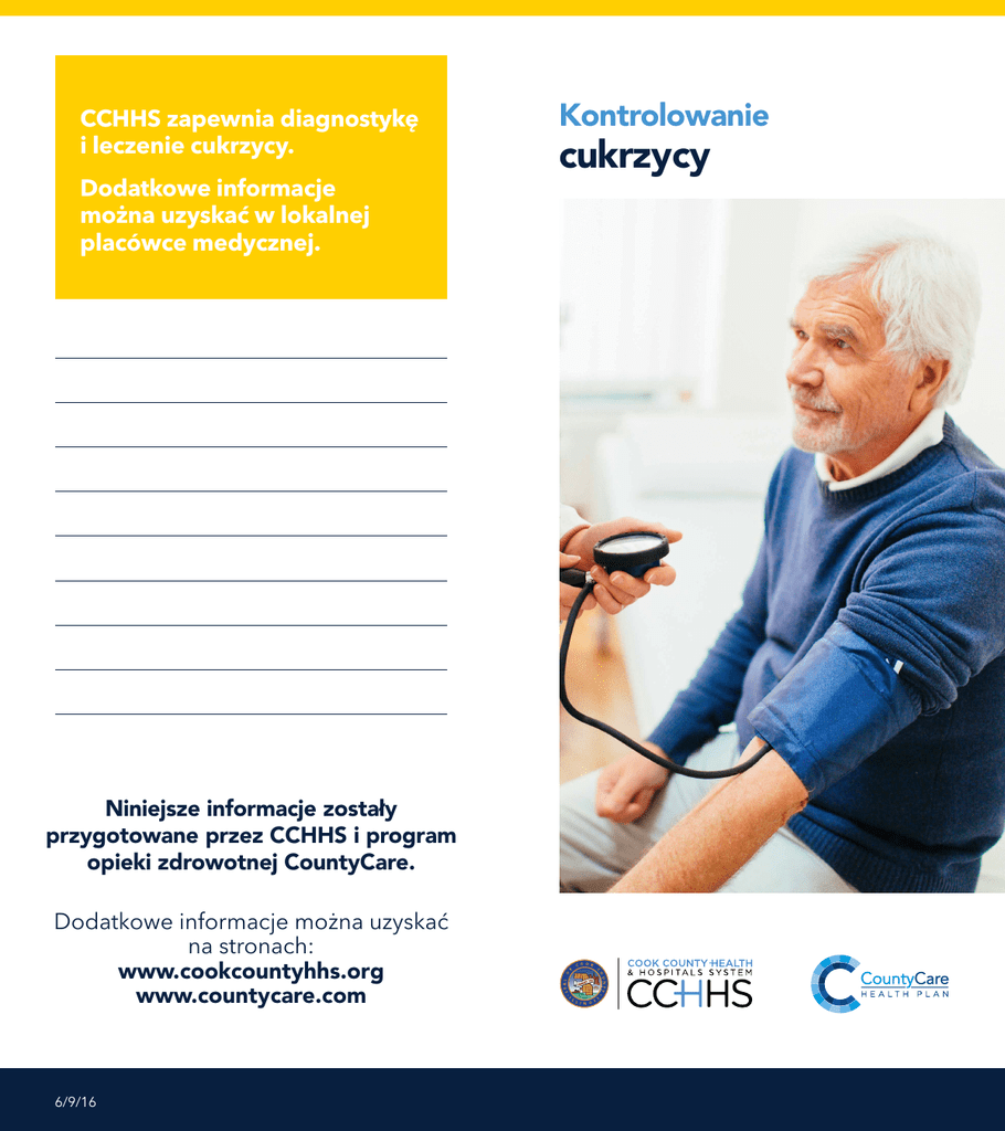 CCHHS zapewnia diagnostykę i leczenie cukrzycy. Dodatkowe informacje można uzyskać w lokalnej placówce medycznej. Niniejsze informacje zostały przygotowane przez CCHHS i program opieki zdrowotnej CountyCare. Dodatkowe informacje można uzyskać na stronach: www.cookcountyhhs.org www.countycare.com 6/9/16 Kontrolowanie cukrzycy Cukrzyca Cukrzyca to choroba, w której poziom cukru we krwi jest zbyt wysoki. Większość cukru we krwi pochodzi z żywności, którą jemy. Spożywanie żywności bogatej w tłuszcze np. czerwonego mięsa lub niezdrowej żywności odpowiada za wzrost stężenia cukru we krwi. Cukrzycę można kontrolować, ale nieleczona może prowadzić do poważnych powikłań. Czy choruję na cukrzycę? Jedynym sposobem uzyskania odpowiedzi na to pytanie jest wizyta u lekarza prowadzącego. Jeśli zaobserwujesz, któryś z poniższych objawów, zgłoś się do lekarza: • Silne pragnienie, głód lub osłabienie • Zbyt częste korzystanie z toalety • Niewyjaśniona utrata masy ciała • Zaburzenia wzroku Jak kontrolować lub uniknąć cukrzycy? Cukrzycę można kontrolować, dokonując codziennie bardzo prostych wyborów. • Częste infekcje lub trudno gojące się owrzodzenia • Należy regularnie ćwiczyć • Spożywać mniej tłustych potraw oraz unikać żywności przetworzonej • Pić duże ilości wody • Stosować insulinę zgodnie z zaleceniami • Regularnie umawiać się na wizyty u lekarza z CCHHS Dodatkowe informacje można uzyskać na stronach: www.cookcountyhhs.org www.countycare.com