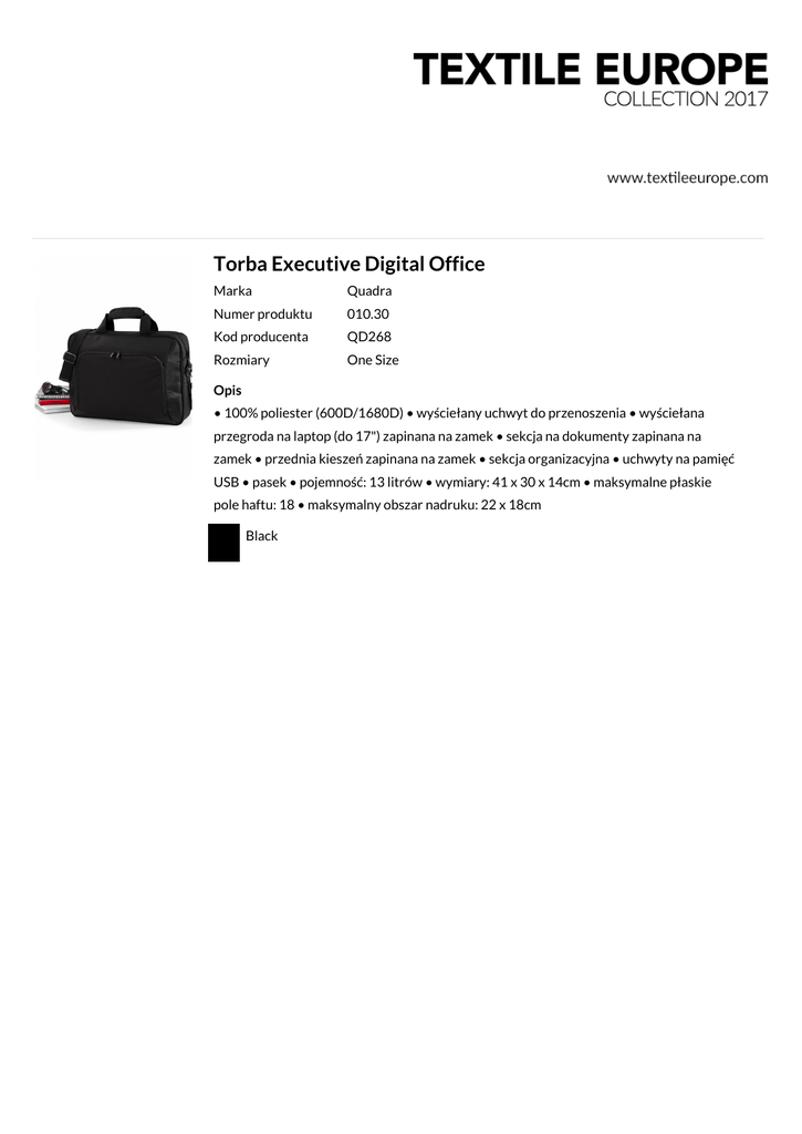 Torba Executive Digital Office Marka Quadra Numer produktu 010.30 Kod producenta QD268 Rozmiary One Size Opis • 100% poliester (600D/1680D) • wyściełany uchwyt do przenoszenia • wyściełana przegroda na laptop (do 17") zapinana na zamek • sekcja na dokumenty zapinana na zamek • przednia kieszeń zapinana na zamek • sekcja organizacyjna • uchwyty na pamięć USB • pasek • pojemność: 13 litrów • wymiary: 41 x 30 x 14cm • maksymalne płaskie pole haftu: 18 • maksymalny obszar nadruku: 22 x 18cm Black