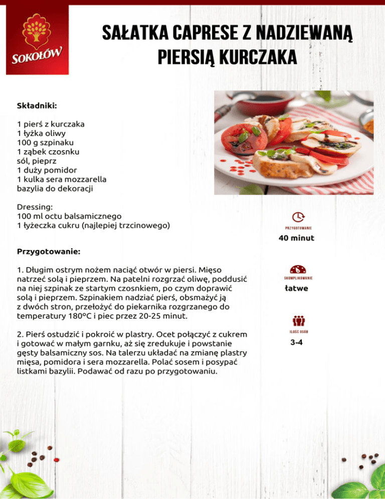Składniki: 1 pierś z kurczaka 1 łyżka oliwy 100 g szpinaku 1 ząbek czosnku sól, pieprz 1 duży pomidor 1 kulka sera mozzarella bazylia do dekoracji Dressing: 100 ml octu balsamicznego 1 łyżeczka cukru (najlepiej trzcinowego) 40 minut Przygotowanie: 1. Długim ostrym nożem naciąć otwór w piersi. Mięso natrzeć solą i pieprzem. Na patelni rozgrzać oliwę, poddusić na niej szpinak ze startym czosnkiem, po czym doprawić solą i pieprzem. Szpinakiem nadziać pierś, obsmażyć ją z dwóch stron, przełożyć do piekarnika rozgrzanego do temperatury 180ºC i piec przez 20-25 minut. 2. Pierś ostudzić i pokroić w plastry. Ocet połączyć z cukrem i gotować w małym garnku, aż się zredukuje i powstanie gęsty balsamiczny sos. Na talerzu układać na zmianę plastry mięsa, pomidora i sera mozzarella. Polać sosem i posypać listkami bazylii. Podawać od razu po przygotowaniu. łatwe 3-4