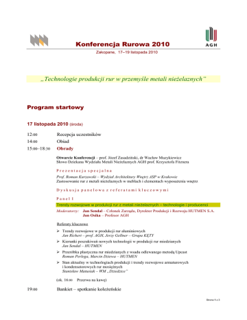 Konferencja Rurowa 2010 Zakopane, 17–19 listopada 2010 „Technologie produkcji rur w przemyśle metali nieżelaznych” Program startowy 17 listopada 2010 (środa) 12:00 Recepcja uczestników 14:00 Obiad 15:00–18:30 Obrady Otwarcie Konferencji – prof. Józef Zasadziński, dr Wacław Muzykiewicz Słowo Dziekana Wydziału Metali Nieżelaznych AGH prof. Krzysztofa Fitznera Prezentacja specjalna Prof. Roman Kurzawski – Wydział Architektury Wnętrz ASP w Krakowie Zastosowanie rur z metali nieżelaznych w meblach i elementach wyposażenia wnętrz Dyskusja panelowa z referatami kluczowymi Panel I Trendy rozwojowe w produkcji rur z metali nieżelaznych – technologie i producenci Moderatorzy: Jan Sendal – Członek Zarządu, Dyrektor Produkcji i Rozwoju HUTMEN S.A. Jan Osika – Profesor AGH Referaty kluczowe Trendy rozwojowe w produkcji rur aluminiowych Jan Richert – prof. AGH, Jerzy Gellner – Grupa KĘTY Kierunki poszukiwań nowych technologii w produkcji rur miedzianych Jan Sendal – HUTMEN Przeróbka plastyczna rur miedzianych z wsadu odlewanego metodą Upcast Roman Perlega, Marcin Dziewa – HUTMEN Stan aktualny w technologiach produkcji i trendy rozwojowe armaturowych i kondensatorowych rur mosiężnych Stanisław Matusiak – WM „Dziedzice” (ok. 16:00 19:00 Przerwa na kawę) Bankiet – spotkanie koleżeńskie Strona 1 z 3 18 listopada 2010 (czwartek) 9:00 Śniadanie 10:00–13:00 Obrady P a n e l II Rynek konsumentów rur z metali nieżelaznych Moderatorzy: Piotr Jurasz – Dyrektor ds. Programowych Polskiego Centrum Promocji Miedzi Wojciech Libura – Profesor, Prodziekan Wydziału Metali Nieżelaznych AGH, Kierownik Katedry PPiMMN Referaty kluczowe Producenci vs Konsumenci – czy równoprawnie zależni? Sytuacja prawna obu stron w Polsce i Unii Europejskiej Mecenas Elżbieta Modzelewska-Wąchal – Centrum Prawa Konkurencji (najlepszy prawnik w kategorii "Prawo antymonopolowe i konkurencji" w rankingu miesięcznika "Forbes") Mechanizmy substytucji, znane czy nieznane? (omówienie badań międzynarodowych na temat substytucji rur miedzianych) Piotr Jurasz - Polskie Centrum Promocji Miedzi Czy można przewidywać / badać zachowania konsumentów? Dr Janusz Bujko – PENTOR Research International Inne zastosowania rur aluminiowych Jan Kowalski - ARO TUBI Components Poland (ok. 11:00 14:00 Obiad 15:00–18:00 Obrady Przerwa na kawę) P a n e l III Konkurencja materiałowa dla rur z metali nieżelaznych Moderator: Henryk Dybiec – Profesor, Kierownik Katedry SiMCS WMN AGH Referaty kluczowe Konkurencja, jako stymulator rozwoju zaawansowanych materiałów z metali nieżelaznych na rury i profile konstrukcyjne Henryk Dybiec – prof., AGH Rury z tworzyw sztucznych w instalacjach – konkurencja, równoważność czy uzupełnienie? Andrzej Maciejowski – INTERAM (ok. 16:00 19:00 Przerwa na kawę) Kolacja z góralskimi śpasami Strona 2 z 3 19 listopada 2010 (piątek) 9:00 śniadanie 10:00–12:30 Obrady Sesja referatowa Referaty, które zostaną zgłoszone, a nie zmieszczą się w tematyce paneli. Zachęcamy i bardzo prosimy o ich nadsyłanie. Tradycyjnie, problematyka Konferencji obejmuje: o o o teorie i technologie procesów produkcji rur problemy jakości i własności użytkowych w powiązaniu z technologią wytwarzania zagadnienia dalszego przetwarzania rur (produkcji wyrobów gotowych) (ok. 11:00 13:00 Przerwa na kawę) Obiad – zakończenie Konferencji Publikacja referatów: „Rudy i Metale Nieżelazne” – R 55, 2010, nr 11 (9 punktów w klasyfikacji MNiSW) Miejsce Konferencji: Ośrodek Konferencyjno-Wczasowy BEL-AMI w Zakopanem, ul. Goszczyńskiego 24 (www.bel-ami.pl) Kontakt z Przewodniczącym Komitetu Organizacyjnego Konferencji: Dr Wacław Muzykiewicz – e-mail: [email protected], tel.: 501 423 372, 12 617 39 53, fax: 12 617 26 32 Konferencja Rurowa (1980 – 2010) Strona 3 z 3