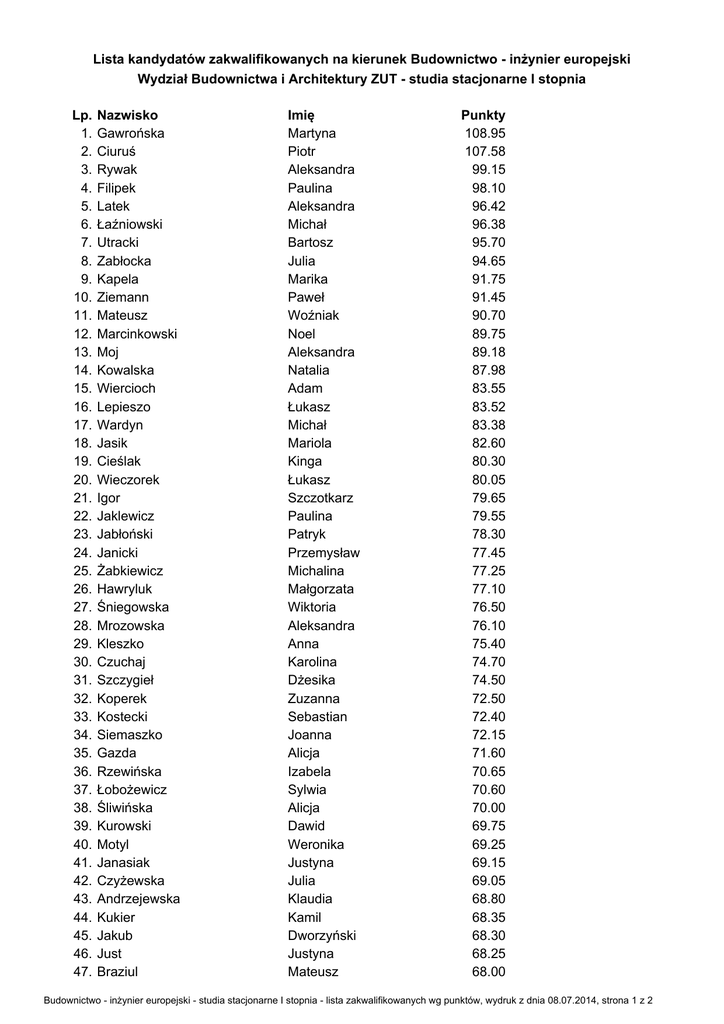 Lista kandydatów zakwalifikowanych na kierunek Budownictwo - inżynier europejski Wydział Budownictwa i Architektury ZUT - studia stacjonarne I stopnia Lp. 1. 2. 3. 4. 5. 6. 7. 8. 9. 10. 11. 12. 13. 14. 15. 16. 17. 18. 19. 20. 21. 22. 23. 24. 25. 26. 27. 28. 29. 30. 31. 32. 33. 34. 35. 36. 37. 38. 39. 40. 41. 42. 43. 44. 45. 46. 47. Nazwisko Gawrońska Ciuruś Rywak Filipek Latek Łaźniowski Utracki Zabłocka Kapela Ziemann Mateusz Marcinkowski Moj Kowalska Wiercioch Lepieszo Wardyn Jasik Cieślak Wieczorek Igor Jaklewicz Jabłoński Janicki Żabkiewicz Hawryluk Śniegowska Mrozowska Kleszko Czuchaj Szczygieł Koperek Kostecki Siemaszko Gazda Rzewińska Łobożewicz Śliwińska Kurowski Motyl Janasiak Czyżewska Andrzejewska Kukier Jakub Just Braziul Imię Martyna Piotr Aleksandra Paulina Aleksandra Michał Bartosz Julia Marika Paweł Woźniak Noel Aleksandra Natalia Adam Łukasz Michał Mariola Kinga Łukasz Szczotkarz Paulina Patryk Przemysław Michalina Małgorzata Wiktoria Aleksandra Anna Karolina Dżesika Zuzanna Sebastian Joanna Alicja Izabela Sylwia Alicja Dawid Weronika Justyna Julia Klaudia Kamil Dworzyński Justyna Mateusz Punkty 108.95 107.58 99.15 98.10 96.42 96.38 95.70 94.65 91.75 91.45 90.70 89.75 89.18 87.98 83.55 83.52 83.38 82.60 80.30 80.05 79.65 79.55 78.30 77.45 77.25 77.10 76.50 76.10 75.40 74.70 74.50 72.50 72.40 72.15 71.60 70.65 70.60 70.00 69.75 69.25 69.15 69.05 68.80 68.35 68.30 68.25 68.00 Budownictwo - inżynier europejski - studia stacjonarne I stopnia - lista zakwalifikowanych wg punktów, wydruk z dnia 08.07.2014, strona 1 z 2 48. 49. 50. 51. 52. 53. 54. 55. 56. 57. 58. 59. 60. Sobolak Żmuda Wrześniewski Trepanowski Cynarski Stróż Kulawiec Kuszyńska Walz Kłodziński Mielnik Gruszka Kusa Radosław Marcin Bartosz Piotr Kacper Mirella Aleksandra Natalia Justyna Łukasz Dawid Kacper Olivia 67.80 67.60 67.40 67.15 66.85 66.70 65.50 64.95 64.80 62.85 62.65 62.55 62.30 Budownictwo - inżynier europejski - studia stacjonarne I stopnia - lista zakwalifikowanych wg punktów, wydruk z dnia 08.07.2014, strona 2 z 2