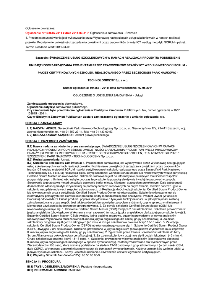 Ogłoszenie powiązane: Ogłoszenie nr 103615-2011 z dnia 2011-03-31 r. Ogłoszenie o zamówieniu - Szczecin 1. Przedmiotem zamówienia jest wykonywanie przez Wykonawcę następujących usług szkoleniowych w ramach realizacji projektu: Podniesienie umiejętności zarządzania projektami przez pracowników branży ICT według metodyki SCRUM - pakiet... Termin składania ofert: 2011-04-08 Szczecin: ŚWIADCZENIE USŁUG SZKOLENIOWYCH W RAMACH REALIZACJI PROJEKTU: PODNIESIENIE UMIEJĘTNOŚCI ZARZĄDZANIA PROJEKTAMI PRZEZ PRACOWNIKÓW BRANŻY ICT WEDŁUG METODYKI SCRUM PAKIET CERTYFIKOWANYCH SZKOLEŃ, REALIZOWANEGO PRZEZ SZCZECIŃSKI PARK NAUKOWO TECHNOLOGICZNY Sp. z o.o. Numer ogłoszenia: 104256 - 2011; data zamieszczenia: 07.05.2011 OGŁOSZENIE O UDZIELENIU ZAMÓWIENIA - Usługi Zamieszczanie ogłoszenia: obowiązkowe. Ogłoszenie dotyczy: zamówienia publicznego. Czy zamówienie było przedmiotem ogłoszenia w Biuletynie Zamówień Publicznych: tak, numer ogłoszenia w BZP: 103615 - 2011r. Czy w Biuletynie Zamówień Publicznych zostało zamieszczone ogłoszenie o zmianie ogłoszenia: nie. SEKCJA I: ZAMAWIAJĄCY I. 1) NAZWA I ADRES: Szczeciński Park Naukowo-Technologiczny Sp. z o.o., ul. Niemierzyńska 17a, 71-441 Szczecin, woj. zachodniopomorskie, tel. +48 91 852 29 11, faks +48 91 433 60 53. I. 2) RODZAJ ZAMAWIAJĄCEGO: Podmiot prawa publicznego. SEKCJA II: PRZEDMIOT ZAMÓWIENIA II.1) Nazwa nadana zamówieniu przez zamawiającego: ŚWIADCZENIE USŁUG SZKOLENIOWYCH W RAMACH REALIZACJI PROJEKTU: PODNIESIENIE UMIEJĘTNOŚCI ZARZĄDZANIA PROJEKTAMI PRZEZ PRACOWNIKÓW BRANŻY ICT WEDŁUG METODYKI SCRUM - PAKIET CERTYFIKOWANYCH SZKOLEŃ, REALIZOWANEGO PRZEZ SZCZECIŃSKI PARK NAUKOWO - TECHNOLOGICZNY Sp. z o.o.. II.2) Rodzaj zamówienia: Usługi. II.3) Określenie przedmiotu zamówienia: 1. Przedmiotem zamówienia jest wykonywanie przez Wykonawcę następujących usług szkoleniowych w ramach realizacji projektu: Podniesienie umiejętności zarządzania projektami przez pracowników branży ICT według metodyki SCRUM - pakiet certyfikowanych szkoleń, realizowanego przez Szczeciński Park Naukowo Technologiczny sp. z o.o.: a) Realizacja pięciu edycji szkolenia: Certified Scrum Master lub równoważnych wraz z certyfikacją Certified Scrum Master lub równoważną. Szkolenie skierowane jest do informatyków pełniących role liderów zespołów programistycznych. Umiejętności nabyte podczas tego szkolenia pozwolą efektywnie i wydajnie pracować w zespole. Stosowanie tego zestawu metod umożliwia usuwanie barier miedzy klientem i a zespołem projektowym. Daje sposobność doskonalenia własnej praktyki inżynierskiej za pomocą narzędzi stosowanych na całym świecie, również poprzez ujęte w szkoleniu narzędzie motywacji zespołu i automotywacji. b) Realizacja dwóch edycji szkolenia: Certified Scrum Product Owner lub równoważnych wraz z certyfikacją Certified Scrum Product Owner lub równoważną. Szkolenie skierowane jest do informatyków pełniących role kierowników produktu, kadry menedżerskiej oraz analityków. Product Owner (Właściciel Produktu) odpowiada za kształt produktu poprzez decydowanie o tym jakie funkcjonalności i w jakiej kolejności zostaną zaimplementowane przez zespół. Jest także pośrednikiem pomiędzy zespołem a różnymi, często sprzecznymi interesami klienta oraz użytkownika budowanego oprogramowania. 2. Za edycję szkolenia Certified Scrum Master (CSM) lub równoważnego uznaje się: 1. Szkolenie Certified Scrum Master (CSM) trwające 2 dni szkoleniowe. Szkolenie prowadzone w języku angielskim (obowiązkowo Wykonawca musi zapewnić tłumacza języka angielskiego dla każdej grupy szkoleniowej) 2. Egzamin Certified Scrum Master (CSM) trwający jedną godzinę zegarową, egzamin prowadzony w języku angielskim (obowiązkowo Wykonawca musi zapewnić tłumacza języka angielskiego dla każdej grupy szkoleniowej) 3. Za dzień szkoleniowy przyjmuje się 8 godzin lekcyjnych (45 min). 4. Grupa szkoleniowa powinna liczyć 13-18 osób. 3. Za edycję szkolenia Certified Scrum Product Owner (CSPO) lub równoważnego uznaje się: 1. Szkolenie Certified Scrum Product Owner (CSPO) trwające 2 dni szkoleniowe. Szkolenie prowadzone w języku angielskim (obowiązkowo Wykonawca musi zapewnić tłumacza języka angielskiego dla każdej grupy szkoleniowej) 2. Zgłoszenie przez trenera uczestników szkolenia do bazy Scrum Alliance oraz pokrycie opłaty certyfikacyjnej. 3. Za dzień szkoleniowy przyjmuje się 8 godzin lekcyjnych (45 min). 4. Grupa szkoleniowa powinna liczyć 13-18 osób. 4. Szkolenia, prowadzone w języku angielskim (obowiązkowa obecność tłumacza języka angielskiego tłumaczącego w sposób symultaniczny), zostaną zrealizowane dla wyznaczonych przez Zleceniodawców 105 osób, które zostaną podzielone na siedem 13-18 osobowych grup szkoleniowych (w tym sześć CSM, dwie CSPO). Wykonawca zapewni niezbędny sprzęt do tłumaczeń symultanicznych. Każdy z uczestników weźmie udział w jednym wybranym szkoleniu. Każdy uczestnik szkolenia CSM weźmie udział w egzaminie certyfikującym. II.4) Wspólny Słownik Zamówień (CPV): 80.50.00.00-9. SEKCJA III: PROCEDURA III.1) TRYB UDZIELENIA ZAMÓWIENIA: Przetarg nieograniczony III.2) INFORMACJE ADMINISTRACYJNE • Zamówienie dotyczy projektu/programu finansowanego ze środków Unii Europejskiej: tak, projekt/program: Projekt:Podniesienie umiejętności zarządzania projektami przez pracowników branży ICT według metodyki SCRUM-pakiet certyfikowanych szkoleń, finansowany ze środków Europejskiego Funduszu Społecznego i budżetu państwa w ramach Programu Operacyjnego Kapitał Ludzki, Priorytet VIII, Działanie 8.1, Poddziałanie 8.1.1 - umowa nr: UDA-POKL.08.01.0132-038/10-00 zawarta w dniu 21.09.2010r. pomiędzy Woj. Zachodniopomorskim - WUP w Szczecinie a Szczecińskim Parkiem Parkiem Naukowo-Technologicznym Sp.zo.o.. SEKCJA IV: UDZIELENIE ZAMÓWIENIA IV.1) DATA UDZIELENIA ZAMÓWIENIA: 04.05