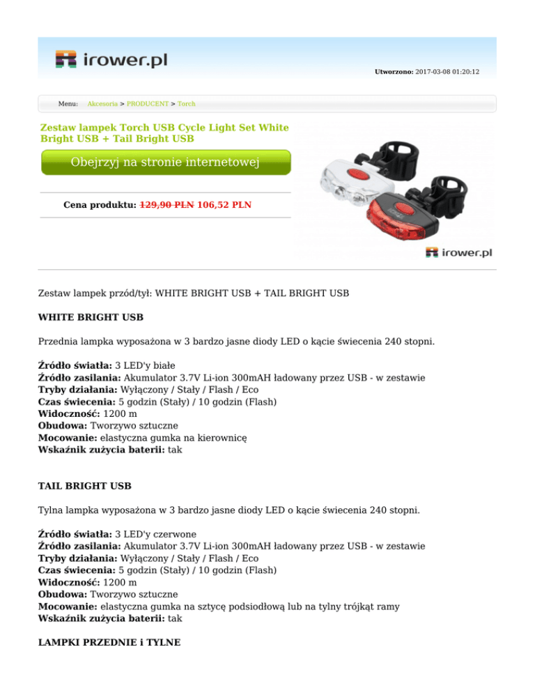 Utworzono: 2017-03-08 01:20:12 Menu: Akcesoria > PRODUCENT > Torch Zestaw lampek Torch USB Cycle Light Set White Bright USB + Tail Bright USB Obejrzyj na stronie internetowej Cena produktu: 129,90 PLN 106,52 PLN Zestaw lampek przód/tył: WHITE BRIGHT USB + TAIL BRIGHT USB WHITE BRIGHT USB Przednia lampka wyposażona w 3 bardzo jasne diody LED o kącie świecenia 240 stopni. Źródło światła: 3 LED'y białe Źródło zasilania: Akumulator 3.7V Li-ion 300mAH ładowany przez USB - w zestawie Tryby działania: Wyłączony / Stały / Flash / Eco Czas świecenia: 5 godzin (Stały) / 10 godzin (Flash) Widoczność: 1200 m Obudowa: Tworzywo sztuczne Mocowanie: elastyczna gumka na kierownicę Wskaźnik zużycia baterii: tak TAIL BRIGHT USB Tylna lampka wyposażona w 3 bardzo jasne diody LED o kącie świecenia 240 stopni. Źródło światła: 3 LED'y czerwone Źródło zasilania: Akumulator 3.7V Li-ion 300mAH ładowany przez USB - w zestawie Tryby działania: Wyłączony / Stały / Flash / Eco Czas świecenia: 5 godzin (Stały) / 10 godzin (Flash) Widoczność: 1200 m Obudowa: Tworzywo sztuczne Mocowanie: elastyczna gumka na sztycę podsiodłową lub na tylny trójkąt ramy Wskaźnik zużycia baterii: tak LAMPKI PRZEDNIE i TYLNE Lampki Torch oferują wyrafinowaną inżynierię i oświetlenie, które wykorzystuje technologię LED światowej klasy, w celu osiągnięcia silnej wiązki światła, która przecina ciemność. Widoczność nawet do 1600m. Od 1 do 4 trybów świecenia. Solidne wykonanie i piękne wykończenie, długie godziny użytkowania światła, duża moc światła, niezrównana jakość i doskonała stylizacja sprawiają, że oświetlenie Torch jest idealnym wyborem dla tych, którzy chcą bezkompromisowej wydajności. Torch to znakomicie zaprojektowane oświetlenie w celu zapewnienia niezrównanej wydajności, trwałości i satysfakcji właściciela na długie lata. Każdy produkt jest bardzo solidny i gotowy do podjęcia najtrudniejszych wyzwań. Mnóstwo cech, takich jak: niełamliwość, brak żarników, diody LED, lotniczej jakości aluminium, odporność na uderzenia, uszczelki odporne na wilgoć i anodowane wykończenia zapewniają niezawodność i trwałość w trudnych sytuacjach i warunkach. Producent Rodzaj Torch Zestaw Zasilanie Akumulator Akcesoria Damski Kolor Adres: www.erowery.pl [email protected] Biały_#FFFFFF Adres: www.irower.pl Telefon: 605 515 185, 34 361 16 71 Email: [email protected] Email: