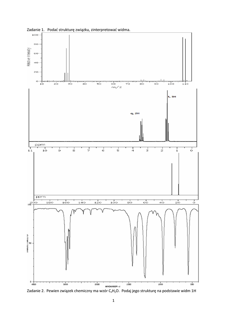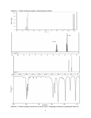 Zadanie 1. Podać strukturę związku, zinterpretować widma. Zadanie 2. Pewien związek chemiczny ma wzór CxHyO. Podaj jego strukturę na podstawie widm 1H 1 NMR, 13C NMR, IR i MS, podanych poniżej. Zinterpretuj, co się da! 2 Zadanie 3. Podać strukturę związku, zinterpretować widma. 3 Zadanie 4. Na podstawie podanych widm podaj strukturę związku. Interpretacja! 4 Zadanie 5 Podać strukturę związku, zinterpretować widma. 5 Zadanie 6. Związek ma wzór sumaryczny CxHyO3. Na podstawie podanych poniżej widm wydedukować strukturę, dokonać jak najpełniejszej interpretacji danych spektroskopowych. 6 Zadanie 7. Zinterpretuj widma i podaj strukturę odpowiadającej im substancji przeciwbólowej. Wyniki analizy elementarnej: C- 65,45%; H – 6,67%; N-8,48%. 7 Zadanie 8 Poniżej podano widma pewnej znanej od ponad 100 lat substancji o działaniu przeciwbólowym. Podaj strukturę tej substancji i dokonaj jak najpełniejszej interpretacji widm. C- 67,04%; H-7,26%; N7,82%. Masa cząsteczkowa 179. 8 Zadanie 9. Pewien znany lek o działaniu przeciwgorączkowym ma widma, jak poniżej. Podaj strukturę i dokonaj jak najpełniejszej interpretacji widm, jeżeli wyniki jego analizy elementarnej są następujące: C – 60,00% i H – 7,41%. 9 Zadanie 10. Potwierdź strukturę i dokonaj pełnej interpretacji widm lidokainy, podanych poniżej 10 11