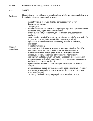 Nazwa: Pracownik rozkładający towar na półkach Kod: 933401 Synteza: Układa towary na półkach w sklepie; dba o właściwą ekspozycje towaru i estetykę obszaru ekspozycji towaru. Zadania zawodowe: • zaopatrywanie w towar działów sprzedażowych w tym dostarczanie towaru z magazynu; • układanie towaru na półkach sklepowych zgodnie z procedurami i zasadami przyjętymi w danym sklepie; • kontrolowanie etykiet cenowych i terminów przydatności do spożycia (w przypadku artykułów spożywczych) oraz terminów ważności (w przypadku kosmetyków, artykułów chemicznych itp.); • zgłaszanie kierownikowi sali sprzedaży braków w towarze, uszkodzeń w opakowaniu itp.; • transportowanie towarów wewnątrz sklepu z użyciem środków transportu wewnętrznego, takich jak wózki do palet itp.; • dbanie o właściwą ekspozycję towaru i estetykę obszaru ekspozycji towaru zgodnie z otrzymanymi instrukcjami; • obsługiwanie stosowanych narzędzi i urządzeń z zachowaniem przestrzegania instrukcji eksploatacji, w tym: skanera ręcznego, metkownicy, drabin, wózka, itp.; • wykonywanie drobnych czynności porządkowych na terenie sklepu; • przestrzeganie zasad etyki, ergonomii, bezpieczeństwa i higieny pracy oraz stosowanie przepisów prawa dotyczących ochrony przeciwpożarowej i ochrony środowiska wymaganych na stanowisku pracy.