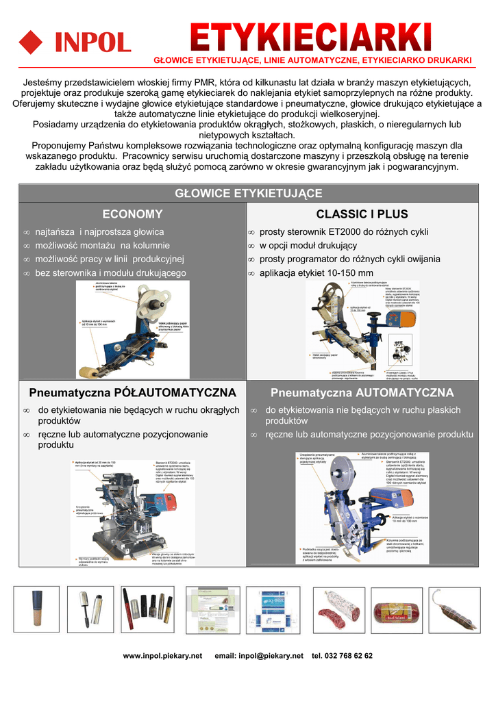 GŁOWICE ETYKIETUJĄCE, LINIE AUTOMATYCZNE, ETYKIECIARKO DRUKARKI Jesteśmy przedstawicielem włoskiej firmy PMR, która od kilkunastu lat działa w branŜy maszyn etykietujących, projektuje oraz produkuje szeroką gamę etykieciarek do naklejania etykiet samoprzylepnych na róŜne produkty. Oferujemy skuteczne i wydajne głowice etykietujące standardowe i pneumatyczne, głowice drukująco etykietujące a takŜe automatyczne linie etykietujące do produkcji wielkoseryjnej. Posiadamy urządzenia do etykietowania produktów okrągłych, stoŜkowych, płaskich, o nieregularnych lub nietypowych kształtach. Proponujemy Państwu kompleksowe rozwiązania technologiczne oraz optymalną konfigurację maszyn dla wskazanego produktu. Pracownicy serwisu uruchomią dostarczone maszyny i przeszkolą obsługę na terenie zakładu uŜytkowania oraz będą słuŜyć pomocą zarówno w okresie gwarancyjnym jak i pogwarancyjnym. GŁOWICE ETYKIETUJĄCE ECONOMY • • • • CLASSIC I PLUS • • • • najtańsza i najprostsza głowica moŜliwość montaŜu na kolumnie moŜliwość pracy w linii produkcyjnej bez sterownika i modułu drukującego Pneumatyczna PÓŁAUTOMATYCZNA • • do etykietowania nie będących w ruchu okrągłych produktów ręczne lub automatyczne pozycjonowanie produktu www.inpol.piekary.net prosty sterownik ET2000 do róŜnych cykli w opcji moduł drukujący prosty programator do róŜnych cykli owijania aplikacja etykiet 10-150 mm Pneumatyczna AUTOMATYCZNA • • do etykietowania nie będących w ruchu płaskich produktów ręczne lub automatyczne pozycjonowanie produktu email: [email protected] tel. 032 768 62 62 GŁOWICE DRUKUJĄCO ETYKIETUJĄCE Extra LM Extra PN pneumatyczna ETYKIECIARKI AUTOMATYCZNE seria 3005 do aplikacji pojedynczych etykiet. seria 3010 do aplikacji dwóch lub więcej etykiet. Przykładowe rozwiązania: OKRĄGŁE PRODUKTY PIONOWA APLIKACJA NA SPÓD PRODUKTU OKRĄGŁE PRODUKTY DWUSTRONNA DO PŁASKICH PUDEŁEK, KART Ul. Stalowa 14, 41-948 Piekary Śląskie, Poland Tel. +48 32/ 768 62 62, Fax: +48 32/ 768 69 69 NIP 498-014-65-29, REGON 277594430 www.inpol.piekary.net email: [email protected] tel. 032 768 62 62