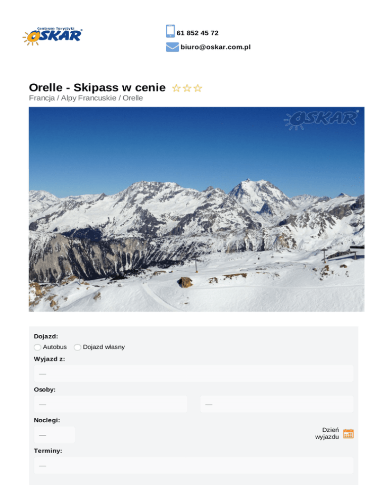 61 852 45 72 [email protected] Orelle - Skipass w cenie Francja / Alpy Francuskie / Orelle Dojazd: Autobus Dojazd własny Wyjazd z: Osoby: Noclegi: Dzień wyjazdu Terminy: Pokój: Wyżywienie: Najtańsza oferta Zaliczka do 11 marca 2017: 1774,00 zł do 11 marca 2017: 1774,00 zł Suma: 1774,00 zł Opis oferty Miejscowość Przejazd autokarem PREMIUM autokar-premium-oskar-tablet-gniazdko-usb-wygodne-fotele Opinie Realizacja imprezy autokarami PREMIUM to gwarancja: transportu autokarami z roczników 2015 i 2016 produkcji Irizar i VDL Rozkład jazdy indywidualnego, multimedialnego systemu rozrywki - tablet z dotykowym ekranem w każdym zagłówku (filmy, gry, muzyka itp.). Możliwość podłączenia własnego nośnika danych poprzez wejście AUX lub USB. najwyższej klasy skórzanych lub półskórzanych foteli z możliwością regulacji oparcia lub/i zagłówka największej w Polsce przestrzeni między siedzeniami małej półki przed każdym siedzeniem + siateczki na czasopisma, książki czy telefon bezpłatnego dostępu do sieci WiFi na terenie Polski* gniazdek elektrycznych 230V wydajnej klimatyzacji sterowanej indywidualnie bogato wyposażonego barku udostępnionego w czasie jazdy WC na pokładzie autokaru Idealna i komfortowa podróż… ZAWSZE! Na ternie Polski GWARANTUJEMY, że wszystkie przejazdy realizowane są autobusem, busem lub samochodem osobowym. Zapewnimy komfortowy transport na każdym etapie podróży. Ważne: Autokar Premium jest autokarem docelowym. *jakość usług internetowych może różnić się w zależności od jakości sygnału Orelle - opis miejscowości i tras Każdy kto decyduje się na urlop narciarski w Trois Vallés ma do wyboru wiele miejsc pobytowych. Jednym z nich jest Orelle, położony na 900 metrach wysokości ośrodek sportów zimowych, oferujący idealne warunki urlopu narciarskiego. W przeciwieństwie do sąsiedniego, kultowego ośrodka narciarskiego - Val Thorens - Orelle jest spokojniejszą miejscowością, idealną dla osób ceniących relaks i odpoczynek, po całodniowym szaleństwie na śniegu. Opis tras: zawarty w cenie SKIPASS obejmuje trasy narciarskie VAL THORENS - ORELLE narciarze do swojej dyspozycji mają ok 150 km szerokich tras w tym 30 km bardzo łatwych, 31 km łatwych, 63 km średnich, 16 km trudnych oraz 5 km tras biegowych 24 wyciągi (1 kolej linowa, 4 gondolki, 17 kolejek krzesełkowych, 2 orczyki) możliwość korzystania ze Snowparku o najwyższym poziomie - "Val Thorens Snowpark" znajdującego się w pobliżu gondoli "Gand Fond". Snowpark znajduje się na wysokości 2.500 m. 2.600 m., a jego długość to 600 m Orelle to kurort narciarski mający bezpośrednie połączenie z obszarem narciarskim Trois Vallés , co wiąże się z możliwością rozszerzenia Skipassu o dostęp na teren trzech dolin za 33,50 €/dzień aby znaleźć się na wysokości 2350 metrów w Refuge du Plan Bouchet wystarczy 15-minutowa jazda nowoczesną koleją linową 3 Vallées Expres. Stamtąd narciarze mogą dotrzeć na wysokość 3230 metrów w Sommet des Pistes, najwyżej położony punkt Trois Vallées, lub przekroczyć przejście Brèche de Rosaël na wysokości 3000 metrów oprócz sportów zimowych, dużą popularnością cieszą się w Orelle wyprawy na rakietach śnieżnych oraz piesze wędrówki oznakowanymi szlakami turystycznymi PODGLĄD NA ŻYWO - WEBCAM INTERAKTYWNA MAPA Zakwaterowanie Zakwaterowanie w Résidence Orelle 3 Doliny***. Obiekt składa się z 8 oddzielnych budynków oraz posiada 2, 4, 6, 8-osobowe pokoje. Spod rezydencji wahadłowo odjeżdża Skibus, regularnie dowożąc turystów do gondoli, którą dalej udają się w poszukiwaniu zimowego szaleństwa! W głównym budynku kompleksu znajduje się mały sklep hotelowy, niewielki bar oraz pizzeria. Wszystkie pokoje wyposażone są w łazienkę, kuchnię (płyta grzewcza, czajnik, mikro, zmywarka, naczynia oraz sztućce), TV oraz balkon. Z Internetem Wi-Fi można połączyć się przy recepcji, natomiast dostęp do sieci w apartamentach jest dodatkowo płatny. Do dyspozycji gości jest narciarnia do przechowywania sprzętu oraz centrum SPA z basenem, wirówkami i sauną. Pakiet KOMFORT gwarancja wyboru miejsca w autokarze napoje w autokarze w cenie (6 x do wyboru: kawa, herbata, zimny napój 0,2l) cena: 50 zł/os Pakiet PRESTIGE gwarancja wyboru miejsca w autokarze napoje w autokarze w cenie (6 x do wyboru: kawa, herbata, zimny napój 0,2l) pierwszeństwo wejścia na pokład autokaru nadbagaż 5 kg w cenie suchy prowiant na drogę powrotną cena: 100 zł/os Karta Dużej Rodziny www.oskar.com.pl/zalaczniki/karta_duzej_rodziny Warunki promocji FIRST MINUTE www.oskar.com.pl/zalaczniki/warunki_promocji Ubezpieczenie Warunki ubezpieczenia Bezpieczne Podróże Signal Iduna dokument do pobrania www.oskar.com.pl/zalaczniki/owu Warunki ubezpieczenia Kosztów Imprezy Turystycznej Signal Iduna dokument do pobrania www.oskar.com.pl/zalaczniki/owurg Turystyczny Fundusz Gwarancyjny W związku z powołaniem do życia w dniu 26.11.2016 Turystycznego Funduszu Gwarancyjnego każdy klient Biura Podróży Oskar zobowiązany jest do zapłaty kwoty w wysokości 10zł/os. przy każdorazowej rezerwacji imprezy turystycznej (obowiązuje od dnia 26.11.2016). Kwota przeznaczona na Turystyczny Fundusz Gwarancyjny zostanie automatycznie doliczona do wartości rezerwacji (w momencie jej dokonania). Wyjątkiem są imprezy turystyczne odbywające się w krajach posiadających granicę z Rzeczpospolitą Polską. Składka nie jest przychodem biura. Udogodnienia Klimatyzacja Regulowane fotele Tacki Multimedia Nowoczesna flota Zawodowy kierowca Pasy bezpieczeństwa Toaleta w autokarze Podnóżki Dla rodzin z dziećmi Wi-Fi Lodówka Basen kryty Blisko stoku Bez paszportu Premium Elite Spokojna okolica Region narciarski Sport Wellness/SPA Wypożyczalnia sprzętów zimowych Sporty zimowe Program ramowy Dzień 1 (piątek) Wyjazd z Polski zgodnie z rozkładem jazdy. Przejazd przez Polskę, Niemcy, Francję. Dzień 2