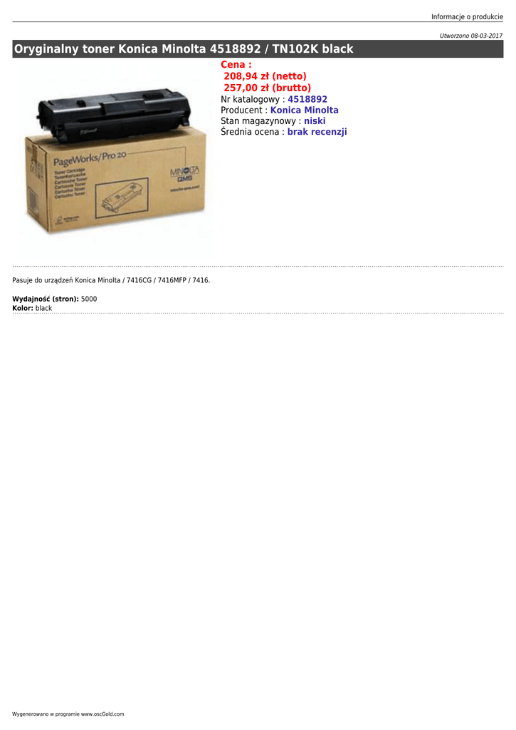 Informacje o produkcie Utworzono 08-03-2017 Oryginalny toner Konica Minolta 4518892 / TN102K black Cena : 208,94 zł (netto) 257,00 zł (brutto) Nr katalogowy : 4518892 Producent : Konica Minolta Stan magazynowy : niski Średnia ocena : brak recenzji Pasuje do urządzeń Konica Minolta / 7416CG / 7416MFP / 7416. Wydajność (stron): 5000 Kolor: black Wygenerowano w programie www.oscGold.com