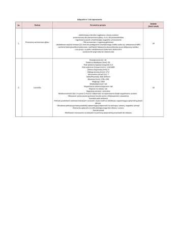 Załącznik nr 1 do zaproszenia Lp. 1. 2. Rodzaj Przenośny wzmacniacz głosu Lornetka Parametry sprzętu RAZEM (ilości sztuk) - elektretowy mikrofon nagłowny o dużej czułości - przeznaczony do wzmacniania głosu, m.in. dla przewodników - regulowany pasek umożliwiający wygodne umocowanie - 7W wzmacniacz z regulacją głośności - dodatkowe wejście liniowe (3,5 mm) do podłączenia zewnętrznego źródła audio np. odtwarzacza MP3 - zasilanie bateryjne/akumulatorowe, możliwość ładowania akumulatorów przez dołączony zasilacz - czas pracy z w pełni naładowanymi bateriami około 6-8 h - zasilanie 9V prąd stały (6 x bateria AA) 10 Powiększenie [x]: 10 Średnica obiektywu [mm]: 50 Pole widzenia kątowe [stopnie]: 6.5 Pole widzenia liniowe [m/m]: 114/1000 Źrenica wyjściowa [mm]: 5 Odstęp źrenicy [mm]: 17.2 Minimalna ostrość [m]: 7 Szkło/Pryzmaty: BaK-4/Porro Wymiary [mm]: 178 x 196 Waga [g]: 1020 Wodoodporność: tak Wypełnienie azotem/argonem: tak Wyjście na statyw: tak Regulacja ostrości: centralna Wodoszczelność (do 1 m przez 5 minut) i odporność na zaparowanie dzięki wypełnieniu azotem. - Obracane i przesuwane gumowe muszle oczne z blokowaniem ustawienia - Szerokie pole widzenia - Pokryte powłokami wielowarstwowymi soczewki i duża średnica obiektywu zapewniająca optymalną jakość obrazu - Obudowa pokryta gumową powłoką zapewniającą odporność na wstrząsy i pewny, wygodny uchwyt - Elementy optyczne ze szkła ekologicznego bez ołowiu i arsenu - Szeroki pasek - Możliwość mocowania na statywie za pomocą opcjonalnej przystawki do statywu 10