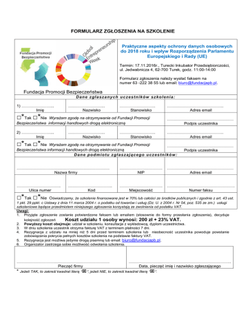 FORMULARZ ZGŁOSZENIA NA SZKOLENIE Praktyczne aspekty ochrony danych osobowych do 2018 roku i wpływ Rozporządzenia Parlamentu Europejskiego i Rady (UE) Termin: 17.11.2016r., Turecki Inkubator Przedsiębiorczości, ul. Jedwabnicza 4, 62-700 Turek, godz. 11:00-14:00 Formularz zgłoszenia należy wysłać faksem na numer 63 -222 38 55 lub email: [email protected]. Fundacja Promocji Bezpieczeństwa Dan e z g ł a sz a n y ch u c z est n i kó w sz ko l en i a: 1) …………………... Imię □* ……………………... Nazwisko …………………….. Stanowisko □* ………………………………….. Adres email Tak Nie Wyrażam zgodę na otrzymywanie od Fundacji Promocji Bezpieczeństwa informacji handlowych drogą elektroniczną ………………………………………… Podpis uczestnika 2) …………………... Imię ………………………………….. Adres email ……………………... Nazwisko …………………….. Stanowisko □*Tak □*Nie Wyrażam zgodę na otrzymywanie od Fundacji Promocji ………………………………………… Bezpieczeństwa informacji handlowych drogą elektroniczną Podpis uczestnika Dan e p o d mi o t u z g ł as z aj ą ceg o u cz es t n i kó w : …………………………………………………………. Nazwa firmy …………………………. NIP ………………………………………… Adres email ………………………….. Ulica numer …………………………. Miejscowość …………………………………………. Numer faksu ………………………….. Kod □*Tak □*Nie Oświadczamy, że szkolenie finansowane jest w 70% lub całości ze środków publicznych i zgodnie z art. 43 ust. 1 pkt. 29 ppkt. c Ustawy z dnia 11 marca 2004 r. o podatku od towarów i usług (Dz. U. z 2004 r. Nr 54, poz. 535 ze zm.) usługi szkoleniowe będące przedmiotem niniejszego zgłoszenia korzystają ze zwolnienia od podatku VAT. Uwagi: 1. Przyjęte zgłoszenie zostanie potwierdzone faksem lub emailem (stosownie do formy przesłania zgłoszenia), decyduje kolejność zgłoszeń Koszt udziału 1 osoby wynosi: 200 zł + 23% VAT. 2. Powyższy koszt obejmuje: udział w szkoleniu, konsultacje z wykładowcą, dyplom uczestnictwa. 3. W dniu szkolenia uczestnik otrzyma fakturę VAT z terminem płatności 7 dni. 4. Rezygnacja z udziału na mniej niż 5 dni przed terminem szkolenia lub nieobecność uczestnika powoduje powstanie zobowiązania pokrycia pełnych kosztów szkolenia na podstawie faktury VAT. 5. Rezygnacja jest możliwa jedynie drogą pisemną lub email: [email protected]. 6. Organizator zastrzega sobie możliwość odwołania szkolenia. …………………………………………………………. ……………………………………………………………….. Pieczęć firmy Data, pieczęć imię i nazwisko zgłaszającego * Jeżeli TAK, to zakreśl kwadrat literą ″″, jeżeli NIE, to zakreśl kwadrat literą ″″.