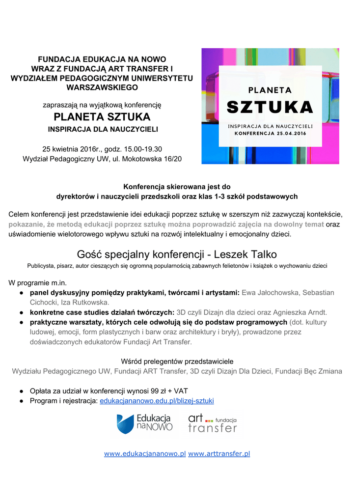 FUNDACJA EDUKACJA NA NOWO WRAZ Z FUNDACJĄ ART TRANSFER I WYDZIAŁEM PEDAGOGICZNYM UNIWERSYTETU WARSZAWSKIEGO zapraszają na wyjątkową konferencję PLANETA SZTUKA INSPIRACJA DLA NAUCZYCIELI 25 kwietnia 2016r., godz. 15.0019.30 Wydział Pedagogiczny UW, ul. Mokotowska 16/20 Konferencja skierowana jest do dyrektorów i nauczycieli przedszkoli oraz klas 13 szkół podstawowych Celem konferencji jest przedstawienie idei edukacji poprzez sztukę w szerszym niż zazwyczaj kontekście, pokazanie, że metodą edukacji poprzez sztukę można poprowadzić zajęcia na dowolny temat oraz uświadomienie wielotorowego wpływu sztuki na rozwój intelektualny i emocjonalny dzieci. Gość specjalny konferencji Leszek Talko Publicysta, pisarz, autor cieszących się ogromną popularnością zabawnych felietonów i książek o wychowaniu dzieci W programie m.in. ● panel dyskusyjny pomiędzy praktykami, twórcami i artystami: Ewa Jałochowska, Sebastian Cichocki, Iza Rutkowska. ● konkretne case studies działań twórczych: 3D czyli Dizajn dla dzieci oraz Agnieszka Arndt. ● praktyczne warsztaty, których cele odwołują się do podstaw programowych (dot. kultury ludowej, emocji, form plastycznych i barw oraz architektury i bryły), prowadzone przez doświadczonych edukatorów Fundacji Art Transfer. Wśród prelegentów przedstawiciele Wydziału Pedagogicznego UW, Fundacji ART Transfer, 3D czyli Dizajn Dla Dzieci, Fundacji Bęc Zmiana ● Opłata za udział w konferencji wynosi 99 zł + VAT ● Program i rejestracja: edukacjananowo.edu.pl/blizejsztuki www.edukacjananowo.pl www.arttransfer.pl