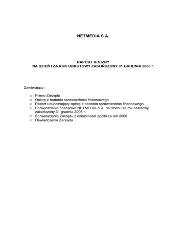NETMEDIA S.A. RAPORT ROCZNY NA DZIEŃ I ZA ROK OBROTOWY ZAKOŃCZONY 31 GRUDNIA 2006 r. Zawierający: • • • • • • Pismo Zarządu Opinię z badania sprawozdania finansowego Raport uzupełniający opinię z badania sprawozdania finansowego Sprawozdanie finansowe NETMEDIA S.A. na dzień i za rok obrotowy zakończony 31 grudnia 2006 r. Sprawozdanie Zarządu z działalności spółki za rok 2006 Oświadczenia Zarządu Drodzy Akcjonariusze, Z wielką przyjemnością przedstawiamy dokonania NETMEDIA S.A. w 2006 roku. Pod wieloma względami ubiegły rok był bardzo pozytywnym, wręcz przełomowym rokiem w historii Spółki. Spółka zrealizowała praktycznie wszystkie zaplanowane działania na 2006 r. Do najwaŜniejszych wydarzeń zaliczyć moŜna przejęcie na początku roku aktywów firmy działającej w branŜy rezerwacji miejsc noclegowych poprzez Internet, pozyskania pod koniec pierwszego kwartału finansowania w drodze podwyŜszenia kapitału zakładowego w spółce z ograniczoną odpowiedzialnością, zakup znaczących aktywów umoŜliwiających dalszy dynamiczny rozwój Spółki w wielu obszarach e-commerce, przekształcenie Spółki w połowie roku w spółkę akcyjną. Oczywiście najwaŜniejszym wydarzeniem minionego roku była publiczna emisja akcji oraz bardzo udany debiut na Giełdzie Papierów Wartościowych w Warszawie w listopadzie 2006 r., dzięki której Spółka pozyskała znaczące środki finansowe na dalszy rozwój. W konsekwencji Spółka znacznie umocniła swoją pozycję na rynku, zdywersyfikowała ryzyko związane z działaniem w jednej branŜy i odnotowała bardzo dynamiczny rozwój w stosunku do roku poprzedniego. Przychody Spółki wzrosły aŜ o 299%, a zysk netto o 544% w stosunku do 2005 roku. Spółka obecnie znajduje się w bardzo dobrej kondycji finansowej, dynamicznie się rozwija i planuje kolejne emisje akcji. Z duŜym optymizmem Zarząd patrzy w przyszłość. Dziękujemy wszystkim akcjonariuszom za zainteresowanie i wsparcie. Chcielibyśmy skorzystać równieŜ z tej okazji aby podziękować wszystkim pracownikom, współpracownikom i doradcom Spółki za pomoc i wsparcie w drodze na giełdę oraz realizacji dalszych planów Spółki. Andrzej Wierzba Prezes Zarządu Michał Pszczoła Wiceprezes Zarządu NETMEDIA Spółka Akcyjna ul. Elbląska 15/17 01 – 747 Warszawa tel. +48 (022) 560 76 50 fax. +48 (022) 560 76 63 [email protected] www.pkfconsult.com.pl OPINIA NIEZALEśNEGO BIEGŁEGO REWIDENTA dotycząca sprawozdania finansowego NETMEDIA Spółka Akcyjna w Warszawie za okres od 01.01.2006 r. do 31.12.2006 r. Podmiot wpisany na listę podmiotów uprawnionych do badania sprawozdań finansowych pod numerem 477 Sąd Rejonowy dla m.st. Warszawy XII Wydział Gospodarczy-Krajowego Rejestru Sądowego Numer KRS 0000034774 1 NETMEDIA Spółka Akcyjna ul. Elbląska 15/17 01 – 747 Warszawa tel. +48 (022) 560 76 50 fax. +48 (022) 560 76 63 [email protected] www.pkfconsult.com.pl OPINIA NIEZALEśNEGO BIEGŁEGO REWIDENTA dla Walnego Zgromadzenia, Rady Nadzorczej i Zarządu NETMEDIA Spółka Akcyjna za rok obrotowy od 01.01.2006 r. do 31.12.2006 r. Przeprowadziliśmy badanie załączonego sprawozdania finansowego NETMEDIA Spółka Akcyjna z siedzibą w Warszawie, na które składa się: wprowadzenie do sprawozdania finansowego, bilans sporządzony na dzień 31.12.2006 r., który po stronie aktywów i pasywów zamyka się sumą 6 605 tys. zł, rachunek zysków i strat za rok obrotowy od 01.01.2006 r. do 31.12.2006 r. wykazujący zysk netto w kwocie 867 tys. zł, zestawienie zmian w kapitale (funduszu) własnym za rok obrotowy od 01.01.2006 r. do 31.12.2006 r. wykazujące wzrost kapitału własnego o kwotę 6 630 tys. zł, rachunek przepływów pienięŜnych za rok obrotowy od 01.01.2006 r. do 31.12.2006 r. wykazujący wzrost stanu środków pienięŜnych o kwotę 4 518 tys. zł, dodatkowe informacje i objaśnienia. Sprawozdanie finansowe obejmuje połączone dane finansowe wynikające ze sprawozdań: - Spółki AWP Multimedia Sp. z o.o. za okres od 1 stycznia do 29 czerwca 2006 r. oraz - Spółki NETMEDIA Spółka Akcyjna za okres od 30 czerwca do 31 grudnia 2006 r. Za sporządzenie tego sprawozdania finansowego oraz sprawozdania z działalności jednostki odpowiada kierownik jednostki. Naszym zadaniem było zbadanie i wyraŜenie opinii o rzetelności, prawidłowości i jasności tego sprawozdania finansowego oraz prawidłowości ksiąg rachunkowych stanowiących podstawę jego sporządzenia. Badanie sprawozdania finansowego przeprowadziliśmy stosownie do postanowień: rozdziału 7 ustawy z dnia 29 września 1994 r. o rachunkowości (Dz. U. z 2002 r. Nr 76, poz. 694), norm wykonywania zawodu biegłego rewidenta, wydanych przez Krajową Radę Biegłych Rewidentów w Polsce. Badanie sprawozdania finansowego zaplanowaliśmy i przeprowadziliśmy w taki sposób, aby uzyskać racjonalną pewność, pozwalającą na wyraŜenie opinii o sprawozdaniu. W szczególności badanie obejmowało sprawdzenie poprawności zastosowanych przez jednostkę zasad (polityki) rachunkowości i znaczących szacunków, sprawdzenie – w przewaŜającej mierze w sposób wyrywkowy – dowodów i zapisów księgowych, z których wynikają liczby i informacje zawarte w sprawozdaniu finansowym, jak i całościową ocenę sprawozdania finansowego. Podmiot wpisany na listę podmiotów uprawnionych do badania sprawozdań finansowych pod numerem 477 Sąd Rejonowy dla m.st. Warszawy XII Wydział Gospodarczy-Krajowego Rejestru Sądowego Numer KRS 0000034774 2 NETMEDIA Spółka Akcyjna ul. Elbląska 15/17 01 – 747 Warszawa tel. +48 (022) 560 76 50 fax. +48 (022) 560 76 63 [email protected] www.pkfconsult.com.pl UwaŜamy, Ŝe badanie dostarczyło wystarczającej podstawy do wyraŜenia miarodajnej opinii. Naszym zdaniem załączone sprawozdanie finansowe, obejmujące dane liczbowe i objaśnienia słowne: przedstawia rzetelnie i jasno wszystkie informacje istotne dla oceny sytuacji majątkowej i