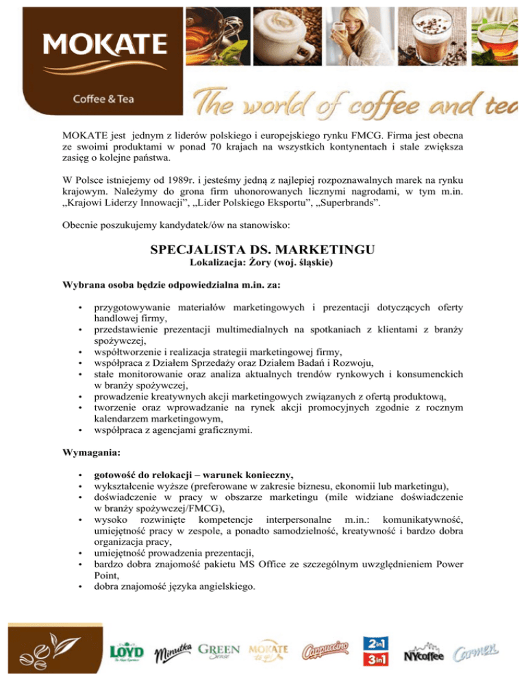 ! MOKATE jest jednym z liderów polskiego i europejskiego rynku FMCG. Firma jest obecna ze swoimi produktami w ponad 70 krajach na wszystkich kontynentach i stale zwiększa zasięg o kolejne państwa.! W Polsce istniejemy od 1989r. i jesteśmy jedną z najlepiej rozpoznawalnych marek na rynku krajowym. Należymy do grona firm uhonorowanych licznymi nagrodami, w tym m.in. „Krajowi Liderzy Innowacji”, „Lider Polskiego Eksportu”, „Superbrands”. Obecnie poszukujemy kandydatek/ów na stanowisko: SPECJALISTA DS. MARKETINGU Lokalizacja: Żory (woj. śląskie) Wybrana osoba będzie odpowiedzialna m.in. za: • • • • • • • • przygotowywanie materiałów marketingowych i prezentacji dotyczących oferty handlowej firmy, przedstawienie prezentacji multimedialnych na spotkaniach z klientami z branży spożywczej, współtworzenie i realizacja strategii marketingowej firmy, współpraca z Działem Sprzedaży oraz Działem Badań i Rozwoju, stałe monitorowanie oraz analiza aktualnych trendów rynkowych i konsumenckich w branży spożywczej, prowadzenie kreatywnych akcji marketingowych związanych z ofertą produktową, tworzenie oraz wprowadzanie na rynek akcji promocyjnych zgodnie z rocznym kalendarzem marketingowym, współpraca z agencjami graficznymi. Wymagania: • • • • • • • ! gotowość do relokacji – warunek konieczny, wykształcenie wyższe (preferowane w zakresie biznesu, ekonomii lub marketingu), doświadczenie w pracy w obszarze marketingu (mile widziane doświadczenie w branży spożywczej/FMCG), wysoko rozwinięte kompetencje interpersonalne m.in.: komunikatywność, umiejętność pracy w zespole, a ponadto samodzielność, kreatywność i bardzo dobra organizacja pracy, umiejętność prowadzenia prezentacji, bardzo dobra znajomość pakietu MS Office ze szczególnym uwzględnieniem Power Point, dobra znajomość języka angielskiego. ! Osoby zainteresowane uprzejmie prosimy o przesyłanie CV [email protected] podając w tytule maila nazwę stanowiska. na adres e-mail: Uprzejmie informujemy, że skontaktujemy się wyłącznie z wybranymi osobami. Prosimy o dopisanie następującej w CV klauzuli „Wyrażam zgodę na przetwarzanie moich danych osobowych dla potrzeb niezbędnych dla realizacji procesu rekrutacji (zgodnie z ustawą z dn. 29.08.97 roku o Ochronie Danych Osobowych Dz. Ust Nr 133 poz. 883)”. ! !