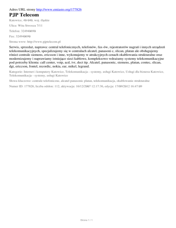 Adres URL strony http://www.emiasto.org/177826 PJP Telecom Katowice, 40-040, woj. śląskie Ulica: Wita Stwosza 7/11 Telefon: 324940690 Fax: 324940690 Strona www: http://www.pjptelecom.pl Serwis, sprzedaż, naprawa: central telefonicznych, telefonów, fax-ów, rejestratorów nagrań i innych urządzeń telekomunikacyjnych, specjalizujemy się w centralach alcatel, panasoni c, slican, platan ale obsługujemy rónież centrale siemens, ericsson i inne, wykonujemy w atrakcyjnych cenach okablowania strukturalne oraz modernizujemy i naprawiamy istniejące sieci kablowe, kompleksowo wdrażamy systemy telekomunikacyjne pod potrzeby klienta: call center, voip, acd, ivr, dect itp. Alcatel, panasonic, siemens, platan, contec, slican, dgt, ericcson, fontel, recordic, nokia, ear, mikel, legrand. Kategorie: Internet i komputery Katowice, Telekomunikacja - systemy, usługi Katowice, Usługi dla biznesu Katowice, Telekomunikacja - systemy, usługi Katowice Słowa kluczowe: centrale telefoniczne, alcatel panasonic platan, telekomunikacja, okablowanie strukturalne Numer ID: 177826, liczba odsłon: 112, aktywacja: 16/12/2007 12:17:36, edycja: 17/09/2012 16:47:09 Strona 1 / 1