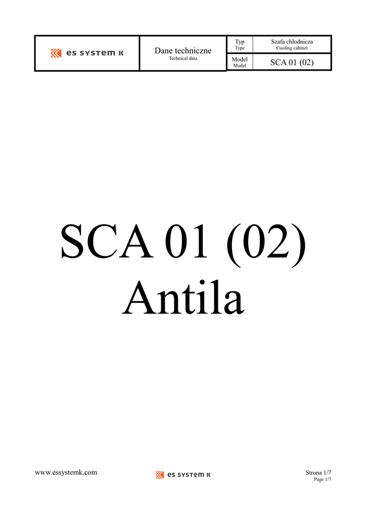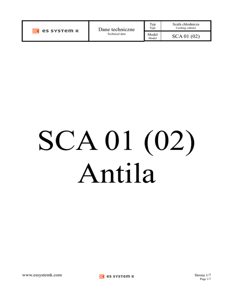 Typ Szafa chłodnicza Dane techniczne Type Cooling cabinet Technical data Model SCA 01 (02) Model SCA 01 (02) Antila www.essystemk.com Strona 1/7 Page 1/7 Typ Szafa chłodnicza Dane techniczne Type Cooling cabinet Technical data Model SCA 01 (02) Model SPIS TREŚCI: 1. Informacje ogólne.....................................................................................................................3 General information 2. Informacje elektryczne.............................................................................................................4 Electrical information 3. Informacje chłodnicze..............................................................................................................5 Cooling information 4. Wymiary....................................................................................................................................6 Dimmensions 5. Uwagi.......................................................................................................................................7 Points www.essystemk.com Strona 2/7 Page 2/7 Dane techniczne Typ Szafa chłodnicza Technical data Type Cooling cabinet Informacje ogólne Model SCA 01 (02) General information Moduł Model 400 Module Długość całkowita Total length Wysokość Height Szerokość Width Powierzchnia eksploatacyjna: półek szklanych/siatek drucianych [mm] 700 [mm] 1800 [mm] 700 [m2] 0,78 / 1,04 [dm3] 400 [kg] 150 Max. display area Pojemność użytkowa Total useful capacity Masa Net weight Typ chłodniczy Type cooling Klasa temperaturowa H1 Temperature class Zakres temperatur Temperature range [oC] +2 ÷ +10 *) Czynnik chłodniczy R404A (R507) Refrigerant Typ odmrażania naturalne Defrosting Max. dopuszczalne obciążenie pojedynczej półki szklanej/drucianej Max. load shelf / display plate *) natural [kg/m ] 2 4/8 dla warunków otoczenia: temperatura +25 [oC], wilgotność względna 60 [%], operating features are based on ambient conditions of 25 [°C] temperature and 60 [%] relative humidity, www.essystemk.com Strona 3/7 Page 3/7 Dane techniczne Typ Szafa chłodnicza Technical data Type Cooling cabinet Informacje elektryczne Model SCA 01 (02) Electrical information Napięcie zasilania 230 [V] Power supply Moduł 50 [Hz] 400 Module Moc oświetlenia Power of lighting Ilość 4 [W] 4x30 Ilość 1 Quanitity Wentylatory parownika Typ Evaporator fans Type Moc Power DP200A [W] Moduł Nominalny pobór mocy elektrycznej Nominal power consumption Nominalne zużycie energii elektrycznej Nominal electric energy consumption 21 400 Module *) Model [W] 760 [kWh/24h] 13,34 *) dla wersji z półkami szklanymi obrotowymi, version with rotated glass plates www.essystemk.com Strona 4/7 Page 4/7 Dane techniczne Typ Szafa chłodnicza Technical data Type Cooling cabinet Informacje chłodnicze Model SCA 01 (02) Cooling information R404A, (R507) Klasa klimatyczna [oC] -10 Temperatura otoczenia [oC] +35 Wilgotność względna Czynnik chłodniczy Refrigerant Temperatura odparowania Evaporating temperature Temperatura skraplania Condensing temperature Model Ambient temperature Relative humadity Prędkość powietrza Air speed Oświetlenie Lighting Moduł Klasa temperaturowa Zakres temperatur [oC] Temperature range Agregat chłodniczy Ilość czynnika [kg] Refrigerant volume Differential of temperature 60 [m/ s ] 0,15 [lx] 600 +2 ÷ +10 *) 0,46 [oC] +4 Ilość odmrażań na dobę [oC] 2 Maksymalny czas odmrażania 4 Number of defrost per 24h Maximum defrost duration Czas ociekania Dripping time Temperatura końca odmrażania End of defrosting temperature *) [%] wbudowany agregat skraplający Condensing unit Dyferencjał sterowania 25 H1 Temperature class Setting of temperature [oC] 400 Module Nastawa temperatury 3 Climatic class [min] 30 [min] 1 [oC] 11 dla warunków otoczenia: temperatura +25 [oC], wilgotność względna 60 [%], operating features are based on ambient conditions of 25 [°C] temperature and 60 [%] relative humidity, www.essystemk.com Strona 5/7 Page 5/7 Dane techniczne Typ Szafa chłodnicza Technical data Type Cooling cabinet Wymiary Model SCA 01 (02) Dimensions Model Przekrój urządzenia www.essystemk.com Strona 6/7 Page 6/7 Dane techniczne Typ Szafa chłodnicza Technical data Type Cooling cabinet Uwagi Model SCA 01 (02) Points www.essystemk.com Model Strona 7/7 Page 7/7
