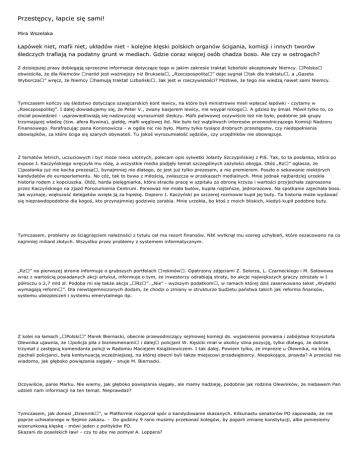 Przestępcy, łapcie się sami! Mira Wszelaka Łapówek niet, mafii niet, układów niet - kolejne klęski polskich organów ścigania, komisji i innych tworów śledczych trafiają na podatny grunt w mediach. Gdzie coraz więcej osób chadza boso. Ale czy w ostrogach? Z dzisiejszej prasy dobiegają sprzeczne informacje dotyczące tego w jakim zakresie traktat lizboński akceptowały Niemcy. �Polska� obwieściła, że dla Niemców �naród jest ważniejszy niż Bruksela�, „Rzeczpospolita�” daje sygnał �tak dla traktatu�, a „Gazeta Wyborcza�” wręcz, że Niemcy �hamują traktat Lizboński�. Jak jest w rzeczywistości? Możliwe, że tego nie wiedzą nawet sami Niemcy. Tymczasem kończy się śledztwo dotyczące szwajcarskich kont lewicy, na które byli ministrowie mieli wpłacać łapówki - czytamy w „Rzeczpospolitej”. I dalej dowiadujemy się, że Peter V., zwany kasjerem lewicy, nie wsypał nikogo�. A gdzież by śmiał. Mówił tylko to, co chciał powiedzieć - usprawiedliwiają się nadzwyczaj wyrozumiali śledczy. Mafii paliwowej oczywiście też nie było, podobnie jak grupy trzymającej władzę (tzw. afera Rywina), giełdę, mafii węglowej itd. Nie było też wątpliwych interesów przewodniczącego Komisji Nadzoru Finansowego. Parafrazując pana Kononowicza - w ogóle nic nie było. Mamy tylko tysiące drobnych przestępstw, czy niedopełnienia obowiązków, za które ściga się szarych obywateli. Tu jakoś wyrozumiałość sędziów, czy urzędników nie obowiązuje. Z tematów letnich, uczuciowych i być może nieco ulotnych, polecam opis sylwetki Jolanty Szczypińskiej z PiS. Tak, to ta posłanka, która po expose J. Kaczyńskiego wręczyła mu różę, a wszystkie media podjęły temat szczególnych zażyłości obojga. Otóż „Rz�” ogłasza, że �posłanka już nie kocha prezesa�, bynajmniej nie dlatego, że jest już tylko prezesem, a nie premierem. Poszło o sekowanie niektórych kandydatów do europarlamentu. No cóż, tak to bywa z miłością, zwłaszcza w przekazach medialnych. Mnie jednak najbardziej urzekła historia rodem z kopciuszka. Otóż, harda pielęgniarka, która straciła pracę w szpitalu za obronę krzyża i wartości przyjechała zaproszona przez Kaczyńskiego na zjazd Porozumienia Centrum. Ponieważ nie miała butów, kupiła najtańsze, jednorazowe. Na spotkanie zajechała boso. Jak wyznaje, większość delegatów wzięła ją za hipiskę. Dopiero J. Kaczyński po szczerej rozmowie kupił jej buty. Ta historia może wydawać się nieprawdopodobna dla kogoś, kto przynajmniej godziwie zarabia. Mnie urzekła, bo ktoś z moich bliskich, kiedyś kupił podobne buty. Tymczasem, problemy ze ściągnięciem należności z tytułu ceł ma resort finansów. NIK wytknął mu szereg uchybień, które oszacowano na co najmniej miliard złotych. Wszystko przez problemy z systemem informatycznym. „Rz�” na pierwszej stronie informuje o grubszych portfelach �rekinów�. Opatrzony zdjęciami Z. Solorza, L. Czarneckiego i M. Sołowowa wraz z wartością posiadanych akcji artykuł, informuje o tym, że inwestorzy odrabiają straty, bo akcje największych graczy zdrożały w I półroczu o 2,7 mld zł. Podoba mi się także akcja „�Rz�”. „Nie” - wyższym podatkom�, w ramach której dziś zaserwowano tekst „Wydatki wymagają reform�”. Dla niewtajemniczonych dodam, że chodzi o zmiany w strukturze budżetu państwa takich jak reforma finansów, systemu ubezpieczeń i systemu emerytalnego itp. Z kolei na łamach „�Polski�” Marek Biernacki, obecnie przewodniczący sejmowej komisji ds. wyjaśnienia porwania i zabójstwa Krzysztofa Olewnika ujawnia, że �policja piła z biznesmenami� i dalej� policjant W. Kęsicki miał w okolicy silna pozycję, tylko dlatego, że dobrze trzymał z zastępcą komendanta policji w Radomiu Maciejem Książkiewiczem. I tak dalej. Powiem tylko, że imprezie u Olewnika, na którą zjechali policjanci, była kontynuacją wcześniejszej, na której obecni byli także miejscowi przedsiębiorcy. Niepokojące, prawda? A przecież nie wiadomo, jak głęboko powiązania sięgały - snuje M. Biernacki. Oczywiście, panie Marku. Nie wiemy, jak głęboko powiązania sięgały, ale mamy nadzieję, podobnie jak rodzina Olewników, że niebawem Pan udzieli nam informacji na ten temat. Nieprawdaż? Tymczasem, jak donosi „Dziennik�”, w Platformie rozgorzał spór o kandydowanie skazanych. Kilkunastu senatorów PO zapowiada, że nie poprze uchwalonego w Sejmie zakazu. - Do godziny 9 rano musimy przekonać kolegów, by poparli zmianę konstytucji, albo poniesiemy wizerunkową klęskę - mówi jeden z polityków PO. Skazani do poselskich ław! - czy to aby nie pomysł A. Leppera? 1 lipca 2009 22:31