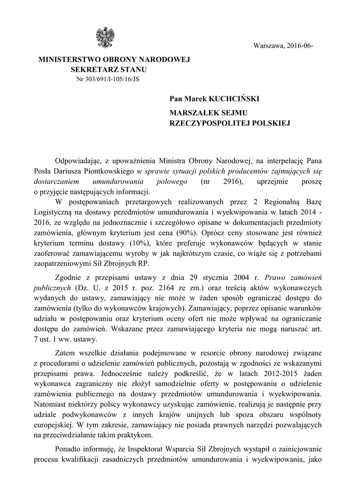 Warszawa, 2016-06- MINISTERSTWO OBRONY NARODOWEJ SEKRETARZ STANU Nr 303/691/I-105/16/JS Pan Marek KUCHCIŃSKI MARSZAŁEK SEJMU RZECZYPOSPOLITEJ POLSKIEJ Odpowiadając, z upoważnienia Ministra Obrony Narodowej, na interpelację Pana Posła Dariusza Piontkowskiego w sprawie sytuacji polskich producentów zajmujących się dostarczaniem umundurowania polowego (nr 2916), uprzejmie proszę o przyjęcie następujących informacji. W postępowaniach przetargowych realizowanych przez 2 Regionalną Bazę Logistyczną na dostawy przedmiotów umundurowania i wyekwipowania w latach 2014 2016, ze względu na jednoznacznie i szczegółowo opisane w dokumentacjach przedmioty zamówienia, głównym kryterium jest cena (90%). Oprócz ceny stosowane jest również kryterium terminu dostawy (10%), które preferuje wykonawców będących w stanie zaoferować zamawiającemu wyroby w jak najkrótszym czasie, co wiąże się z potrzebami zaopatrzeniowymi Sił Zbrojnych RP. Zgodnie z przepisami ustawy z dnia 29 stycznia 2004 r. Prawo zamówień publicznych (Dz. U. z 2015 r. poz. 2164 ze zm.) oraz treścią aktów wykonawczych wydanych do ustawy, zamawiający nie może w żaden sposób ograniczać dostępu do zamówienia (tylko do wykonawców krajowych). Zamawiający, poprzez opisanie warunków udziału w postępowaniu oraz kryterium oceny ofert nie może wpływać na ograniczanie dostępu do zamówień. Wskazane przez zamawiającego kryteria nie mogą naruszać art. 7 ust. 1 ww. ustawy. Zatem wszelkie działania podejmowane w resorcie obrony narodowej związane z procedurami o udzielenie zamówień publicznych, pozostają w zgodności ze wskazanymi przepisami prawa. Jednocześnie należy podkreślić, że w latach 2012-2015 żaden wykonawca zagraniczny nie złożył samodzielnie oferty w postępowaniu o udzielenie zamówienia publicznego na dostawy przedmiotów umundurowania i wyekwipowania. Natomiast niektórzy polscy wykonawcy uzyskując zamówienie, realizują je następnie przy udziale podwykonawców z innych krajów unijnych lub spoza obszaru wspólnoty europejskiej. W tym zakresie, zamawiający nie posiada prawnych narzędzi pozwalających na przeciwdziałanie takim praktykom. Ponadto informuję, że Inspektorat Wsparcia Sił Zbrojnych wystąpił o zainicjowanie procesu kwalifikacji zasadniczych przedmiotów umundurowania i wyekwipowania, jako 2 istotnych dla podstawowego interesu bezpieczeństwa państwa, a także o podjęcie inicjatywy ustawodawczej w zakresie zmiany definicji sprzętu wojskowego zawartej w art. 2 pkt 8a ww. ustawy, co umożliwiłoby realizację zakupów przedmiotów umundurowania i wyekwipowania, jako zamówień w dziedzinie obronności i bezpieczeństwa (art. 131a131w). Należy dodać, że na wypadek wystąpienia sytuacji kryzysowej, w Siłach Zbrojnych RP utrzymywane są stosowne ilości zapasów podstawowych przedmiotów umundurowania i wyekwipowania zabezpieczające potrzeby w tym zakresie. Bartosz KOWNACKI Do wiadomości: Pan Jacek Świderski Wicedyrektor w Sekretariacie Prezesa Rady Ministrów T-1/48/III/B10