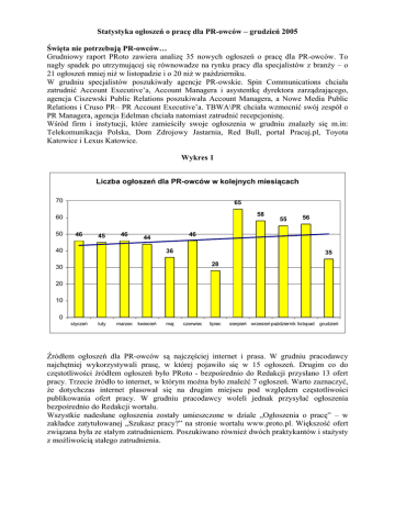 Statystyka ogłoszeń o pracę dla PR-owców – grudzień 2005 Święta nie potrzebują PR-owców… Grudniowy raport PRoto zawiera analizę 35 nowych ogłoszeń o pracę dla PR-owców. To nagły spadek po utrzymującej się równowadze na rynku pracy dla specjalistów z branży – o 21 ogłoszeń mniej niż w listopadzie i o 20 niż w październiku. W grudniu specjalistów poszukiwały agencje PR-owskie. Spin Communications chciała zatrudnić Account Executive’a, Account Managera i asystentkę dyrektora zarządzającego, agencja Ciszewski Public Relations poszukiwała Account Managera, a Nowe Media Public Relations i Cruso PR– PR Account Executive’a. TBWA\PR chciała wzmocnić swój zespół o PR Managera, agencja Edelman chciała natomiast zatrudnić recepcjonistę. Wśród firm i instytucji, które zamieściły swoje ogłoszenia w grudniu znalazły się m.in: Telekomunikacja Polska, Dom Zdrojowy Jastarnia, Red Bull, portal Pracuj.pl, Toyota Katowice i Lexus Katowice. Wykres 1 Liczba ogłoszeń dla PR-owców w kolejnych miesiącach 70 65 58 60 50 46 45 46 56 46 44 40 55 36 35 28 30 20 10 0 styczeń luty marzec kwiecień maj czerwiec lipiec sierpień wrzesień październik listopad grudzień Źródłem ogłoszeń dla PR-owców są najczęściej internet i prasa. W grudniu pracodawcy najchętniej wykorzystywali prasę, w której pojawiło się w 15 ogłoszeń. Drugim co do częstotliwości źródłem ogłoszeń było PRoto - bezpośrednio do Redakcji przysłano 13 ofert pracy. Trzecie źródło to internet, w którym można było znaleźć 7 ogłoszeń. Warto zaznaczyć, że dotychczas internet plasował się na drugim miejscu pod względem częstotliwości publikowania ofert pracy. W grudniu pracodawcy woleli jednak przysyłać ogłoszenia bezpośrednio do Redakcji wortalu. Wszystkie nadesłane ogłoszenia zostały umieszczone w dziale „Ogłoszenia o pracę” – w zakładce zatytułowanej „Szukasz pracy?” na stronie wortalu www.proto.pl. Większość ofert związana była ze stałym zatrudnieniem. Poszukiwano również dwóch praktykantów i stażysty z możliwością stałego zatrudnienia. Wykres 2 Źródło ogłoszeń 7 15 internet PRoto prasa 13 Wśród miejsc zatrudnienia pracodawcy najczęściej wymieniali województwo mazowieckie – 20 ogłoszeń, 4 oferty pochodziły z województwa dolnośląskiego, dwie - ze śląskiego, a po jednym z województw – zachodniopomorskiego, pomorskiego i małopolskiego. Sześciu ogłoszeniodawców nie wskazało miejsca zatrudnienia. Wykres 3 Miejsce oferowanej pracy - województwo 1 1 1 2 4 20 6 małopolskie pomorskie zachodniopomorskie śląskie dolnośląskie nie podano mazowieckie W grudniu poszukiwano 17 specjalistów PR – to o 9 mniej niż w listopadzie. 11 osób ma pracować na stanowiskach managera/dyrektora – o 8 mniej niż w miesiącu poprzednim, a pięć jako konsultanci/asystenci – o czterech mniej w porównaniu z listopadem. Poszukiwano także jednego stażysty i jednego konsultanta. 22 spośród 35 ogłoszeń zamieściły firmy bezpośrednio zainteresowane zatrudnieniem nowych pracowników. 10 ogłoszeń nadesłanych było przez agencje, a tylko 3 przez pośredników. Wykres 4. „Kto kogo szuka?” – instytucja zamieszczająca ogłoszenie (agencja PR/firma/pośrednik) i profil stanowiska (specjalista, manager/dyrektor PR, asystent, konsultant) Kto kogo szuka? Profil stanowiska i instytucja zamieszczająca ogłoszenie specjalista 15 3 manager/dyrektor konsultant/asystent 5 2 stażysta 1 praktykant 1 0 2 3 3 2 4 6 firma 8 agencja 10 12 14 16 18 pośrednik W grudniu pracodawcy oczekiwali od kandydatów przede wszystkim znajomości języka angielskiego (25 spośród 35 ogłoszeń). Stopniowo staje się to język konieczny do rozpoczęcia pracy w branży. W jednym ogłoszeniu podano, że oprócz znajomości angielskiego, wysoko oceniana będzie znajomość rosyjskiego. W pozostałych dwóch ogłoszeniach wskazywano odpowiednio na znajomość języka francuskiego i rosyjskiego wraz z ukraińskim. W 7 ogłoszeniach nie podano oczekiwań dotyczących znajomości języka (Wyk. 5). Wykres 5 Wymagana znajomość języków obcych 1 1 1 7 francuski rosyjski i angielski rosyjski i ukraiński nie podano angielski 25 W grudniu w branży media/reklama/PR pojawiło się 13 ogłoszeń. Trzeba zaznaczyć, że w większości były to ogłoszenia zamieszczane przez agencje PR. 4 oferty dotyczyły pracy w branży usługowej. Po 3 ogłoszenia zamieścili pracodawcy związani z branżą healthcare i handel (Wyk. 6). Wykres 6 Branża, w której oferowano zatrudnienie 1 1 1 motoryzacja 1 nie podano 2 telekomunikacja 13 2 wydawnictwo produkcja 2 ubezpieczenia, finanse inne 2 organizacja handel heathcare 3 4 usługi 3 media i marketing Ze względu na dużą rozbieżność w nazwach stanowisk zajmowanych przez PR-owców, nie została sformułowana zamknięta lista stanowisk. W tym miesiącu wymieniane były następujące nazwy stanowisk: - Account Executive - Account Manager - Asystent ds. PR - Asystent/ka dyrektora zarządzającego w agencji PR - Junior Communication Manager - Kierownik Zespołu w Biurze Public Relations - New Business Assistant - PR & Communication Assistant - PR Account Executive - PR Coordinator - PR Manager - PR/Marketing Specialist - Praktykant do działu PR - Product Manager - PR-owiec - Recepcjonista - Specjalista ds. komunikacji i PR - Specjalista ds. komunikacji i public affairs na Europę Wschodnią i Środkową - Specjalista ds. kontaktów z mediami - Specjalista ds. Marketingu - Specjalista ds. Marketingu i PR - Specjalista ds. Promocji - Specjalista ds. promocji i PR - Specjalista ds. Public Relations Stażysta w dziale Marketingu i PR Team Manager Współpracownik agencji PR Metodologia badania Analiza ogłoszeń o pracę obejmuje publikacje z polskimi ofertami pracy w branży PR na różnych stanowiskach. Ogłoszenia pochodzą z: • tytułów aktualnie monitorowanych przez Instytut Monitorowania Mediów 