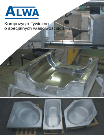 ALWA Kompozycje żywiczne o specjalnych właściwościach 2 FORMY O BARDZO WYSOKICH PARAMETRACH WYTRZYMAŁOŚCI MECHANICZNEJ I TERMICZNEJ (ALWA-MOULD H) Formy wykonane z kompozycji ALWA-MOULD H mają zastosowania w następujących technikach wytwarzania: prasowanie na gorąco (kompozyty, SMC) formy do wtrysku termoplastów, proces gorącej rdzennicy (HOT-BOX), wulkanizacja. Podstawowe zalety żywicy ALWA-MOULD H to: - praktycznie zerowy skurcz, - brak limitu ilości wylewanej kompozycji, - wytrzymałość cieplna TG = 310 C, - możliwość zatopienia układu chłodzącego w żywicy. 3 FORMY DO TERMOFORMOWANIA (ALWA-MOULD D, ALWA-MOULD V) Jednym z zastosowań kompozycji ALWA-MOULD D oraz ALWA-MOULD V jest wykonywanie form do termoformowania. Szybkie wykonanie poprawnie działających form produkcyjnych umożliwiają następujące cechy tych kompozycji: brak skurczu, wytrzymałość cieplna HDT > 180 C, możliwość wymieszania i odlania dowolnej ilości materiału, możliwość zatopienia w żywicy układu chłodzącego, niska lepkość mieszaniny. 4 FORMY DO WYKONYWANIA LAMINATÓW (ALWA-MOULD T, ALWA-MOULD D) Podstawową zaletą żywicy ALWA-MOULD T przy wykonywaniu form metodą laminowania jest brak skurczu co powoduje uzyskanie przez powierzchnie żelkotu idealnej gładkości. Struktura laminatu ALWA-MOULD T (w wyniku reakcji egzotermicznej) jest całkowicie pozbawiona pęcherzy powietrza, a w wyniku dodatkowego wygrzewania osiąga wytrzymałość cieplną 135 C. Uzyskanie niezwykle wysokiej sztywności formy (formowanie wtryskiem) jest możliwe za pomocą mieszaniny żywicy ALWA-MOULD D ze specjalną kompozycją wypełniaczy. 5 INNE ZASTOSOWANIA: Wykorzystując kompozycje odlewnicze ALWA-MOULD D lub ALWA-MOULD V można wykonać formy produkcyjne do wielu innych zastosowań. W przypadku konieczności otrzymania bardzo odpornej powierzchni możemy zastosować technikę natrysku metalu za pomocą maszyny ALWA A-100. Uzyskujemy wtedy twardą, odporną termicznie i chemicznie powierzchnię o wysokim połysku. Formy do rozdmuchu Formy do produkcji pianek PU 6 Formy do produkcji spodów obuwniczych Metalizacja metodą natrysku OFERUJEMY: - Akrylowe kompozycje odlewnicze - Akrylowe kompozycje do laminowania - Żelkoty - Kompozycje buforowe - Szybko utwardzalne kompozycje PU - Spienialne, odlewnicze kompozycje PU - Wypełniacze - Środki rozdzielające - Urządzenia do metalizacji natryskowej Przedstawiciel w Polsce: AMOD - Andrzej Modrzewski ul. Rydygiera 8, 01-793 Warszawa tel./fax (0-22) 633 85 06 tel. (0-22) 669 39 76 tel. kom. 0-602 26 11 15 INTERNET: http://www.amod.com.pl e-mail: [email protected]