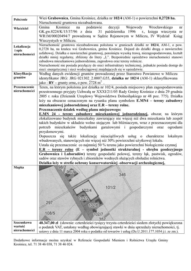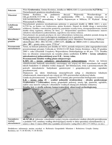 Położenie Właściciel Lokalizacja i opis nieruchomości Klasyfikacja gruntów Przeznaczenie nieruchomości Wieś Grabownica, Gmina Krośnice, działka nr 102/4 (AM-1) o powierzchni 0,2728 ha. Nieruchomość gruntowa niezabudowana. Gmina Krośnice na podstawie decyzji Wojewody Wrocławskiego nr GK.gw.8224/K/15/37/96 z dnia 31 października 1996 r., księga wieczysta nr WR1M/00020494/7 prowadzoną w Sądzie Rejonowym w Miliczu, IV Wydział Ksiąg Wieczystych w Miliczu. Nieruchomość gruntowa niezabudowana położona w granicach działki nr 102/4, AM-1, o pow. 0,2728 ha, na krańcu wsi Grabownica, gmina Krośnice. Dojazd do działki drogą o nawierzchni asfaltowej. Działka o nawierzchni gruntowej, porośnięta wysoką trawą, niezagospodarowana, kształt działki mniej regularny, zbliżony do litery „L”. Bezpośrednie sąsiedztwo nieruchomości stanowi zabudowa mieszkaniowa jednorodzinna, zagrodowa oraz tereny rolnicze. Nieruchomość nie posiada przyłączy do sieci infrastruktury technicznej, jednakże posiada dostęp do sieci: energetycznej i sieci wodociągowej znajdujących się w sąsiedztwie. Według danych ewidencji gruntów prowadzonej przez Starostwo Powiatowe w Miliczu identyfikator JRG: JRG 021302_2.0007.G55, działka nr 102/4 (AM-1) sklasyfikowana jako : RV – grunty orne, o pow. 2728 m2 . Teren, na którym położona jest działka nr 102/4, posiada miejscowy plan zagospodarowania przestrzennego przyjęty Uchwałą nr XXXI/211/05 Rady Gminy Krośnice z dnia 29 grudnia 2005 r. roku (Dziennik Urzędowy Województwa Dolnośląskiego nr 48 poz. 775). Działka leży na obszarze oznaczonym na rysunku planu symbolem E.MN4 – tereny zabudowy mieszkaniowej jednorodzinnej oraz E.R – tereny rolne. Przeznaczenie działek według planu miejscowego: E.MN 24 - tereny zabudowy mieszkaniowej jednorodzinnej, obszar, na którym zlokalizowano budynek mieszkalny zawierający nie więcej niż dwa mieszkania lub zespół takich budynków w układzie wolno stojącym lub bliźniaczym, wraz z przeznaczonymi dla potrzeb mieszkańców budynkami garażowymi i gospodarczymi oraz ogrodami przydomowymi. Dopuszcza się także lokalizację nieuciążliwych usług o charakterze lokalnym wbudowanych, stanowiących nie więcej niż 30% powierzchni użytkowej lokalu. Ustala się przeznaczenie co najmniej 50 % terenu jako powierzchni biologicznie czynnej E.R – tereny rolne (E – symbol jednostki strukturalnej - obrębu geodezyjnego Grabownica i Luboradów) tereny gospodarki polowej, tereny łąk, pastwisk, ogrodów, sadów oraz stawów rybnych i zbiorników wodnych służących obsłudze rolnictwa. Działka leży w strefie ochrony konserwatorskiej -obserwacji archeologicznej, Mapka Szacunkowa wartość nieruchomości 40.347,00 zł (słownie: czterdzieści tysięcy trzysta czterdzieści siedem złotych) powiększona o podatek VAT, ustalony według obowiązującej stawki w dniu sprzedaży nieruchomości, tj. ustawy z dnia 11 marca 2004 roku o podatku od towarów i usług (Dz.U.2011.177.1054 j.t. ze zm.). Dodatkowe informacje można uzyskać w Referacie Gospodarki Mieniem i Rolnictwa Urzędu Gminy Krośnice, tel. 71 38 46 038, 71 38 46 024.