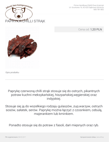 Firma Handlowa EMAS Ewa Krzemyk Ul. Gruntowa 16, 42-520 Dąbrowa Górnicza 500 787 802 PAPRYKA CHILLI STRĄK Cena od: 1,20 PLN Opis produktu Paprykę czerwoną chilli strąk stosuje się do ostrych, pikantnych potraw kuchni meksykańskiej, hiszpańskiej,węgierskiej oraz indyjskiej. Stosuje się ją do wszelkiego rodzaju gulaszów, zup,warzyw, ostrych sosów, sałatek, serów. Paprykę można łączyć z czosnkiem, cebulą, majerankiem lub kminkiem. Ponadto stosuje się do potraw z fasoli, dań mięsnych oraz ryb. Plik wygenerowano: 08-03-2017 Oprogramowanie sklepu: AptusShop Firma Handlowa EMAS Ewa Krzemyk Ul. Gruntowa 16, 42-520 Dąbrowa Górnicza 500 787 802 Jest bardzo zdrowa substancje kture zawiera mają korzystny wpływ na nasze zdrowie poprawia proces trawieniazawiera witaminy z grupy B oraz witaminę C i A. Warianty produktu 20g 1,20 PLN CENA 60,00 PLN/1KG 50g 2,60 PLN CENA 52,00 PLN/1KG 100g 5,00 PLN CENA 50,00 PLN/1KG Plik wygenerowano: 08-03-2017 Powered by TCPDF (www.tcpdf.org) Oprogramowanie sklepu: AptusShop