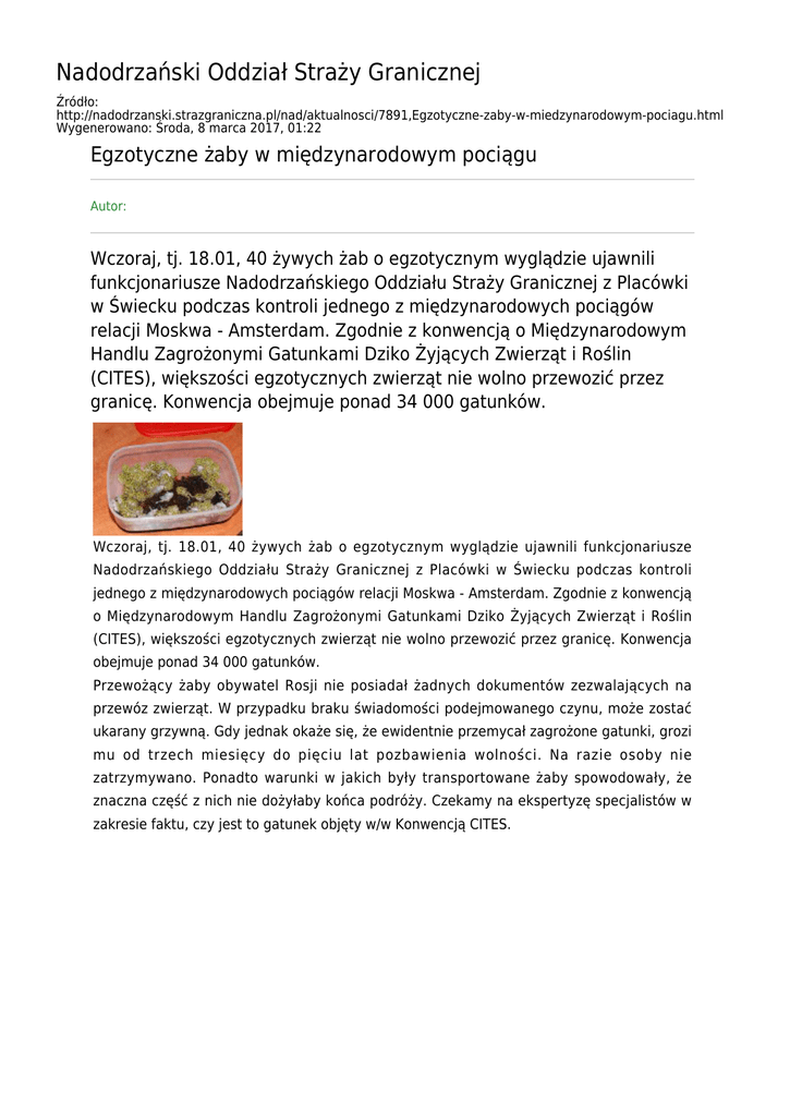 Nadodrzański Oddział Straży Granicznej Źródło: http://nadodrzanski.strazgraniczna.pl/nad/aktualnosci/7891,Egzotyczne-zaby-w-miedzynarodowym-pociagu.html Wygenerowano: Środa, 8 marca 2017, 01:22 Egzotyczne żaby w międzynarodowym pociągu Autor: Wczoraj, tj. 18.01, 40 żywych żab o egzotycznym wyglądzie ujawnili funkcjonariusze Nadodrzańskiego Oddziału Straży Granicznej z Placówki w Świecku podczas kontroli jednego z międzynarodowych pociągów relacji Moskwa - Amsterdam. Zgodnie z konwencją o Międzynarodowym Handlu Zagrożonymi Gatunkami Dziko Żyjących Zwierząt i Roślin (CITES), większości egzotycznych zwierząt nie wolno przewozić przez granicę. Konwencja obejmuje ponad 34 000 gatunków. Wczoraj, tj. 18.01, 40 żywych żab o egzotycznym wyglądzie ujawnili funkcjonariusze Nadodrzańskiego Oddziału Straży Granicznej z Placówki w Świecku podczas kontroli jednego z międzynarodowych pociągów relacji Moskwa - Amsterdam. Zgodnie z konwencją o Międzynarodowym Handlu Zagrożonymi Gatunkami Dziko Żyjących Zwierząt i Roślin (CITES), większości egzotycznych zwierząt nie wolno przewozić przez granicę. Konwencja obejmuje ponad 34 000 gatunków. Przewożący żaby obywatel Rosji nie posiadał żadnych dokumentów zezwalających na przewóz zwierząt. W przypadku braku świadomości podejmowanego czynu, może zostać ukarany grzywną. Gdy jednak okaże się, że ewidentnie przemycał zagrożone gatunki, grozi mu od trzech miesięcy do pięciu lat pozbawienia wolności. Na razie osoby nie zatrzymywano. Ponadto warunki w jakich były transportowane żaby spowodowały, że znaczna część z nich nie dożyłaby końca podróży. Czekamy na ekspertyzę specjalistów w zakresie faktu, czy jest to gatunek objęty w/w Konwencją CITES.