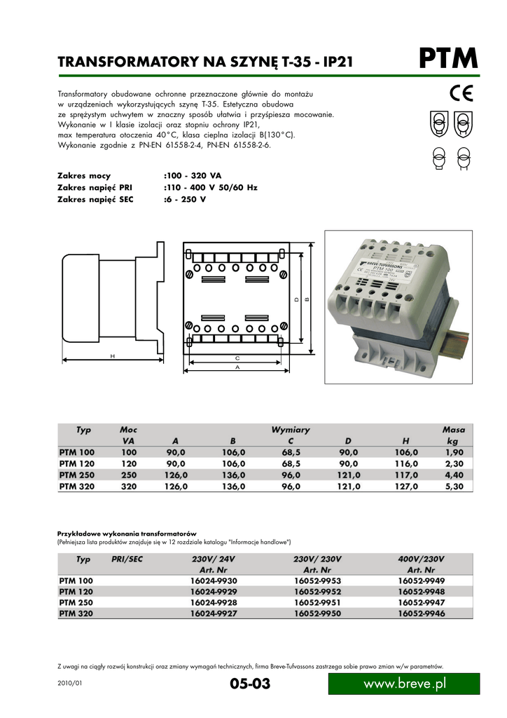TRANSFORMATORY NA SZYNĘ T-35 - IP21 PTM Transformatory obudowane ochronne przeznaczone głównie do montażu w urządzeniach wykorzystujących szynę T-35. Estetyczna obudowa ze sprężystym uchwytem w znaczny sposób ułatwia i przyśpiesza mocowanie. Wykonanie w I klasie izolacji oraz stopniu ochrony IP21, max temperatura otoczenia 40°C, klasa cieplna izolacji B(130°C). Wykonanie zgodnie z PN-EN 61558-2-4, PN-EN 61558-2-6. H B :100 - 320 VA :110 - 400 V 50/60 Hz :6 - 250 V D Zakres mocy Zakres napięć PRI Zakres napięć SEC C A Przykładowe wykonania transformatorów (Pełniejsza lista produktów znajduje się w 12 rozdziale katalogu "Informacje handlowe") Z uwagi na ciągły rozwój konstrukcji oraz zmiany wymagań technicznych, firma Breve-Tufvassons zastrzega sobie prawo zmian w/w parametrów. 2010/01 05-03