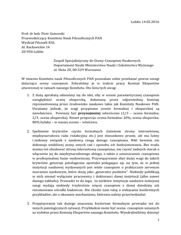 Lublin 14.02.2016 Prof. dr hab. Piotr Gutowski Przewodniczący Komitetu Nauk Filozoficznych PAN Wydział Filozofii KUL Al. Racławickie 14 20-950 Lublin Zespół Specjalistyczny do Oceny Czasopism Naukowych Departament Nauki Ministerstwa Nauki i Szkolnictwa Wyższego ul. Hoża 20, 00-529 Warszawa W imieniu Komitetu nauk Filozoficznych PAN pozwalam sobie przekazać pewne uwagi dotyczące oceny czasopism. Zebraliśmy je w trakcie pracy Komisji Ekspertów utworzonej w ramach naszego Komitetu. Oto lista tych uwag: 1. Z dużą aprobatą odnosimy się do idei, aby w ocenie parametrycznej czasopism uwzględniać ocenę ekspercką, dokonaną przez odpowiednią komisję reprezentowaną przez środowisko naukowe takie jak Komitety Naukowe PAN. Uważamy jednak, że wagi przypisane ocenie formalnej i eksperckiej są niewłaściwe. Powinny być przynajmniej odwrócone (1/3 – ocena formalna; 2/3- ocena ekspercka). Nawet proporcja: ocena formalna: 20%; ocena ekspercka: 80% byłaby – w naszej ocenie – właściwa. 2. Spełnienie kryteriów czysto formalnych (istnienie strony internetowej, międzynarodowa rada redakcyjna etc.) jest stosunkowo proste, ale ma luźny i znikomy związek z naukową rangą danego czasopisma. Nikt bowiem nie dokonuje wnikliwej oceny owych rad i sposobu ich funkcjonowania. Bez trudu można też zbudować stronę internetową czasopisma, nie czynić żadnych starań o włączenie jej do międzynarodowego obiegu, a także o umieszczenie czasopisma w profesjonalnej bazie wydawniczej. Przywiązywanie zbyt dużej wagi do takich kryteriów generuje patologiczne zjawiska polegające np. na tym, że w jednej instytucji naukowej wydawanych jest wiele czasopism o praktycznie zerowym znaczeniu naukowym, które służą jako „generator punktów”. Niekiedy publikują w nich niemal wyłącznie pracownicy i doktoranci danej instytucji (albo nawet danego zakładu). Prowadzi to do tego, że niektóre instytucje naukowe mniejszej rangi wydają niekiedy trzykrotnie więcej czasopism z danej dziedziny niż renomowane ośrodki badawcze. Nie chodzi nam tutaj o wskazanie konkretnych przykładów, ale o ukazanie mechanizmu, któremu należy przeciwdziałać. 3. Przypisywanie tak dużego znaczenia kryteriom formalnym prowadzi też do innych patologicznych sytuacji. Przykładem może być ocena czasopism uznanych za wybitne przez Komisję Ekspertów naszego Komitetu. Wyodrębniliśmy dziesięć 1 takich czasopism, spośród których trzy znalazły się też na liście C, a spośród kolejnych siedmiu jedno uzyskało ostateczną ocenę 8 punktów (Poznańskie Studia z Filozofii Nauki), drugie 14 punktów (Roczniki Filozoficzne), a ocena pozostałych pięciu oscyluje między 10 a 11 punktami. W naszej opinii punktacja tych czasopism jest zdecydowanie zaniżona w stosunku do ostatecznej oceny wielu czasopism uznanych przez nas za ważne. Rozumiemy, że nie można zmieniać reguł oceny w jej trakcie, ale nawet w obecnym rankingu warto uwzględnić przynajmniej tę okoliczność, że niektóre z tych czasopism (np. Przegląd Filozoficzny. Nowa Seria czy Zagadnienia Naukoznawstwa) znajdowały się poprzednio liście ERIH i z niejasnych powodów obecnie oceniane były według kryteriów listy B. Ich redaktorzy nie mieli świadomości, że muszą zabiegać o spełnienie właśnie tych kryteriów. 4. Pragniemy podkreślić, że w przypadku Komisji Komitetu Nauk Filozoficznych PAN ocena ekspercka przeprowadzona została bardzo rzetelnie, przez dużą liczbę osób i ukształtowała się po długich dyskusjach. W tym kontekście, trudno nam zgodzić się zwłaszcza ze stosunkowo niską punktacją Przeglądu Filozoficznego. Nowa Seria, który – pomijając dwa wyżej ocenione przez nas czasopisma, znajdujące się obecnie na liście C – uznaliśmy za należące do najściślejszej czołówki kilku najbardziej prestiżowych polskich czasopism filozoficznych. 5. Przy okazji pragniemy zwrócić uwagę na to, że aby ocena ekspercka spełniała standardy rzetelności, konieczne jest wprowadzenie regulacji dotyczącej minimalnej liczby ekspertów będących członkami danej komisji. W wypadku Komitetu Nauk Filozoficznych było to 19 osób, których oceny – odpowiednio uśrednione i zagregowane – stały się podstawą do odpowiedniego sklasyfikowania czasopism. Odpowiednio liczna komisja pozwala na wyeliminowanie błędów, wynikających z braku pełnej wiedzy czy (co jest do pewnego stopnia nieuchronne) indywidualnych preferencji. Powoływane komisje powinny być więc reprezentatywne. Oczywiście, liczba 19 ekspertów jest zapewne zbyt wysoka – jednak w wypadku Komitetu Nauk Filozoficznych PAN, takie rozwiązanie sprawdziło się znakomicie. 6. W regułach oceny eksperckiej błędny jest też sztuczny podział na jedynie trzy kategorie: wybitne, ważne, pozostałe. Lepsza byłaby po prostu zwykła skala liczbowa (np. 0-10 pkt). Ponadto, na liście czasopism, którą oceniała nasza grupa ekspertów znalazło się około 200 czasopism, z czego co najwyżej 30% można uznać za filozoficzne. Skutkiem tego część czasopism, które oceniliśmy bardzo nisko jako filozoficzne, uzyskało ostatecznie stosunkowo dobre noty, ponieważ zostały ocenione pozytywnie np. jako czasopismo socjologiczne, kulturoznawcze, literaturoznawcze, teologiczne czy psychologiczne. Prowadzi to do zaburzeń w ostatecznym rankingu czasopism i ma niebagatelny wpływ na rozwój 2 poszczególnych dyscyplin. Autorzy wybierają bowiem czasopisma wyżej punktowane i starają się spełnić standardy wyznaczone przez ich redakcje. Nie jest też jasne, dlaczego naszemu komitetowi przypisano do oceny czasopisma z dziedziny religioznawstwa i nauk teologicznych, a nie np. socjologii i psychologii czy psychologii i literaturoznawstwa. 7. Odrębną, a niezwykle ważną sprawą jest niesprawiedliwa proporcja między liczbą czasopism o najwyższej punktacji na liście A reprezentujących odmienne dyscypliny. Ma to ogromne znaczenie wszędzie t