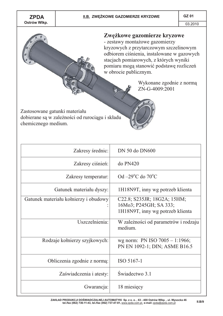 ZPDA II.B. ZWʯKOWE GAZOMIERZE KRYZOWE GZ 01 Ostrów Wlkp. 03.2010 Zwê¿kowe gazomierze kryzowe - zestawy monta¿owe gazomierzy kryzowych z przytarczowym szczelinowym odbiorem ciœnienia, instalowane w gazowych stacjach pomiarowych, z których wyniki pomiaru mog¹ stanowiæ podstawê rozliczeñ w obrocie publicznym. Wykonane zgodnie z norm¹ ZN-G-4009:2001 Zastosowane gatunki materia³u dobierane s¹ w zale¿noœci od ruroci¹gu i sk³adu chemicznego medium. Zakresy œrednic: DN 50 do DN600 Zakresy ciœnieñ: do PN420 Zakresy temperatur: Od –29oC do 70oC Gatunek materia³u dyszy: 1H18N9T, inny wg potrzeb klienta Gatunek materia³u ko³nierzy i obudowy : C22.8; S235JR; 18G2A; 15HM; 16Mo3; P245GH; SA 333; 1H18N9T, inny wg potrzeb klienta Uszczelnienia: Rodzaje ko³nierzy szyjkowych: Obliczenia zgodnie z norm¹: Zaœwiadczenia i atesty: Gwarancja: W zale¿noœci od parametrów i rodzaju medium. wg norm: PN ISO 7005 – 1:1966; PN EN 1092-1; DIN; ASME B16.5 ISO 5167-1 Œwiadectwo 3.1 18 miesiêcy ZAK£AD PRODUKCJI DOŒWIADCZALNEJ AUTOMATYKI Sp. z o. o. , 63 - 400 Ostrów Wlkp. , ul. Wysocka 46 tel./fax (062) 736-11-43, tel./fax (062) 737-47-81, www.zpda.com.pl, e-mail: [email protected] II.B/9