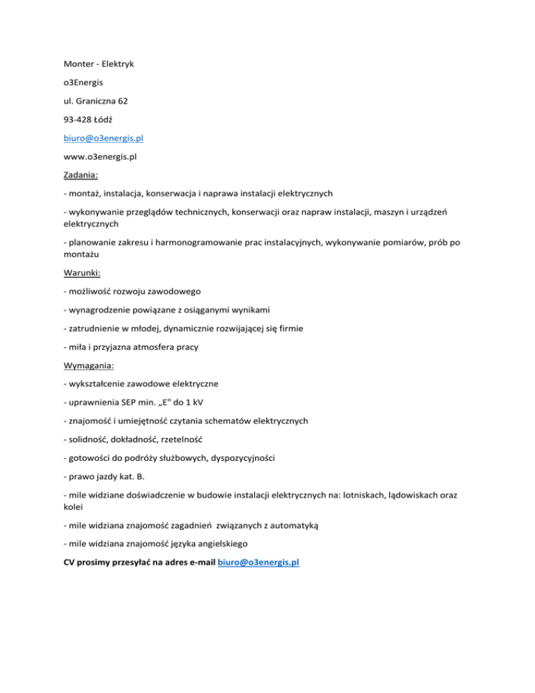 Monter - Elektryk o3Energis ul. Graniczna 62 93