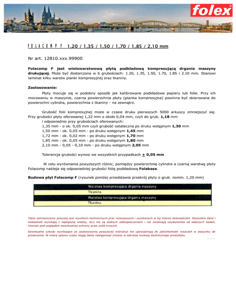 FOLACOMP F 1,20 / 1,35 / 1,50 / 1,70 / 1,85 / 2,10 mm Nr art. 12810.xxx.99900 Folacomp F jest wielowarstwow p yt podk adow kompresuj drgania maszyny drukuj cej. Mo e by dostarczona w 6 grubo ciach: 1.20, 1.35, 1.50, 1.70, 1.85 i 2.10 mm. Stanowi laminat kilku warstw pianki kompresyjnej oraz tkaniny. Zastosowanie: yty mocuje si w podobny sposób jak kalibrowane podk adowe papiery lub folie. Przy ich mocowaniu w maszynie, czarna powierzchnia p yty (pianka kompresyjna) powinna by skierowana do powierzchni cylindra, powierzchnia z tkaniny - na zewn trz. Grubo folii kompresyjnej mo e w czasie druku pierwszych 5000 arkuszy zmniejszy Przy grubo ci p yty oferowanej 1,22 mm o oko o 0,04 mm, czyli do grub. 1,18 mm i odpowiednio przy grubo ciach oferowanych: 1,35 mm - o ok. 0,05 mm czyli grubo ostateczna po druku wst pnym 1,30 mm 1,50 mm - ok. 0,05 mm - po druku wst pnym 1,45 mm 1,72 mm - ok. 0,02 mm - po druku wst pnym 1,70 mm 1,85 mm - ok. 0,05 mm - po druku wst pnym 1,80 mm 2,10 mm - 0,05 - 0,10 mm - po druku wst pnym 2,05 mm si . Tolerancja grubo ci wynosi we wszystkich przypadkach + 0,05 mm W celu wyrównania powy szych ró nic, pomi dzy powierzchni cylindra a czarn warstw p yty Folacomp nakleja si odpowiedniej grubo ci foli podk adow Folabase. Budowa p yt Folacomp F (rysunek poni ej przedstawia przekrój p yty o grub. nomin. 1,20 mm) Tekst zamieszczony powy ej jest wynikiem technicznych prac rozwojowych i uzyskanych w tej mierze do wiadcze . Wszystkie dane i wskazówki wynikaj z najlepszej wiedzy, lecz nie s adnym zabezpieczeniem i nie uwalniaj u ytkownika od w asnych bada , równie pod wzgl dem ewentualnej ochrony praw osób trzecich. Ewentualne szkody wynikaj ce ze zastosowania powy szej instrukcji nie upowa niaj do jakichkolwiek roszcze producenta. W miar up ywu czasu mog tak e nast powa zmiany w zakresie rozwoju technicznego produktów. w stosunku do 08.2012