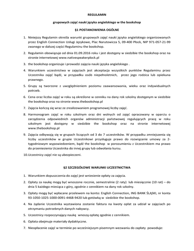REGULAMIN grupowych zajęć nauki języka angielskiego w the bookshop §1 POSTANOWIENIA OGÓLNE 1. Niniejszy Regulamin określa warunki grupowych zajęć nauki języka angielskiego organizowanych przez English Connection Usługi Językowe, Plac Narutowicza 5, 09-400 Płock, NIP 971-057-21-99 zwanego w dalszej części Regulaminu the bookshop. 2. Regulamin obowiązuje od dnia 01.09.2016 roku i jest dostępny w siedzibie the bookshop oraz na stronie internetowej www.nativespeakerplock.pl 3. the bookshop organizuje i prowadzi zajęcia nauki języka angielskiego . 4. Warunkiem uczestnictwa w zajęciach jest akceptacja wszystkich punktów Regulaminu przez Uczestnika zajęć bądź, w przypadku osób niepełnoletnich, przez jego rodzica lub opiekuna prawnego. 5. Grupy są tworzone z uwzględnieniem poziomu zaawansowania, wieku oraz indywidualnych potrzeb. 6. Cena oraz liczba zajęć w roku są określone w cenniku na dany rok szkolny dostępnym w siedzibie the bookshop oraz na stronie www.thebookshop.pl 7. Zajęcia kończą się wraz ze zrealizowaniem programowej liczby zajęć. 8. Harmonogram zajęć w roku szkolnym oraz dni wolnych od zajęć opracowany w oparciu o zarządzenia odpowiednich organów administracji państwowej regulujących pracę w roku szkolnym jest dostępny w siedzibie the bookshop oraz na stronie internetowej www.thebookshop.pl 9. Zajęcia odbywają się w grupach liczących od 3 do 7 uczestników. W przypadku zmniejszenia się liczby uczestników w grupie Uczestnikowi przysługuje prawo do rozwiązanie umowy za 2tygodniowym wypowiedzeniem, bądź the bookshop w porozumieniu z Uczestnikiem ma prawo do przeniesienia Uczestnika do innej grupy lub odwołania kursu. 10.Uczestnicy zajęć nie są ubezpieczeni. §2 SZCZEGÓŁOWE WARUNKI UCZESTNICTWA 1. Warunkiem dopuszczenia do zajęć jest wniesienie opłaty za zajęcia. 2. Opłaty za naukę mogą być wnoszone rocznie, semestralnie (2 raty) lub miesięcznie (10 rat) – do dnia 5 każdego miesiąca z góry, zgodnie z cennikiem na dany rok szkolny. 3. Opłaty mogą być wpłacane przelewem na konto: English Connection, ING BANK ŚLĄSKI, nr konta 93-1050-1025-1000-0091-4468-9420 lub gotówką w siedzibie the bookshop. 4. Na żądanie Uczestnika wystawiona zostanie faktura na kwoty opłat za udział w zajęciach po otrzymaniu potrzebnych danych nabywcy. 5. Uczestnicy rozpoczynający naukę wnoszą opłatę zgodnie z cennikiem. 6. Opłata obejmuje materiały dydaktyczne. 7. Nieopłacenie zajęć w terminie po wcześniejszym pisemnym wezwaniu do zapłaty powoduje: Niedopuszczenie Uczestnika do zajęć, do momentu uregulowania zaległości Skreślenie z listy uczestników jeśli zaległości wynoszą wartość dwóch miesięcznych rat 8. Obowiązek wnoszenia opłat ustaje po miesiącu, w którym uczestnik przestaje uczęszczać na zajęcia, pod warunkiem, że rodzic/ opiekun prawny powiadomi the bookshop o terminie rezygnacji z co najmniej dwutygodniowym wyprzedzeniem. 9. W przypadku wypowiedzenia kursu językowego za dwutygodniowym wypowiedzeniem the bookshop zwróci wpłacone kwoty za niewykorzystane zajęcia. 10.Nieobecność na zajęciach, bez względu na jej przyczyny nie skutkuje zwrotem opłaty i nie obliguje the bookshop do ponownego przeprowadzenia zajęć. 11.Niezgłoszona nieobecność na 3 kolejnych zajęciach może skutkować skreśleniem z listy uczestników. 12. Zajęcia prowadzone są przez angielskiego doświadczonych i wykwalifikowanych nauczycieli języka 13.W wyjątkowych przypadkach the bookshop ma prawo odwołać zajęcia, zmienić ich termin lub zorganizować zastępstwo za nauczyciela. Informacja będzie dostępna na stronie internetowej www.thebookshop.pl, w siedzibie szkoły lub dostarczana do uczestników osobiście, telefonicznie lub drogą elektroniczną (e-mail) z wyprzedzeniem jednotygodniowym. 14.Zajęcia, które nie odbyły się z winy the bookshop powinny być zorganizowane w innym terminie uzgodnionym z Uczestnikami /rodzicem lub opiekunem prawnym . 15.Deklaracją kontynuacji zajęć i rezerwacją miejsca na kolejny rok szkolny jest wpłata zaliczki w wysokości 50% opłaty miesięcznej za miesiąc wrzesień następnego roku szkolnego 16.O rezerwacji miejsca w wybranej grupie decyduje kolejność wpłat. 17.W przypadku zapisania Uczestnika na kurs językowy, który zostanie odwołany the bookshop zwróci kwotę wpłaconej zaliczki. §3 POSTANOWIENIA KOŃCOWE 1. Uczestnicy zajęć proszeni są o poszanowanie mienia należącego do the bookshop 2. W przypadku spraw nieuregulowanych w niniejszym regulaminie odpowiednie zastosowanie mają przepisy kodeksu cywilnego. 3. Wszystkie uwagi dotyczące pracy the bookshop i ewentualne propozycje mogą być składane pisemnie lub pocztą elektroniczną (email: [email protected]). Imię i nazwisko Uczestnika / Opiekuna :…………………………………………………………………………… Zapoznałam/Zapoznałem się ……………………………………………… (data i podpis)