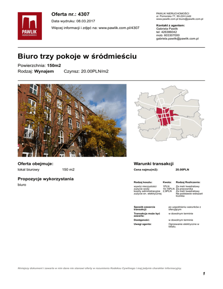 Oferta nr.: 4307 PAWLIK NIERUCHOMOŚCI ul. Pomorska 77, 90-224 Łódź www.pawlik.com.pl [email protected] Data wydruku: 08.03.2017 Więcej informacji i zdjęć na: www.pawlik.com.pl/4307 Kontakt z agentem: Gabriela Pawlik tel: 426386042 mob: 603307000 [email protected] Biuro trzy pokoje w śródmieściu Powierzchnia: 150m2 Rodzaj: Wynajem Czynsz: 20.00PLN/m2 Oferta obejmuje: lokal biurowy Warunki transakcji 150 m2 Propozycje wykorzystania biuro Cena najmu(m2): Rodzaj kosztu: 20.00PLN Kwota: wywóz nieczystości 1PLN zużycie wody 10.15PLN koszty administracyjne 2,9PLN zużycie en. elektrycznej Rodzaj Rozliczenia: Za metr kwadratowy Za pracownika Za metr kwadratowy Na podstawie wskazań licznika Sposób zawarcia transakcji: po uzgodnieniu warunków z oferującym Transakcja może być zawarta: w dowolnym terminie Dostępność: w dowolnym terminie Uwagi agenta: Ogrzewanie elektryczne w lokalu. Niniejszy dokument i zawarte w nim dane nie stanowi oferty w rozumieniu Kodeksu Cywilnego i maj jedynie charakter informacyjny. 1 Oferta nr.: 4307 Więcej informacji i zdjęć na: www.pawlik.com.pl/4307 Opis oferty Ładny budynek biurowy w łódzkim fabrycznym stylu. Lokal składa się z trzech pokoi położonych obok siebie, które można połączyć wewnętrznymi drzwiami. Każdy pokój ma samodzielne wyjście na korytarz. Można wynająć jeden pokój. Toalety w części wspólnej. Dostęp do piętra windą. Ciekawa propozycja w ścisłym centrum miasta. Oferta obejmuje lokal biurowy Klasa obiektu: Powierzchnia: 150 m2 Kondygnacja: IV p z 5 kond. Stan techniczny: bardzo dobry Rodzaje powierzchni użytkowych Kondygnacja Rodzaj powierzchni Powierzchnia Liczba pomieszczeń III p biurowy 50.00 m2 3 Kondygnacja Charakter powierzchni Powierzchnia Podłoga III p biurowy 50.00 m2 Standard Ściana Sufit Okna okna Stan techniczny Budynek Rok budowy Opis techniczny Konstrukcja budynku: Strop: Kondygnacja Rodzaj powierzchni Powierzchnia III p biurowy 50.00 m2 Wysokość Dostęp Wyposażenie Winda osobowa Bezpieczeństwo Parking Monitoring Siatka słupów Strop Ochrona fizyczna P-poż Teleinformatyka Telefon Internet Ogrzewanie/klimatyzacja Ogrzewanie Niniejszy dokument i zawarte w nim dane nie stanowi oferty w rozumieniu Kodeksu Cywilnego i maj jedynie charakter informacyjny. 2 Oferta nr.: 4307 Więcej informacji i zdjęć na: www.pawlik.com.pl/4307 Media Toaleta Położenie wspólna na korytarzu Położenie budynku Centrum Przyłącza elektryczne Rodzaj budynku biurowy Instalacja elektryczna Dostęp do lokalu z korytarza Instalacja siłowa ZDJĘCIA OFERTY Niniejszy dokument i zawarte w nim dane nie stanowi oferty w rozumieniu Kodeksu Cywilnego i maj jedynie charakter informacyjny. 3 Oferta nr.: 4307 Więcej informacji i zdjęć na: www.pawlik.com.pl/4307 Niniejszy dokument i zawarte w nim dane nie stanowi oferty w rozumieniu Kodeksu Cywilnego i maj jedynie charakter informacyjny. 4