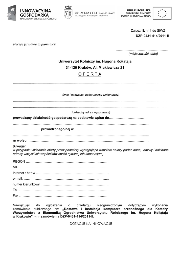 Załącznik nr 1 do SIWZ DZP-0431-414/2011-II pieczęć firmowa wykonawcy ........................................................ (miejscowość, data) Uniwersytet Rolniczy im. Hugona Kołłątaja 31-120 Kraków, Al. Mickiewicza 21 OFERTA ........................................................................................................................................................... ................................................................................................................... …………………….…….. (imię i nazwisko, pełna nazwa wykonawcy) ........................................................................................................................................................... ........................................................................................................................................................... (dokładny adres wykonawcy) prowadzący działalność gospodarczą na podstawie wpisu do……………………………… ……………………………………………………………………………………………………………. ……………………. prowadzonego/nej w ………………………………………………………….. ………………………………………………………………………………………………………….... nr wpisu …………………..……………………………………..........……………………………….. (Uwaga: w przypadku składania oferty przez podmioty występujące wspólnie należy podać dane, nazwy i dokładne adresy wszystkich wspólników spółki cywilnej lub konsorcjum) REGON ………………………………………………………………… NIP ……………………………………………………………………… Internet : http:// ………………………………………………………… e-mail: …………………………………………………………..………. numer kierunkowy: ……………………………………………………. Tel. ……………………………………………………………………… Fax ……………………………………………………………………… Nawiązując do ogłoszenia o przetargu nieograniczonym dotyczącym wykonania zamówienia publicznego pn: „Dostawa i instalacja komputera przenośnego dla Katedry Warzywnictwa z Ekonomiką Ogrodnictwa Uniwersytetu Rolniczego im. Hugona Kołłątaja w Krakowie”, - nr zamówienia DZP-0431-414/2011-II. DOTACJE NA INNOWACJE Producent (nazwa firmy), oraz kraj produkcji oferowanego przedmiotu zamówienia 2 Lp. 1 Cena netto za 1 sztukę [zł] Ilość sztuk Łączna wartość netto [zł] VAT (%) Łączna wartość brutto [zł] 3 4 5 6 7 1. 1 2. Termin realizacji zamówienia: • Komputer przenośny - do 2 tygodni od dnia zawarcia umowy 3. Zobowiązujemy się do udzielenia gwarancji na: - komputer przenośny - …………………. miesięcy, - nośniki - ………………. miesięcy, (minimalna wymagana przez zamawiającego długość okresu gwarancji wynosi: - komputey przenośny – minimum 24 miesiące - nośniki – minimum 6 miesięcy Wszystkie terminy gwarancji będą liczone od daty dostawy i instalacji) 4. Oferowane warunki serwisu: - czas reakcji na zgłoszenie usterki: ………………… godzin, - czas naprawy - nie dłużej niż: ………………..…….. dni robocze, - liczba napraw gwarancyjnych uprawniających do wymiany sprzętu na nowy …..…..…, - lokalizacja serwisu gwarancyjnego – miejscowość: …………….……………………..…., adres……………………………………………………………...tel./faks……………..……., - osoba uprawniona do kontaktu z zamawiającym …………..................………..…………, (imię i nazwisko) (minimalne warunki serwisu wymagane przez zamawiającego - czas reakcji na zgłoszenie usterki – do 3 godzin - czas naprawy usterki – do 14 dni roboczych - liczba napraw uprawniających do wymiany sprzętu na nowy – 3 naprawy) 5. Oświadczamy, że przyjmujemy i dostosujemy się do dodatkowych wymagań związanych z usługami serwisowymi tzn.: a) zobowiązujemy się do zachowania poufności wszelkich danych uzyskanych w trakcie wykonywania czynności serwisowych. b) nie będziemy wykonywać żadnych kopii dysków twardych lub danych cząstkowych w trakcie wykonywania napraw gwarancyjnych sprzętu. c) części wymienione, zużyte pozostające po naprawie, zostaną przekazane do dyspozycji Zamawiającego d) w przypadku awarii dysków twardych zobowiązujemy się do wymiany dysków na wolne od wad. DOTACJE NA INNOWACJE Uszkodzone dyski zostają zwrócone zamawiającego. 6. Oświadczamy, że gwarantujemy sprzęt zastępczy na okres naprawy, jeśli czas jej trwania będzie dłuższy niż 3 dni. 7. Oświadczamy, że oferowany przez nas sprzęt jest nowy, aktualnie produkowany na rynku, o parametrach opisanych w specyfikacji istotnych warunków zamówienia, gwarantujące sprawne działanie. 8. Oświadczamy, że wraz z dostawą sprzętu dostarczymy wymagane prawem deklaracje zgodności CE. 9. Oświadczamy, że do sprzętu zostanie dołączona karta gwarancyjna zgodna z warunkami specyfikacji istotnych warunków zamówienia, która zostanie dostarczona wraz z dostawą sprzętu. 10. Oświadczamy, że wraz z dostawą sprzętu komputerowego zostanie dostarczona instrukcja obsługi sprzętu komputerowego w języku polskim. 11. Oświadczamy, że zapoznaliśmy się ze specyfikacją istotnych warunków zamówienia wraz z załączonymi do niej dokumentami, nie wnosimy do nich zastrzeżeń oraz, że zdobyliśmy konieczne informacje potrzebne do właściwego wykonania zamówienia. 12. Oświadczamy, że uważamy się za związanych niniejszą ofertą przez okres wskazany w warunkach udziału w postępowaniu, tj. 30 dni od upływu terminu składania ofert. 13. Oś