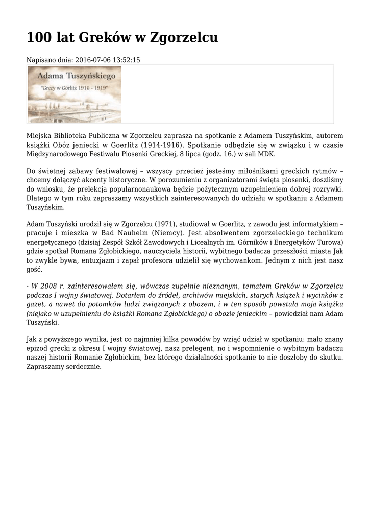 100 lat Greków w Zgorzelcu Napisano dnia: 2016-07-06 13:52:15 Miejska Biblioteka Publiczna w Zgorzelcu zaprasza na spotkanie z Adamem Tuszyńskim, autorem książki Obóz jeniecki w Goerlitz (1914-1916). Spotkanie odbędzie się w związku i w czasie Międzynarodowego Festiwalu Piosenki Greckiej, 8 lipca (godz. 16.) w sali MDK. Do świetnej zabawy festiwalowej – wszyscy przecież jesteśmy miłośnikami greckich rytmów – chcemy dołączyć akcenty historyczne. W porozumieniu z organizatorami święta piosenki, doszliśmy do wniosku, że prelekcja popularnonaukowa będzie pożytecznym uzupełnieniem dobrej rozrywki. Dlatego w tym roku zapraszamy wszystkich zainteresowanych do udziału w spotkaniu z Adamem Tuszyńskim. Adam Tuszyński urodził się w Zgorzelcu (1971), studiował w Goerlitz, z zawodu jest informatykiem – pracuje i mieszka w Bad Nauheim (Niemcy). Jest absolwentem zgorzeleckiego technikum energetycznego (dzisiaj Zespół Szkół Zawodowych i Licealnych im. Górników i Energetyków Turowa) gdzie spotkał Romana Zgłobickiego, nauczyciela historii, wybitnego badacza przeszłości miasta Jak to zwykle bywa, entuzjazm i zapał profesora udzielił się wychowankom. Jednym z nich jest nasz gość. - W 2008 r. zainteresowałem się, wówczas zupełnie nieznanym, tematem Greków w Zgorzelcu podczas I wojny światowej. Dotarłem do źródeł, archiwów miejskich, starych książek i wycinków z gazet, a nawet do potomków ludzi związanych z obozem, i w ten sposób powstała moja książka (niejako w uzupełnieniu do książki Romana Zgłobickiego) o obozie jenieckim – powiedział nam Adam Tuszyński. Jak z powyższego wynika, jest co najmniej kilka powodów by wziąć udział w spotkaniu: mało znany epizod grecki z okresu I wojny światowej, nasz prelegent, no i wspomnienie o wybitnym badaczu naszej historii Romanie Zgłobickim, bez którego działalności spotkanie to nie doszłoby do skutku. Zapraszamy serdecznie. Źródło: Miejska Biblioteka Publiczna w Zgorzelcu