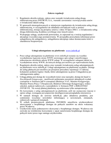 Zakres regulacji 1. Regulamin określa rodzaje, zakres oraz warunki świadczenia usług drogą elektroniczną przez INFOR PL S.A., warunki zawierania i rozwiązywania umów o świadczenie takich usług. 2. W sprawach nieuregulowanych w niniejszym regulaminie do świadczenia usług drogą elektroniczną, w szczególności do składania oświadczeń woli w postaci elektronicznej, stosuje się przepisy ustawy z dnia 18 lipca 2002 r. o świadczeniu usług drogą elektroniczną, Kodeksu cywilnego oraz innych ustaw. 3. Wykupując usługę, użytkownik potwierdza, że zapoznał się z treścią regulaminu i akceptuje wszystkie jego postanowienia. W przypadku przesyłania informacji przez usługobiorcę do usługodawcy, usługobiorca akceptuje zakaz dostarczania treści o charakterze bezprawnym. Usługi udostępniane na platformie www.inforfk.pl 1. Przez usługi udostępniane na platformie www.inforfk.pl rozumie się wszelkie wyodrębnione logicznie strony WWW zawierające opis usługi i umożliwiające jednoznaczne określenie adresu WWW usługi. W szczególności usługami takimi są wyodrębnione strony WWW, do których dostęp jest możliwy po wprowadzeniu hasła. 2. Regulamin określa rodzaj, zakres oraz warunki świadczenia usług udostępnianych na platformie www.inforfk.pl. Usługi udostępniane na platformie są płatne. Dostęp do usług płatnych jest możliwy po przejściu procedury rejestracji i w dalszej kolejności podaniu loginu i hasła, które udostępnione są przez Usługodawcę po zaksięgowaniu opłaty. 3. Usługą płatną jest dostęp do wszystkich treści oraz narzędzi, dostęp do haseł w Encyklopedii księgowego , możliwość pobierania zawartości aktualnych wydań czasopism w formacie pdf 4 czasopism (Biuletyn VAT, Monitor Księgowego, Monitor Prawa Pracy i Ubezpieczeń, Biuletyn Głównego Księgowego), wideoszkoleń, audycji radiowych, e-poradników w formacie PDF z BIBLIOTEKI INFOR FK . Na wersji płatnej platformy są emitowane tylko autopromocje. 4. Do korzystania z usług udostępnianych na platformie, jeśli nie zaznaczono inaczej w opisie usługi, wymagana jest poprawnie skonfigurowana przeglądarka internetowa. 5. W ramach dostępu do serwisu inforfk.pl, jako składowa produktu, jest codziennie wysyłany newsletter informujący o nowościach, zmianach, ciekawych i gorących tematach. 6. W celach promocyjnych platforma INFORFK umożliwia użytkownikowi skorzystanie z bezpłatnego dostępu do pełnych zasobów na okres wskazany przez Wydawcę. 7. Użytkownik może jednorazowo skorzystać z bezpłatnego dostępu. Wydawca nie zezwala na wielokrotne korzystanie z opcji zamówienia bezpłatnego dostępu do pełnych treści przez tego samego użytkownika. Warunki zawierania i rozwiązywania umów o świadczenie usług drogą elektroniczną 1. Okres promocyjny pozwalający na swobodne zapoznanie się z zawartością i funkcjonalnością płatnej wersji platformy następuje po uprzednim wypełnieniu formularza zgłoszeniowego. Obowiązywanie promocyjnego dostępu trwa w okresie ustalonym przez usługodawcę. 2. Prawo do skorzystania z uprawnień określonych w ust. 1 nie przysługuje w przypadku zamówienia dostępu do platformy w innych akcjach promocyjnych, chyba że regulaminy tych akcji mówią inaczej. 3. 4. 5. 6. 7. 8. 9. Usługobiorca może zrezygnować z usługi informując o tym Biuro Obsługi Klienta drogą e-mailową, faksową lub telefoniczną co najmniej na miesiąc przed końcem okresu abonamentowego. Na podany w formularzu adres zostanie wysłana faktura VAT. Usługobiorca po zapoznaniu się z opisem usługi oraz treścią regulaminu wyraża zgodę na udostępnienie przez usługodawcę dostępu do wybranej usługi. Dostęp do płatnej wersji platformy liczony jest od chwili przesłania loginu i hasła przez Biuro Obsługi Klienta na adres e-mail podany w formularzu zamówienia. Wyrażenie zgody na dostęp do zasobów elektronicznych może być przekazane zgodnie z warunkami określonymi przez usługodawcę dla usługi, w szczególności poprzez wysłanie wiadomości e-mail na wskazany adres, wypełnienie formularza zamówienia na stronie internetowej lub poprzez wysłanie odpowiedniej wiadomości przy użyciu innych przewidzianych przez usługodawcę środków porozumiewania się na odległość. Usługobiorca uzyskuje dostęp do płatnych usług po wpisaniu loginu i hasła w oknie logowania na stronie www.inforfk.pl. Tylko zarejestrowany usługobiorca ma prawo korzystania z płatnych zasobów platformy. Przekazanie danych umożliwiających osobom trzecim korzystanie z platformy jest uważane za rażące naruszenie niniejszego regulaminu. Usługodawca zastrzega sobie prawo do zaprzestania świadczenia usługi, w przypadku gdy dane usługobiorcy są nieprawdziwe. Przetwarzanie danych osobowych 1. Administratorem danych osobowych w rozumieniu ustawy z dnia 29 sierpnia 1997 r. o ochronie danych osobowych (tj. Dz.U. z 2002 roku, nr 101, poz. 926 z późn. zm.) jest INFOR PL S.A. Siedzibą spółki jest ul. Okopowa 58/72,01-042 Warszawa. 2. Dane osobowe Usługobiorców i osób odwiedzających serwis będą przetwarzane przez Spółki z Grupy INFOR PL, w celach świadczenia usług, archiwizacji, sprzedaży produktów i usług oferowanych przez Spółki oraz dla potrzeb działań marketingowych podejmowanych samodzielnie lub we współpracy z innymi podmiotami, w szczególności Usługodawca uprawniony jest do przetwarzania danych osobowych Usługobiorcy potrzebnych do nawiązania, ukształtowania treści, zmiany lub rozwiązania umowy o świadczeniu usług przez Usługodawcę oraz w celu realizacji usług, zgodnie z Regulaminem i ustawą z dnia 18 lipca 2002 r. o świadczeniu usług drogą elektroniczną (Dz.U. Nr 144, poz. 1204) , a w przypadku wyrażenia przez Usługobiorcę odrębnej zgody, także w celu wysyłania informacji handlowych drogą elektroniczną. 3. Podanie danych osobowych jest dobrowolne. Odmowa podania danych osobowych może skutkować n