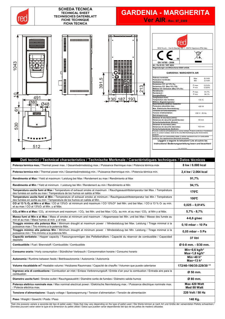 SCHEDA TECNICA GARDENIA - MARGHERITA TECHNICAL SHEET TECHNISCHES DATENBLATT FICHE TECHNIQUE FICHA TECNICA Ver AIR - Rev. 07_2009 MCZ S.p.A. - Via G.Oberdan 86, I - 33074 Vigonovo (PN) Italy. 1043 09 EN 14785 - 2006 Art. 15a B-VG / VKF AEAI Regensburger und Münchener BStV erfüllt. 491 Ø80 Ø48 213 130 187 193 530 61 10 391,5 GARDENIA / MARGHERITA AIR Potenza nominale: Puissance nominale: Heizleistung: Emissione CO (al 13% O2): Emissions CO (Bez.13% O2): Mittlere CO- Emission (Bez.13% O2): Rendimento : Rendement : Energieeffizenz: Temperatura fumi: Température des fumées: Mittlere Abgastemperatur: Assorbimento elettrico massimo: Puissance absorbée max.: Max. Elektrische Nennleistung: Tensione di funzionamento: Tension d'alimentation: Betriebspannung: Distanze di sicurezza (retro): Distances de sécurité (postérieures): Sicherheitsabstände (Hinten): Distanze di sicurezza (lato): Distances de sécurité (laterales): Sicherheitsabstände (Seitlich): Max Min 8,0 kW 2,4 kW P max P min 0,014% 0,025% P max P min 91,7% 94,1% 170 °C 420 W 230 V - 50 Hz. 50 mm 100 mm Prodotto conforme all'installazione in canna multipla. Produit conforme à l'installation dans un conduit multiple. Gerät ist für eine M ehrfachbelegung des Schornsteins geeignet. Utilizzare solo con combustibile adatto. A utiliser seulement avec un combustible conforme. Nur z ugelassennen Brennstoff verwenden. Leggere e seguire le istruzioni! Lire et suivre les instructions! Bedienungsanleitung lesen und beachten! 512 COD : 8900909400 Dati tecnici / Technical characteristics / Technische Merkmale / Caractéristiques techniques / Datos técnicos Potenza termica max./ Thermal power max. / Gesamtwärmeleistug max. / Puissance thermique max / Potencia térmica màx 8 kw / 6.880 kcal Potenza termica min / Thermal power min./ Gesamtwärmeleistug min. / Puissance thernmique min. / Potencia térmica mín. 2,4 kw / 2.064 kcal Rendimento al Max / Yield at maximum / Leistung bei Max / Rendement au max / Rendimiento al Max 91,7% Rendimento al Min / Yield at minimum / Leistung bei Min / Rendement au min / Rendimiento al Min 94,1% Temperatura uscita fumi al Max / Temperature of exhaust smoke at maximum / Rauchgasaustrittstemperatur bei Max. / Température des fumées en sortie au max / Temperatura de los humos en salida al Máx Temperatura uscita fumi al Min / Temperature of exhaust smoke at minimum / Rauchgasaustrittstemperatur bei Min / Température des fumées en sortie au min / Temperatura de los humos en salida al Mín. CO al 13 % O2 al Min e al Max / CO at 13%O² at minimum and maximum / CO 13%O² beil Min. und bei Max. / CO à 13 % O² au min. et au max / CO al 13%O² al Mín. y al Máx. 170°C 100°C 0,025 – 0,014% CO2 al Min e al Max / CO2 at minimum and maximum / CO2 bei Min. und bei Max / CO2 au min. et au max / CO2 al Mín y al Máx. 5,7% - 8,7% Massa fumi al Min e al Max / Mass of smoke at minimum and maximum / Abgasmasse bei Min. und bei Max / Masse des fumée au min et au max / Masa humos al mín. y al máx Tiraggio minimo alla potenza Max / Minimum draught at maximum power / Mindestabzug bei Max. Leistung / Tirage minimal à la puissance max / Tiro mínimo a la potencia Máx. Tiraggio minimo alla potenza Min / Minimum draught at minimum power / Mindestabzug bei Min. Leistung / Tirage minimal à la puissance min / Tiro mínimo a la potencia Mín. Capacità serbatoio / Hopper capacity / Fassungsvermögen des Pelletbehälters / Capacité du réservoir de combustible / Capacidad depósito 4-6,6 g/sec Combustibile / Fuel / Brennstoff / Combustible / Combustible Consumo orario / Horly consumption / Stündlicher Verbrauch / Consommation horaire / Consumo horario Autonomia / Runtime between feeds / Betribsautonomie / Autonomie / Autonomía 3 Volume riscaldabile m / Heatable volume / Heizbares Raummass / Capacité de chauffe / Volumen que puede calentarse 0,10 mbar – 10 Pa 0,05 mbar – 5 Pa 37 litri Ø 6-8 mm. - 5/30 mm. Min~0,6 kg/h* Max~1,8 kg/h* Min~40 h* Max~13 h* 172/40-196/35-229/30 ** Ingresso aria di combustione / Combustion air inlet / Einlass Verbrennungsluft / Entrée d’air pour la combustion / Entrada aire para la combustión Ø 50 mm. Diametro uscita fumi / Smoke outlet / Rauchgasaustritt / Diamètre sortie de fumées / Diàmetro salida humos Ø 80 mm. Potenza elettrica nominale max / Max nominal electrical power / Elektrische Nennleistung max. / Puissance électrique nominale max. / Potecia eléctrica max. Tensione d’alimentazione / Supply voltage / Speisespannung / Tension d’alimentation / Tensión de alimentación Peso / Weight / Gewicht / Poids / Peso Max 420 Watt Med 80 Watt 220 Volt / 50 Hz 140 Kg. *Dati che possono variare a seconda del tipo di pellet usato / Data that may vary depending on the type of pellet used / Die Werte können je nach Art und Größe der verwendeten Pellets schwanken./ Données pouvant varier selon le type et la dimension du pellet utilisé / Datos que pueden variar dependiendo del tipo de las pellas de madera utilizadas