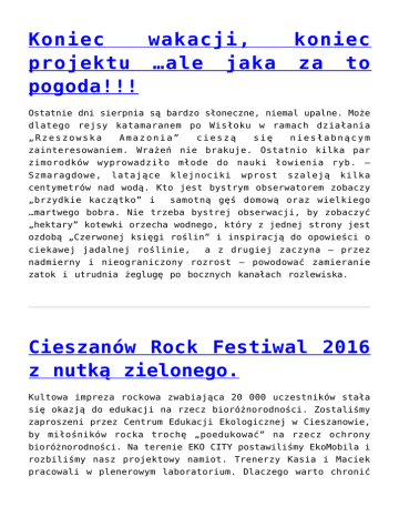 Koniec wakacji, koniec projektu …ale jaka za to pogoda!!! Ostatnie dni sierpnia są bardzo słoneczne, niemal upalne. Może dlatego rejsy katamaranem po Wisłoku w ramach działania „Rzeszowska Amazonia” cieszą się niesłabnącym zainteresowaniem. Wrażeń nie brakuje. Ostatnio kilka par zimorodków wyprowadziło młode do nauki łowienia ryb. – Szmaragdowe, latające klejnociki wprost szaleją kilka centymetrów nad wodą. Kto jest bystrym obserwatorem zobaczy „brzydkie kaczątko” i samotną gęś domową oraz wielkiego …martwego bobra. Nie trzeba bystrej obserwacji, by zobaczyć „hektary” kotewki orzecha wodnego, który z jednej strony jest ozdobą „Czerwonej księgi roślin” i inspiracją do opowieści o ciekawej jadalnej roślinie, a z drugiej zaczyna – przez nadmierny i nieograniczony rozrost – powodować zamieranie zatok i utrudnia żeglugę po bocznych kanałach rozlewiska. Cieszanów Rock Festiwal 2016 z nutką zielonego. Kultowa impreza rockowa zwabiająca 20 000 uczestników stała się okazją do edukacji na rzecz bioróżnorodności. Zostaliśmy zaproszeni przez Centrum Edukacji Ekologicznej w Cieszanowie, by miłośników rocka trochę „poedukować” na rzecz ochrony bioróżnorodności. Na terenie EKO CITY postawiliśmy EkoMobila i rozbiliśmy nasz projektowy namiot. Trenerzy Kasia i Maciek pracowali w plenerowym laboratorium. Dlaczego warto chronić bioróżnorodność? Co pływa w wodzie zalewu obok głównej sceny festiwalowej? Jak wyglądają pod mikroskopem krwiożercze komary? Co nadaje kolor skrzydłom chrząszczy i motyli? Pytań i wyjaśnień było mnóstwo. Nasze stoiska odwiedziły dziesiątki uczestników festiwalu – nie mniej oryginalnych jak nasza ekspozycja. Jak zwykle powodzeniem cieszyły się warsztaty mikroskopowania. Dobrze, że po mocnej dawce muzyki, uczestnicy festiwalu otrzymywali mocną dawkę wrażeń wiedzy „eko”. Tym razem tylko nieco pomagali wolontariusze z EVS – byli mocno zajęci swoimi autorskimi warsztatami. Festiwal gościł trenerów aż z dwu Centrów Edukacji Ekologicznej, bo w dworskim spichlerzu pracowali nasi koledzy, ekolodzy z tarnobrzeskiego Centrum Promocji NATURA 2000 „Dolina Wisły”. Do zobaczenia „za rock”. Zobaczcie galerię zdjęć..>> Zielone światło dla „Wakacyjnej Rzeszowskiej Amazonii” Z satysfakcją zawiadamiamy osoby zainteresowane ochroną przyrody, że Stowarzyszenie „EKOSKOP” otrzymało dotację z Europejskiego Obszaru Gospodarczego na dodatkowe, bezpłatne warsztaty ekologiczne „Rzeszowska Amazonia” projektu „Alarm dla bioróżnorodności Podkarpacia”. Zajęcia w formie rejsów katamaranem po obszarze ochrony NATURA 2000 na Wisłoku trwać będą do 30 sierpnia 2016 roku, do wyczerpania się dotacji. Liczba miejsc będzie ograniczona. Każdy warsztat prowadzony przez naszego trenera trwa ok. 45minut. Pierwszeństwo zapisów mają rodziny z dziećmi oraz opiekunowie z grupami dzieci. O udziale w warsztatach decyduje kolejność imiennych zapisów na listę uczestników pod tel. 577 116 959 – od poniedziałku do piątku w godz. 8.00 -11.00 Rejsy planujemy wyłącznie przy bezdeszczowej pogodzie (z wyłączeniem niedziel). Każdy rejs będzie rozpoczynał się z przystani obok rezerwatu „Lisia Góra”, w ustalone dni o godz. 10.00, 10.50, 11.40 i 12.30. W jednym rejsie może wziąć udział nie więcej niż 11 osób. Zbiórka uczestników każdego rejsu, na kei katamaranu, 5 minut przed ustaloną godziną wypłynięcia. „Wakacyjna Amazonia” Rzeszowska Niestety. Rezerwacje na wakacyjne rejsy katamaranem w ramach projektu „Alarm dla bioróżnorodności Podkarpacia” zostały wyczerpane! Zabiegamy o nową dotację do warsztatów „Rzeszowska Amazonia”, ale czy dostaniemy pieniądze ….będzie wiadomo dopiero po 10 sierpnia 2016r. Drodzy miłośnicy boróżnorodności! Przyjaciele projektu „Alarm dla bioróżnorodności Podkarpacia”. Przyjaciele projektu „Alarm dla bioróżnorodności Podkarpacia”. Zapraszamy Was na „Wakacyjną Rzeszowską Amazonię”- jedne z ostatnich zajęć projektu „Alarm dla bioróżnorodności Podkarpacia” w formie bezpłatnych rejsów katamaranem po obszarze ochrony NATURA 2000 na zalewie na Wisłoku. Proponujemy 45-minut na rzece, z lornetkami w rękach i pod opieką naszego trenera. Rejsy planujemy wyłącznie przy bezdeszczowej pogodzie w dniach od 25.VII do 12 VIII 2016 roku (z wyłączeniem niedziel). Każdy rejs będzie rozpoczynał się z przystani obok rezerwatu „Lisia Góra”. W ustalone dni o godz. 10.00, 10.50, 11.40 i 12.30. W jednym rejsie może wziąć udział nie więcej niż 11 osób. Zbiórka uczestników każdego rejsu, na kei katamaranu, 5 minut przed ustaloną godziną wypłynięcia. UWAGA – o udziale w każdym rejsie decyduje kolejność zapisania się na listę uczestników warsztatów, pod tel. 577 116 959 od poniedziałku do piątku w godz. 10.00-13.00. pozdrawiam Mirek Ruszała