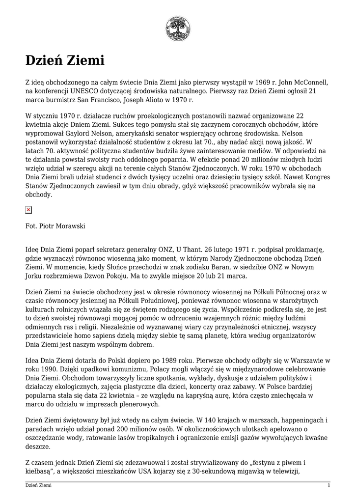 Dzień Ziemi Z ideą obchodzonego na całym świecie Dnia Ziemi jako pierwszy wystąpił w 1969 r. John McConnell, na konferencji UNESCO dotyczącej środowiska naturalnego. Pierwszy raz Dzień Ziemi ogłosił 21 marca burmistrz San Francisco, Joseph Alioto w 1970 r. W styczniu 1970 r. działacze ruchów proekologicznych postanowili nazwać organizowane 22 kwietnia akcje Dniem Ziemi. Sukces tego pomysłu stał się zaczynem corocznych obchodów, które wypromował Gaylord Nelson, amerykański senator wspierający ochronę środowiska. Nelson postanowił wykorzystać działalność studentów z okresu lat 70., aby nadać akcji nową jakość. W latach 70. aktywność polityczna studentów budziła żywe zainteresowanie mediów. W odpowiedzi na te działania powstał swoisty ruch oddolnego poparcia. W efekcie ponad 20 milionów młodych ludzi wzięło udział w szeregu akcji na terenie całych Stanów Zjednoczonych. W roku 1970 w obchodach Dnia Ziemi brali udział studenci z dwóch tysięcy uczelni oraz dziesięciu tysięcy szkół. Nawet Kongres Stanów Zjednoczonych zawiesił w tym dniu obrady, gdyż większość pracowników wybrała się na obchody. Fot. Piotr Morawski Ideę Dnia Ziemi poparł sekretarz generalny ONZ, U Thant. 26 lutego 1971 r. podpisał proklamację, gdzie wyznaczył równonoc wiosenną jako moment, w którym Narody Zjednoczone obchodzą Dzień Ziemi. W momencie, kiedy Słońce przechodzi w znak zodiaku Baran, w siedzibie ONZ w Nowym Jorku rozbrzmiewa Dzwon Pokoju. Ma to zwykle miejsce 20 lub 21 marca. Dzień Ziemi na świecie obchodzony jest w okresie równonocy wiosennej na Półkuli Północnej oraz w czasie równonocy jesiennej na Półkuli Południowej, ponieważ równonoc wiosenna w starożytnych kulturach rolniczych wiązała się ze świętem rodzącego się życia. Współcześnie podkreśla się, że jest to dzień swoistej równowagi mogącej pomóc w odrzuceniu wzajemnych różnic między ludźmi odmiennych ras i religii. Niezależnie od wyznawanej wiary czy przynależności etnicznej, wszyscy przedstawiciele homo sapiens dzielą między siebie tę samą planetę, która według organizatorów Dnia Ziemi jest naszym wspólnym dobrem. Idea Dnia Ziemi dotarła do Polski dopiero po 1989 roku. Pierwsze obchody odbyły się w Warszawie w roku 1990. Dzięki upadkowi komunizmu, Polacy mogli włączyć się w międzynarodowe celebrowanie Dnia Ziemi. Obchodom towarzyszyły liczne spotkania, wykłady, dyskusje z udziałem polityków i działaczy ekologicznych, zajęcia plastyczne dla dzieci, koncerty oraz zabawy. W Polsce bardziej popularna stała się data 22 kwietnia – ze względu na kapryśną aurę, która często zniechęcała w marcu do udziału w imprezach plenerowych. Dzień Ziemi świętowany był już wtedy na całym świecie. W 140 krajach w marszach, happeningach i paradach wzięło udział ponad 200 milionów osób. W okolicznościowych ulotkach apelowano o oszczędzanie wody, ratowanie lasów tropikalnych i ograniczenie emisji gazów wywołujących kwaśne deszcze. Z czasem jednak Dzień Ziemi się zdezawuował i został strywializowany do „festynu z piwem i kiełbasą”, a większości mieszkańców USA kojarzy się z 30-sekundową migawką w telewizji, Dzień Ziemi 1 pokazującą dzieci zbierające śmieci lub sadzące drzewka. Największy kryzys w ruchu ekologicznym w USA dał się zauważyć po hucznie obchodzonym Dniu Ziemi w 1990 roku. Impreza ta wzbudziła dobre samopoczucie społeczeństwa, jednak jej „treść” składała się z bardzo ogólnikowych haseł i działań. W dodatku wielu sponsorów i uczestników kompromitowało ruch ekologiczny w oczach bardziej wymagających odbiorców. Innym przykładem rozmienienia idei na drobne były obchody 30-rocznicy pierwszego Dnia Ziemi, zorganizowane w roku 2000 w USA. Wybrano na rzecznika akcji aktora Leonardo DiCaprio, który swoją męskość lubi podkreślać ogromnym samochodem terenowym. W 1999 r. podczas kręcenia filmu „Plaża” na terenie parku narodowego w Tajlandii, stał się wraz z ekipą filmową celem protestów miejscowych działaczy ekologicznych. W Polsce Dzień Ziemi to głównie ogromny festyn na Polach Mokotowskich w Warszawie, targowisko różności i próżności, gdzie można kupić „ekologiczne” piwo i „ekologiczną” kiełbasę, zobaczyć pokazy Tai Chi oraz „ekologiczne” pralki i lodówki. To okazja także dla kolejnego ministra środowiska, żeby „zbratać się z ludem”. Dzień Ziemi służy głównie propagowaniu pseudoekologicznych wartości i spraw – są to w większości tematy zastępcze, nie dotykające ważnych problemów ochrony przyrody. Ale takie właśnie są atrakcyjne dla mediów i sponsorów, nie zagrażają niczyim interesom, łatwo zyskują sponsorów i poparcie ze strony decydentów. Niektórzy uważają, że festyn ten to możliwość propagowania działań na rzecz ochrony środowiska i przyrody. Ale czy rzeczywiście? Z dziesiątków tysięcy osób przewijających się tego dnia przez warszawskie Pola Mokotowskie, może kilka interesuje się ochroną środowiska, z reguły już uświadomionych. Dla znakomitej większości to tylko festyn, na którym można zjeść, napić się piwa, posłuchać muzyki z ekologią w tle. W Bielsku-Białej natomiast doszło do swoistego kuriozum, bowiem na tutejszym Dniu Ziemi mocno reklamowali się organizatorzy przejażdżek quadami. Z pojazdami tymi jest duży problem w górach, ponieważ stanowią zagrożenie dla życia i zdrowia ludzi oraz przyrody, szczególnie w sezonie lęgowym. W wydanej przez Pracownię w 1995 r. książce „W obronie ziemi” Janusz Korbel i Marta Lelek pisali „festiwale i »dni Ziemi« – jeśli nie są dedykowane konkretnym sprawom i miejscom – służą najczęściej płytkiej ekologii i przynoszą więcej strat niż pożytku przyrodzie”. Zdanie to nie straciło nic z aktualności, co widać szczególnie na Polach Mokotowskich na następny dzień po Dniu Zie