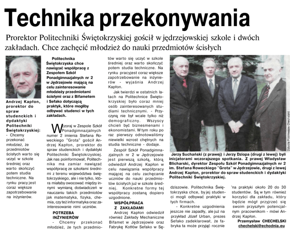 Technika przekonywania Prorektor Politechniki Świętokrzyskiej gościł w jędrzejowskiej szkole i dwóch zakładach. Chce zachęcić młodzież do nauki przedmiotów ścisłych Andrzej Kapłon, prorektor do spraw studenckich i dydaktyki Politechniki Świętokrzyskiej: - Chcemy przekonać młodzież, że przedmiotów ścisłych warto się uczyć w szkole średniej oraz warto skończyć potem studia techniczne. Na rynku pracy jest coraz większe zapotrzebowanie na inżynierów. Politechnika Świętokrzyska chce nawiązać współpracę z Zespołem Szkół Ponadgimnazjalnych nr 2 w Jędrzejowie mającą na celu zainteresowanie młodzieży przedmiotami ścisłymi oraz z Bifametem i Sefako dotyczącą praktyk, które mogliby odbywać studenci w tych zakładach. czoraj w Zespole Szkół Ponadgimnazjalnych numer 2 imienia Stefana Ro weckiego "Grota" gościł An drzej Kapłon, prorektor do spraw studenckich i dydaktyki Politechniki Świętokrzyskiej. Jak nas poinformował, Politechnika ma zamiar nawiązać współpracę ze szkołami średni mi z terenu województwa świę tokrzyskiego, ale i nie tylko, któ ra miałaby owocować między in nymi wymianą doświadczeń w nauczaniu takich przedmiotów jak matematyka, fizyka, che mia, czy też informatyka oraz za interesowanie nimi uczniów. W POTRZEBA INŻYNIERÓW - Chcemy przekonać młodzież, że tych przedmio tów warto się uczyć w szkole średniej oraz warto skończyć potem studia techniczne. Na rynku pracyjest coraz większe zapotrzebowanie na inżynie rów - w y j a ś n i a A n d r z e j Kapłon. Jak twierdzi w ostatnich la tach na Politechnice Święto krzyskiej było coraz mniej osób zainteresowanych stu diami technicznymi. - Przy czyną nie był wcale tylko niż demograficzny. Wszyscy chcieli być biznesmenami i ekonomistami. W tym roku po raz pierwszy odnotowaliśmy niewielki wzrost chętnych na studia techniczne - dodaje. Zespół Szkół Ponadgimna zjalnych nr 2 w Jędrzejowie j e s t pierwszą szkołą, którą odwiedził Andrzej Kapłon w celu nawiązania współpracy mającej na celu zachęcanie uczniów do nauki przedmio tów ścisłych już w szkole średniej. Konkretne formy t e j współpracy zostaną dopiero uzgodnione. WSPÓŁPRACA Z ZAKŁADAMI Andrzej Kapłon odwiedził również Zakłady Mechaniczne Bifamet w Jędrzejowie oraz Fabrykę Kotłów Sefako w Sę- Jerzy Suchański (z prawej) i Jerzy Dziopa (drugi z lewej) byli inicjatorami wczorajszego spotkania. Z prawej Władysław Blicharski, dyrektor Zespołu Szkół Ponadgimnazjalnych nr 2 im. Stefana Roweckiego "Grota" w Jędrzejowie, drugi z lewej Andrzej Kapłon, prorektor do spraw studenckich i dydaktyki Politechniki Świętokrzyskiej. dziszowie. Politechnika Świętokrzyska chce, by jej studenci mogli odbywać praktyki w tych firmach. - Konkretne uzgodnienia jeszcze nie zapadły, ale już na przykład Józef Urban, prezes Sefako zadeklarował, że fabryka ta może przyjąć rocznie 'na praktyki około 20 do 30 studentów. Są w tym również korzyści dla zakładu, który będzie mógł przyjrzeć się swoim przyszłym potencjalnym pracownikom - mówi Andrzej Kapłon. Przemysław CHECHELSKI [email protected]