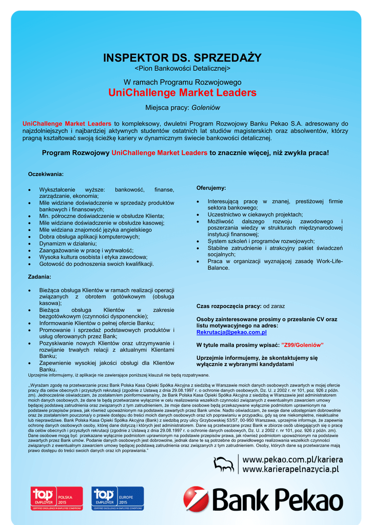 INSPEKTOR DS. SPRZEDAŻY <Pion Bankowości Detalicznej> W ramach Programu Rozwojowego UniChallenge Market Leaders Miejsca pracy: Goleniów UniChallenge Market Leaders to kompleksowy, dwuletni Program Rozwojowy Banku Pekao S.A. adresowany do najzdolniejszych i najbardziej aktywnych studentów ostatnich lat studiów magisterskich oraz absolwentów, którzy pragną kształtować swoją ścieżkę kariery w dynamicznym świecie bankowości detalicznej. Program Rozwojowy UniChallenge Market Leaders to znacznie więcej, niż zwykła praca! Oczekiwania: Wykształcenie wyższe: bankowość, finanse, zarządzanie, ekonomia; Mile widziane doświadczenie w sprzedaży produktów bankowych i finansowych; Min. półroczne doświadczenie w obsłudze Klienta; Mile widziane doświadczenie w obsłudze kasowej; Mile widziana znajomość języka angielskiego Dobra obsługa aplikacji komputerowych; Dynamizm w działaniu; Zaangażowanie w pracę i wytrwałość; Wysoka kultura osobista i etyka zawodowa; Gotowość do podnoszenia swoich kwalifikacji. Oferujemy: Interesującą pracę w znanej, prestiżowej firmie sektora bankowego; Uczestnictwo w ciekawych projektach; Możliwość dalszego rozwoju zawodowego i poszerzania wiedzy w strukturach międzynarodowej instytucji finansowej; System szkoleń i programów rozwojowych; Stabilne zatrudnienie i atrakcyjny pakiet świadczeń socjalnych; Praca w organizacji wyznającej zasadę Work-LifeBalance. Zadania: Bieżąca obsługa Klientów w ramach realizacji operacji związanych z obrotem gotówkowym (obsługa kasowa); Bieżąca obsługa Klientów w zakresie bezgotówkowym (czynności dysponenckie); Informowanie Klientów o pełnej ofercie Banku; Promowanie i sprzedaż podstawowych produktów i usług oferowanych przez Bank; Pozyskiwanie nowych Klientów oraz utrzymywanie i rozwijanie trwałych relacji z aktualnymi Klientami Banku; Zapewnienie wysokiej jakości obsługi dla Klientów Banku. Czas rozpoczęcia pracy: od zaraz Osoby zainteresowane prosimy o przesłanie CV oraz listu motywacyjnego na adres: [email protected] W tytule maila prosimy wpisać: ”Z99/Goleniów” Uprzejmie informujemy, że skontaktujemy się wyłącznie z wybranymi kandydatami Uprzejmie informujemy, iż aplikacje nie zawierające poniższej klauzuli nie będą rozpatrywane. ,,Wyrażam zgodę na przetwarzanie przez Bank Polska Kasa Opieki Spółka Akcyjna z siedzibą w Warszawie moich danych osobowych zawartych w mojej ofercie pracy dla celów obecnych i przyszłych rekrutacji (zgodnie z Ustawą z dnia 29.08.1997 r. o ochronie danych osobowych, Dz. U. z 2002 r. nr 101, poz. 926 z późn. zm). Jednocześnie oświadczam, że zostałam/em poinformowana/ny, że Bank Polska Kasa Opieki Spółka Akcyjna z siedzibą w Warszawie jest administratorem moich danych osobowych, że dane te będą przetwarzane wyłącznie w celu realizowania wszelkich czynności związanych z ewentualnym zawarciem umowy będącej podstawą zatrudnienia oraz związanych z tym zatrudnieniem, że moje dane osobowe będą przekazywane wyłącznie podmiotom uprawnionym na podstawie przepisów prawa, jak również upoważnionym na podstawie zawartych przez Bank umów. Nadto oświadczam, że swoje dane udostępniam dobrowolnie oraz że zostałam/em pouczona/y o prawie dostępu do treści moich danych osobowych oraz ich poprawianiu w przypadku, gdy są one niekompletne, nieaktualne lub nieprawdziwe. Bank Polska Kasa Opieki Spółka Akcyjna (Bank) z siedzibą przy ulicy Grzybowskiej 53/57, 00-950 Warszawa, uprzejmie informuje, że zapewnia ochronę danych osobowych osoby, której dane dotyczą i których jest administratorem. Dane są przetwarzane przez Bank w zbiorze osób ubiegających się o pracę dla celów obecnych i przyszłych rekrutacji (zgodnie z Ustawą z dnia 29.08.1997 r. o ochronie danych osobowych, Dz. U. z 2002 r. nr 101, poz. 926 z późn. zm). Dane osobowe mogą być przekazane wyłącznie podmiotom uprawnionym na podstawie przepisów prawa, jak również podmiotom upoważnionym na podstawie zawartych przez Bank umów. Podanie danych osobowych jest dobrowolne, jednak dane te są potrzebne do prawidłowego realizowania wszelkich czynności związanych z ewentualnym zawarciem umowy będącej podstawą zatrudnienia oraz związanych z tym zatrudnieniem. Osoby, których dane są przetwarzane mają prawo dostępu do treści swoich danych oraz ich poprawiania.”