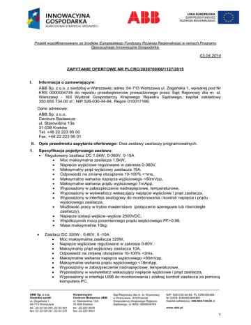 Projekt współfinansowany ze środków Europejskiego Funduszu Rozwoju Regionalnego w ramach Programu Operacyjnego Innowacyjna Gospodarka. 03.04.2014 ZAPYTANIE OFERTOWE NR PLCRC/2830700/06/1127/2015 I. Informacja o zamawiającym: ABB Sp. z o.o. z siedzibą w Warszawie; adres: 04-713 Warszawa ul. Żegańska 1, wpisanej pod Nr KRS 0000004745 do rejestru przedsiębiorców prowadzonego przez Sąd Rejonowy dla m. st. Warszawy - XIII Wydział Gospodarczy Krajowego Rejestru Sądowego, kapitał zakładowy 350.655.734,00 zł ; NIP 526-030-44-84, Regon 010017168, Dane adresowe: ABB Sp. z o.o. Centrum Badawcze ul. Starowiślna 13a 31-038 Kraków Tel. +48 22 223 95 00 Fax. +48 22 223 95 01 II. Opis przedmiotu zapytania ofertowego: Dwa zestawy zasilaczy programowalnych. 1. Specyfikacja pojedynczego zestawu: · Regulowany zasilacz DC 1.5kW, 0-360V, 0-15A · Moc maksymalna zasilacza 1.5kW, · Napięcie wyjściowe regulowane w zakresie 0-360V, · Maksymalny prąd wyjściowy zasilacza 15A, · Odpowiedź na zmianę obciążenia 10-100% <1ms, · Maksymalne wahania napięcia wyjściowego <50mVpp, · Maksymalne wahania prądu wyjściowego 1mApp, · Wyposażony w zabezpieczenie nadnapięciowe, temperaturowe, · Wyposażony w wyświetlacz wskazujący napięcie wyjściowe i prąd zasilacza, · Wyposażony w interfejs analogowy do monitorowania i kontroli napięcia i prądu wyjściowego zasilacza, · Możliwość pracy w trybie master/slave (połączenie szeregowe lub równoległe zasilaczy), · Napięcie izolacji wejście–wyjście 2500VDC, · Współczynnik mocy przemiennego prądu wejściowego PF>0.99, · Masa maksymalnie 10kg; · Zasilacz DC 320W , 0-80V, 0 -10A · Moc maksymalna zasilacza 320W, · Napięcie wyjściowe regulowane w zakresie 0-80V, · Maksymalny prąd wyjściowy zasilacza 10A, · Odpowiedź na zmianę obciążenia 10-100% <2ms, · Maksymalne wahania napięcia wyjściowego <60mVpp, · Maksymalne wahania prądu wyjściowego <18mApp, · Wyposażony w zabezpieczenie nadnapięciowe, temperaturowe, · Wyposażony w wyświetlacz wskazujący napięcie wyjściowe i prąd zasilacza, · Wyposażony w interfejs USB do monitorowania i zdalnej kontroli zasilacza za pomocą komputera PC, ABB Sp. z o.o. Siedziba spółki ul. Żegańska 1 04-713 Warszawa tel.: 22 22 02 000, 22 02 001 fax: 22 22 02 031, 22 02 231 Korporacyjne Centrum Badawcze ABB ul. Starowiślna 13A 31-038 Kraków tel.: 22 223 9500 fax: 22 223 9501 Sąd Rejonowy dla m. st. Warszawy w Warszawie, XIII Wydział Gospodarczy Krajowego Rejestru Sądowego, nr KRS: 0000004745 NIP: 526-030-44-84, PL 5260304484 Nr GIOŚ: E0008536WBW Kapitał zakładowy: 350.655.734,00 zł www.abb.pl 1 · · · Napięcie izolacji wejście–wyjście 2500VDC, Współczynnik mocy przemiennego prądu wejściowego PF>0.99, Masa maksymalnie 3kg. 2. Zamawiający nie dopuszcza składania ofert na urządzenia używane. 3. Zamawiający nie dopuszcza składania ofert częściowych 4. Ofertę może złożyć osoba fizyczna prowadząca działalność gospodarczą zarejestrowaną w CEiDG lub osoba prawna. Zamawiający wyklucza składanie oferty przez konsorcjum, holding lub grupę podmiotów gospodarczych niebędących osobą prawną. 5. Oferta powinna zawierać: · Nazwę i adres oferenta, · Datę sporządzenia. · Cenę jednostkową netto, · Termin dostawy, · Okres ważności oferty, · Koszt transportu, · Termin płatności – preferowany termin płatności to pierwsza środa po 60 dniach od daty otrzymania faktury jednak nie krótszy niż pierwsza środa po upływie 30 dni od daty wystawienia faktury. 6. Kupujący ma prawo odrzucić ofertę, jeśli: · · · · 7. Oferta zostanie złożona po terminie, Treść oferty jest niezgoda z zapytaniem ofertowym, Oferta zawiera rażąco niską cenę, Z innych przyczyn. Okres ważności oferty: Oferta powinna być ważna minimum do 30.04.2015. 8. Sposób przygotowania / wysłania ofert: Oferty proszę przesłać na adres: [email protected]. 9. Termin przesłania oferty wstępnej: 13.04.2015 (włącznie) 10. Termin przesłania oferty ostatecznej (po negocjacjach): 15.04.2015 (włącznie) 11. Przebieg postępowania: Wyłonienie najkorzystniejszej oferty nastąpi dwuetapowo. W pierwszym etapie dokonana zostanie ocena ofert wstępnych pod kątem przedstawionych kryteriów wyboru (paragraf 12). Do drugiego etapu wyboru (uzupełnień/ negocjacji) przejdzie trzech oferentów, którzy uzyskają największą liczbę punktów w ramach kryteriów. W przypadku, gdy oferty złoży mniej niż trzech oferentów, negocjacje zostaną przeprowadzone ze wszystkimi oferentami. Kryteria wyboru w obu etapach pozostają te same. 12. Kryteria oceny oferty: · Najniższa cena – 100% 13. Informacje dotyczące wyboru najkorzystniejszej oferty: O wyborze najkorzystniejszej oferty Zamawiający poinformuje Oferentów drogą mailową. ABB Sp. z o.o. Siedziba spółki ul. Żegańska 1 04-713 Warszawa tel.: 22 22 02 000, 22 02 001 fax: 22 22 02 031, 22 02 231 Korporacyjne Centrum Badawcze ABB ul. Starowiślna 13A 31-038 Kraków tel.: 22 223 9500 fax: 22 223 9501 Sąd Rejonowy dla m. st. Warszawy w Warszawie, XIII Wydział Gospodarczy Krajowego Rejestru Sądowego, nr KRS: 0000004745 NIP: 526-030-44-84, PL 5260304484 Nr GIOŚ: E0008536WBW Kapitał zakładowy: 350.655.734,00 zł www.abb.pl 2 14. Osoba kontaktowa: Dodatkowych informacji technicznych udziela Krzysztof Kóska pod adresem mailowym: [email protected]. 15. Wykonanie przedmiotu umowy nastąpi w przyjętej formie ryczałtowego rozliczenia wynagrodzenia. 16. Zamawiający zastrzega sobie prawo do zmiany treści zapytania ofertowego, nie później niż do terminu upływu złożenia oferty wstępnej. III. Wymagania dla Dostawcy: O udzielenie zamówienia mogą ubiegać się dostawcy/wykonawcy, którzy: · Posiadają uprawnienia, niezbędną wiedzę i doświadczenie oraz potencjał techniczny, a także dysponują osobami zdolnymi do wykonania zamówienia i jego odpowiedniego nadzorowania, · Znajdują się w sytu